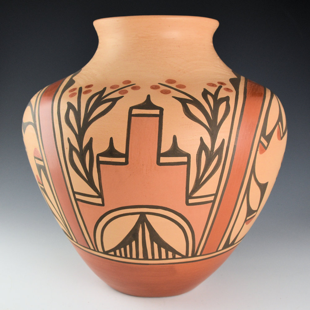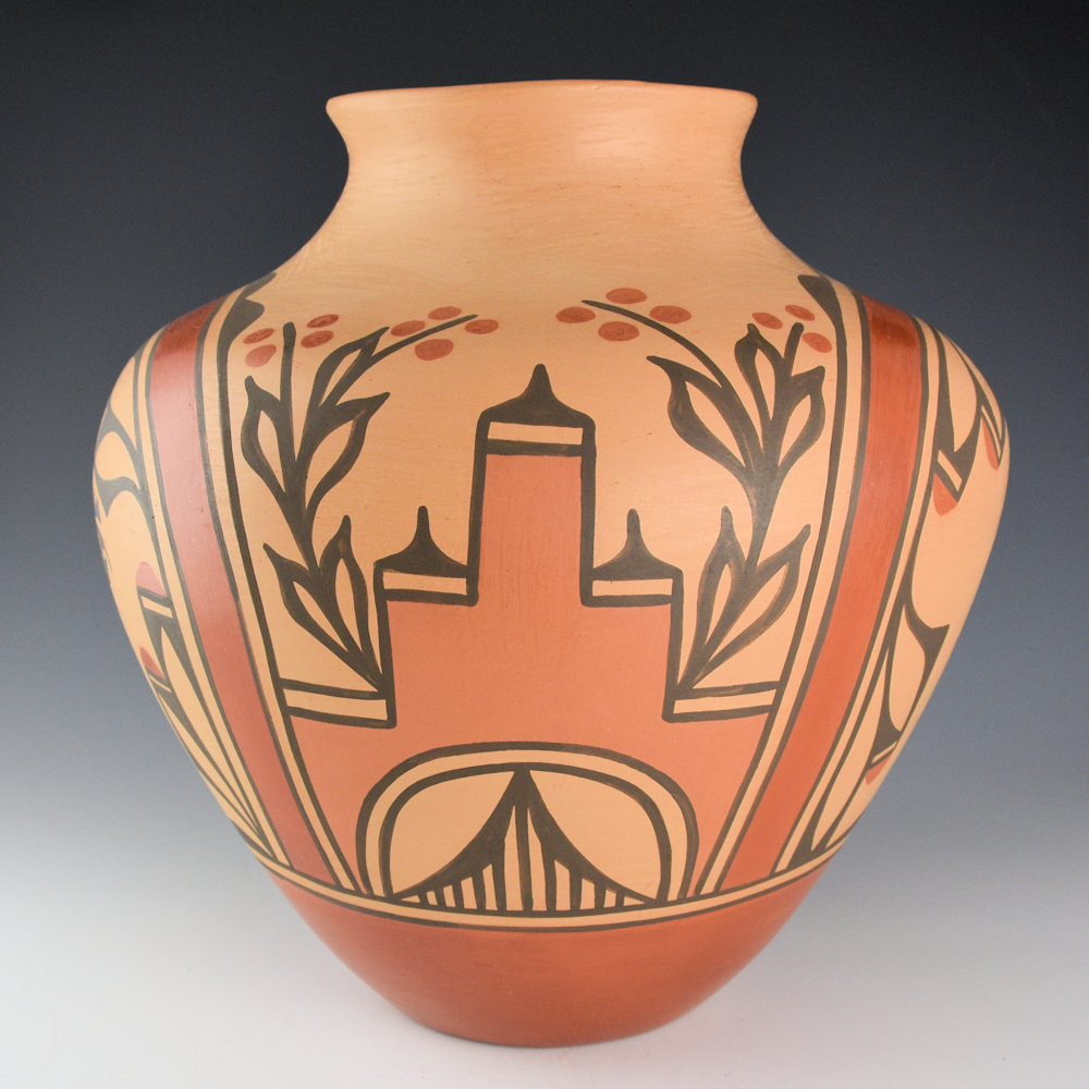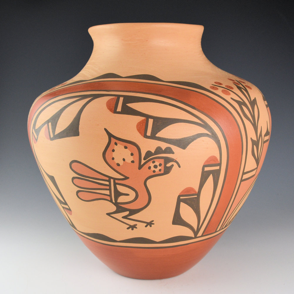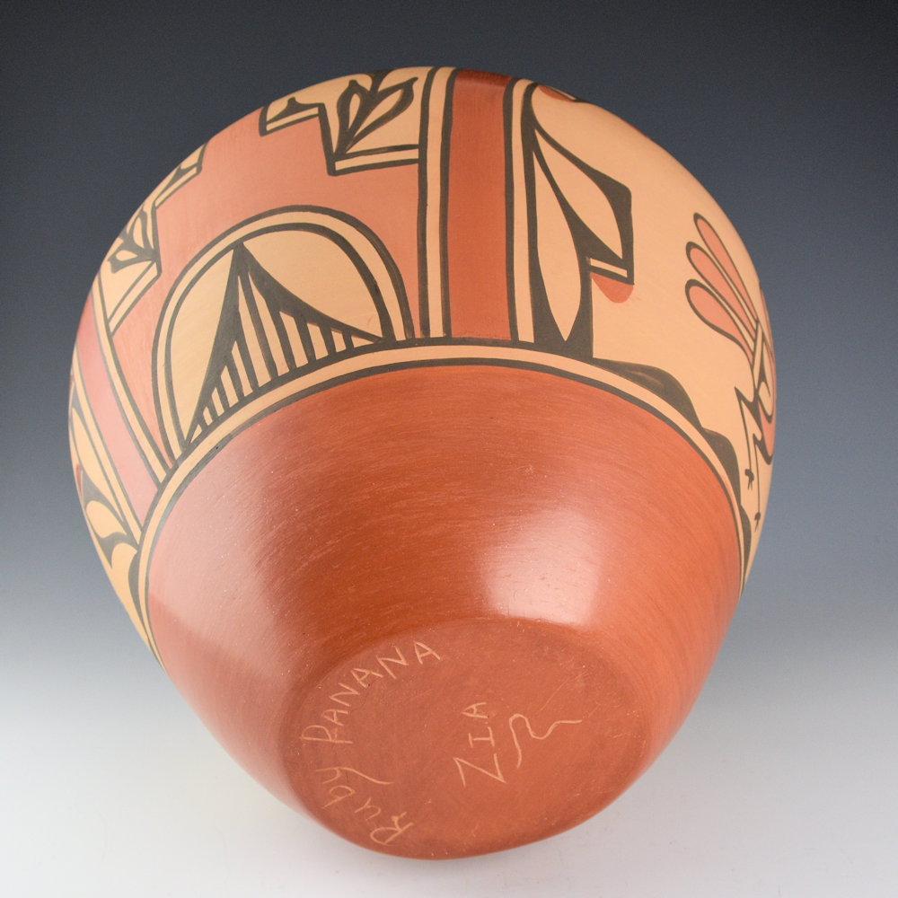 Ruby Panana began making pottery in 1983. She is a granddaughter of Joe and Ascenicona Galvan Pino and a daughter of Seferina Bell. Her sisters Eleanor Griego and Reyes Pino are also potters. This large jar is coil-built and has a high shoulder and a turned out rim. The base of the jar is polished red. The piece is painted with parrots on each side, under a red polished rainbow. Separating them are traditional Zia cloud and rain designs. It is a striking and complicated piece on a traditional shape. It is signed on the bottom, “Ruby Panana”. It is in excellent condition with no chips, cracks, restoration or repair.