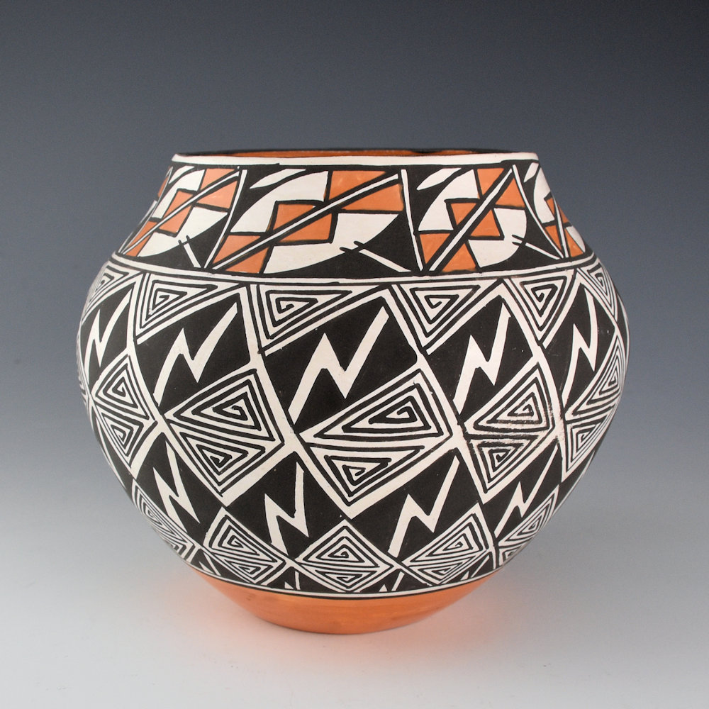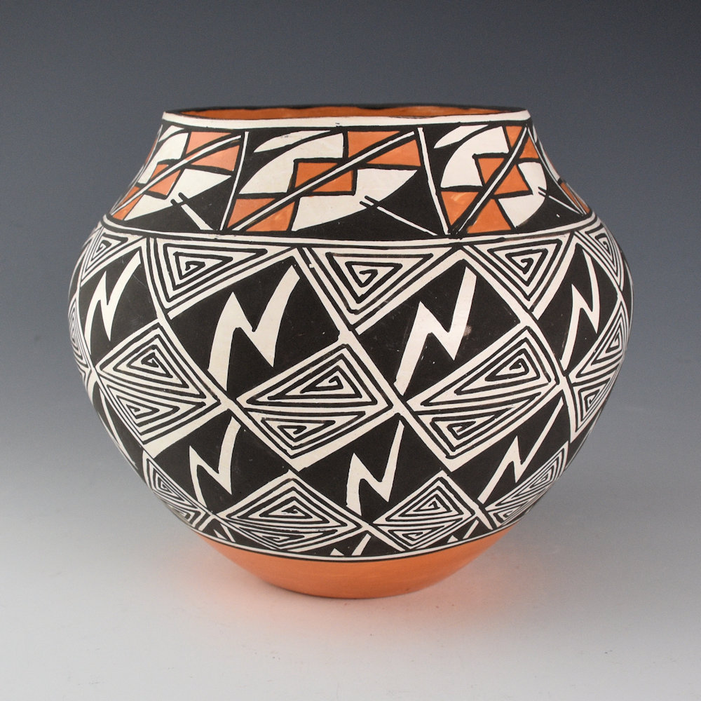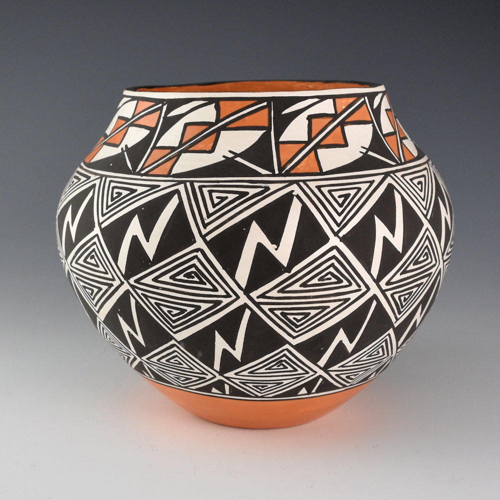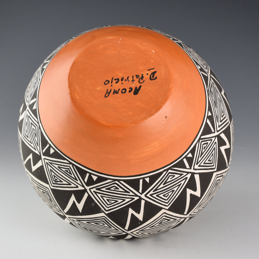 Doris Patricio was the matriarch of a family of exceptional potters, including Robert Patrico. Each piece is coil-built and painted with bee-weed (black) and clay slips. This is a classic Acoma-shaped water jar with a round shoulder and short neck. The jar is one of the larger pieces of her work we have had come back to the gallery. The neck has a rain and sunset design. The body of the jar has lighting and rain designs. It is a complex and striking piece. There is an elegant flow of lines and open space to create her imagery. It is signed “D. Patricio”. It is in excellent condition with no chips, cracks, restoration, or repair.