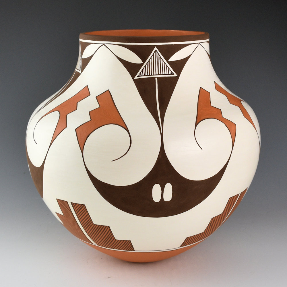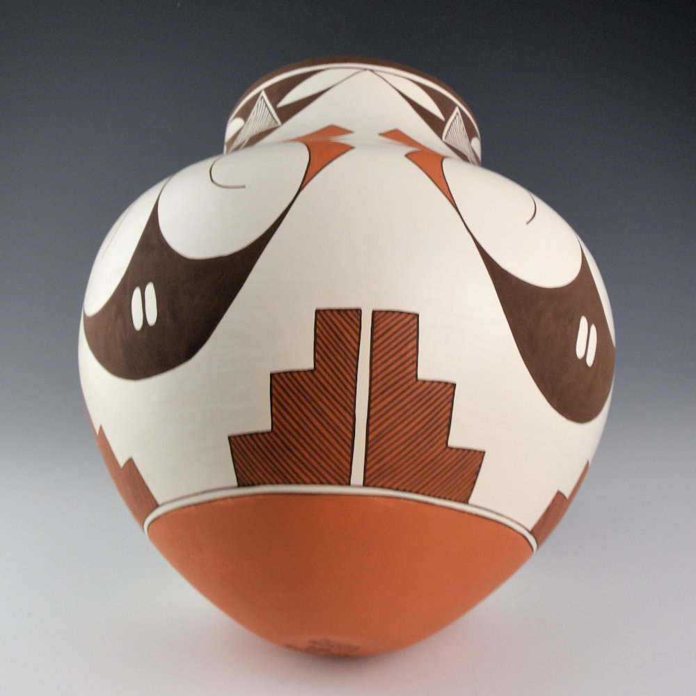 Felisha Patricio (b. 1997) is a daughter of noted potter Robert Patricio. This jar is coil built from native clay and painted with bee-weed and clay slips. The jar has four sets of rainbirds painted on the shoulder. Below them are cloud and rain designs and there are additional rain designs at the neck of the jar. The bold designs are accented with her fine-line additions. It is a striking design that emphasizes the shape of the jar. The base of the jar is also slipped in red clay. It is signed, “F. Patricio”.