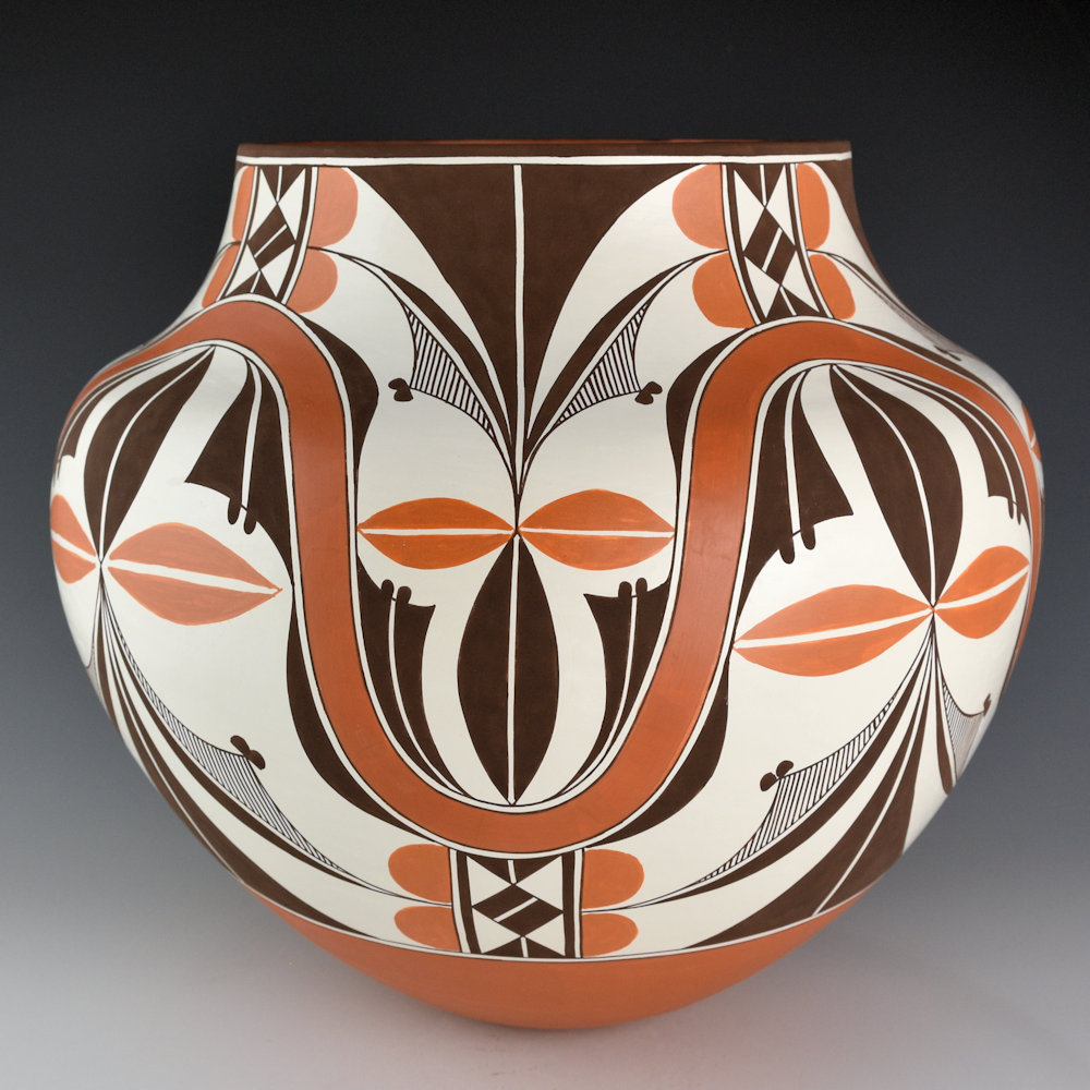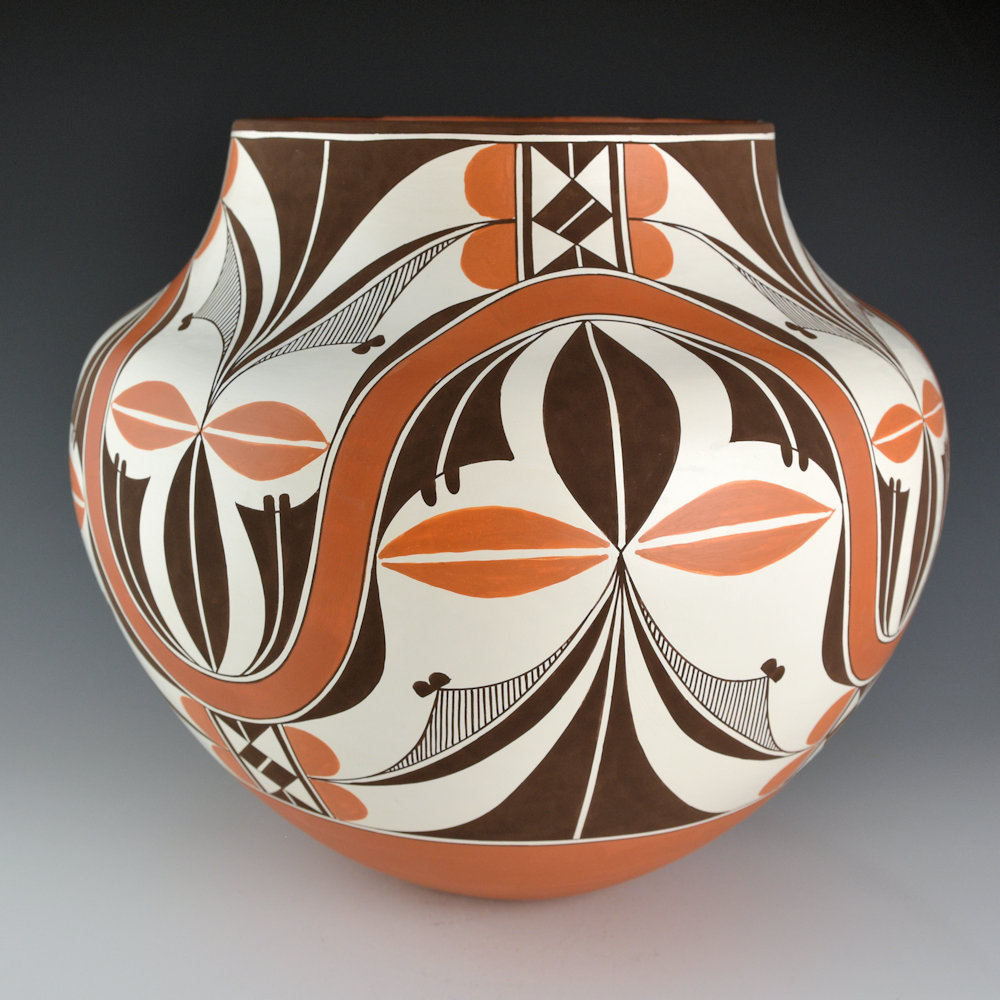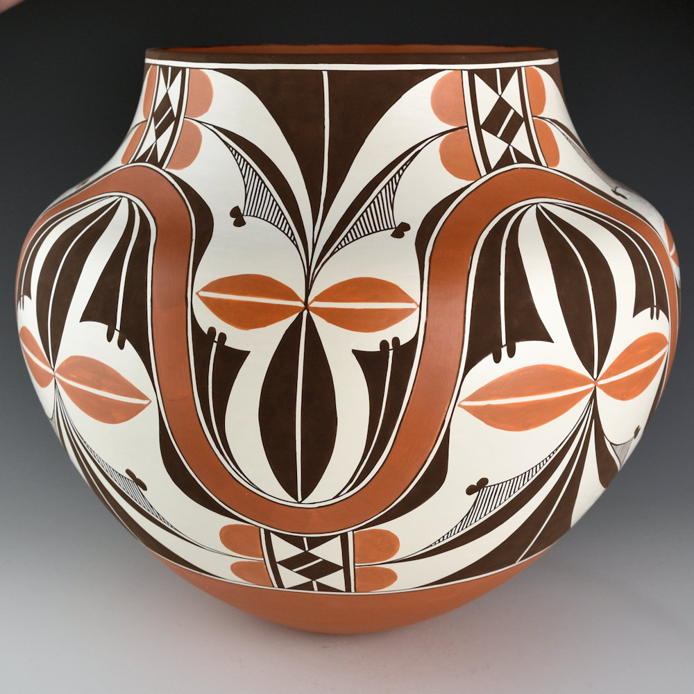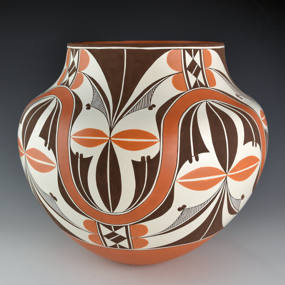 This is a classic large water jar by Robert Patricio. Robert is known for his classic forms and use of both traditional and prehistoric imagery. This piece is coil-built from native clay and is thin-walled. It has a high shoulder and a short neck. The jar is entitled, “Rainbow Flowers”. The jar is VERY intricately painted. There is a rainbow undulating across the surface of the jar. There are flowers above and below the flowers. They are painted with bee-weed and red clay for the leaves. It is a striking use of shape and design with both bold and fine-line areas. Robert is one of the leading traditional Acoma potters working today, evidenced by his stunning forms and complementary designs. The jar is signed on the bottom, “R. M. Patricio”.
