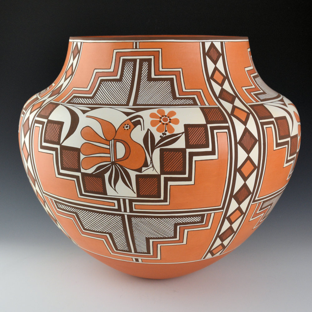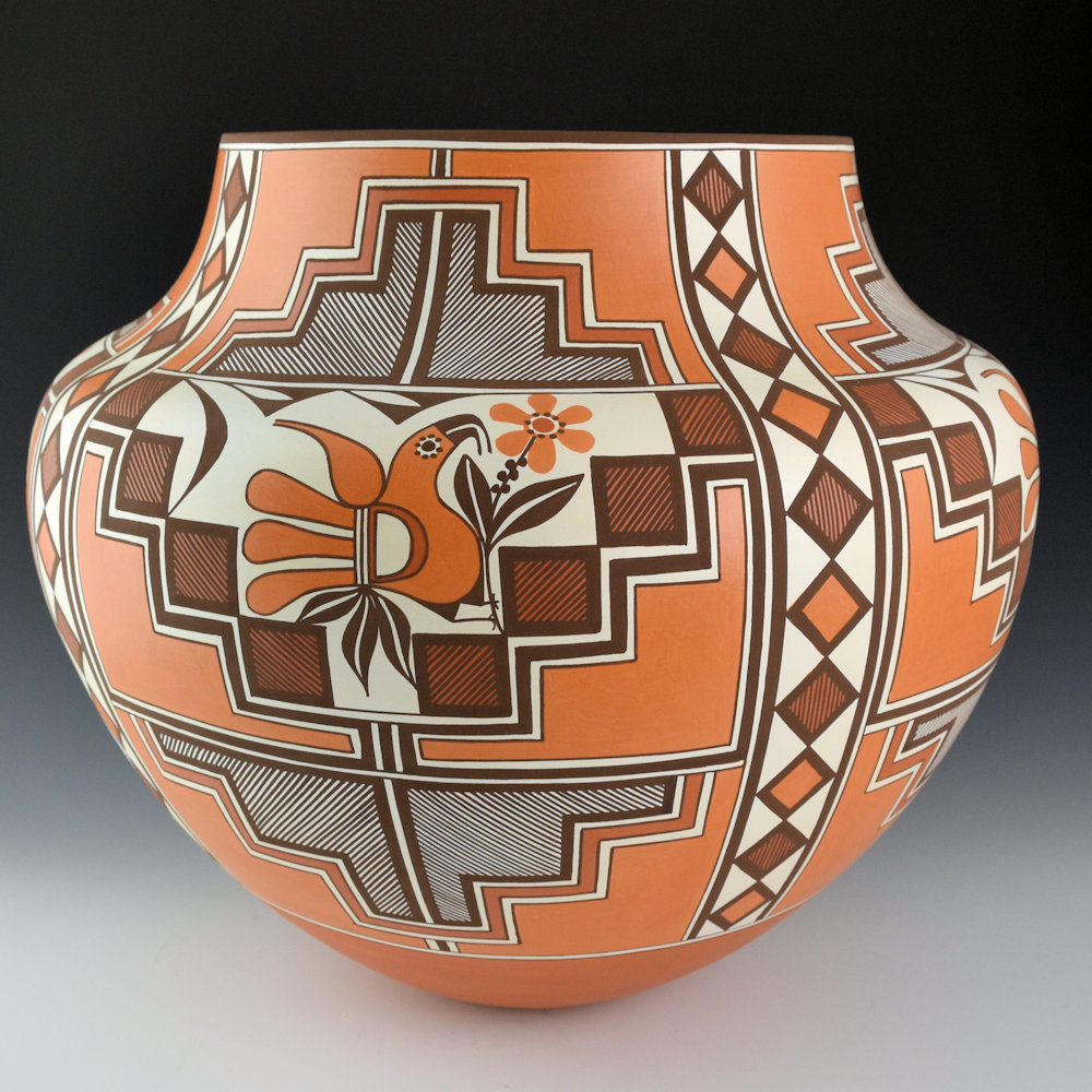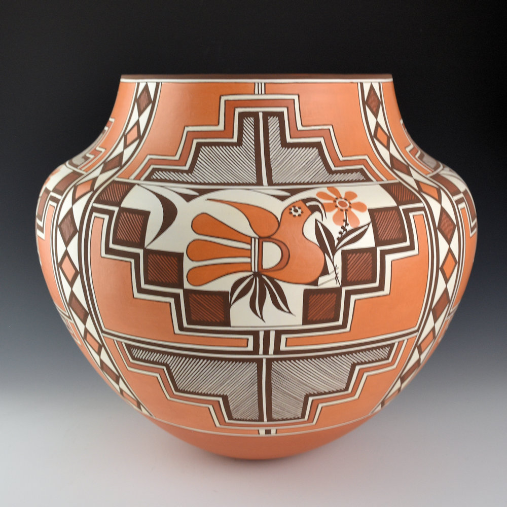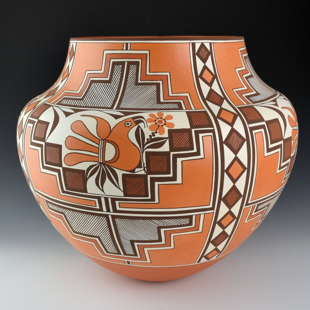 Patricio, Robert – 12″ Tall Four Color Water Jar with Acoma Birds and Rain Designs