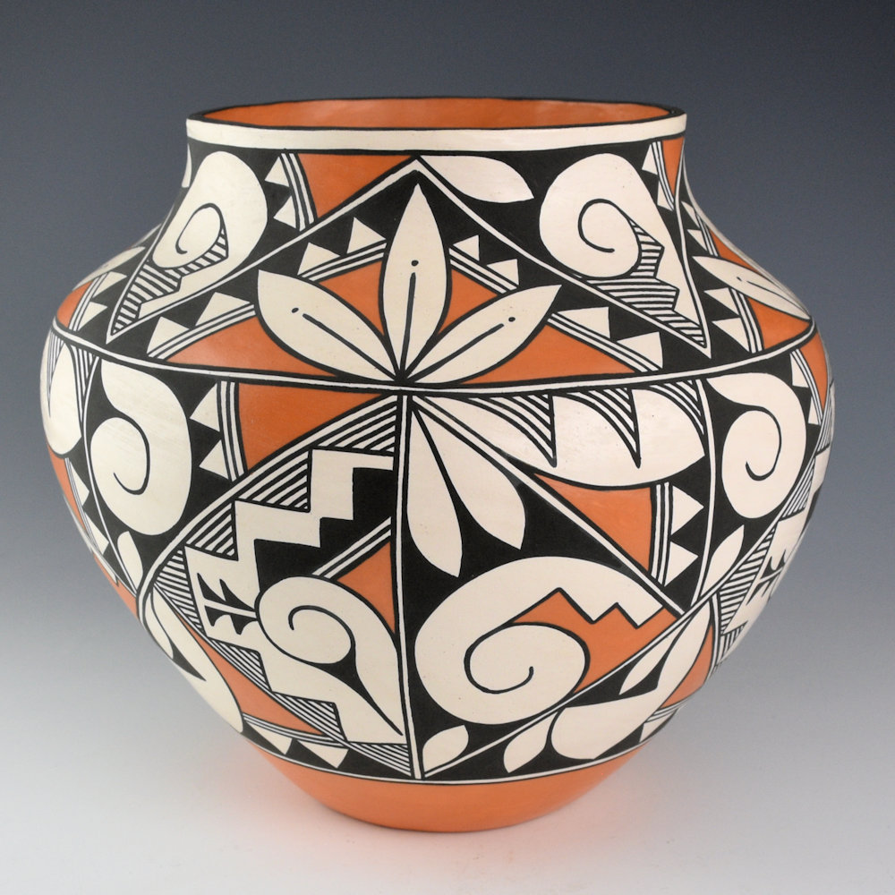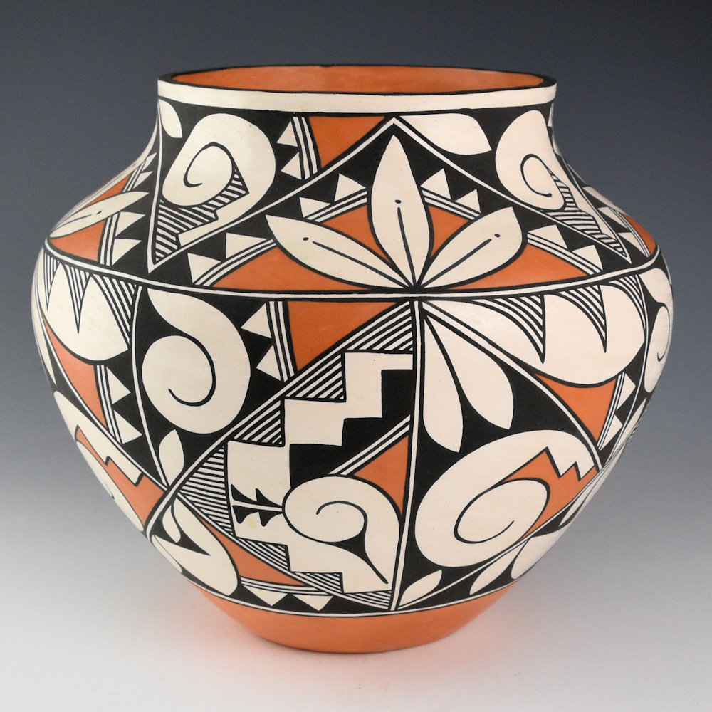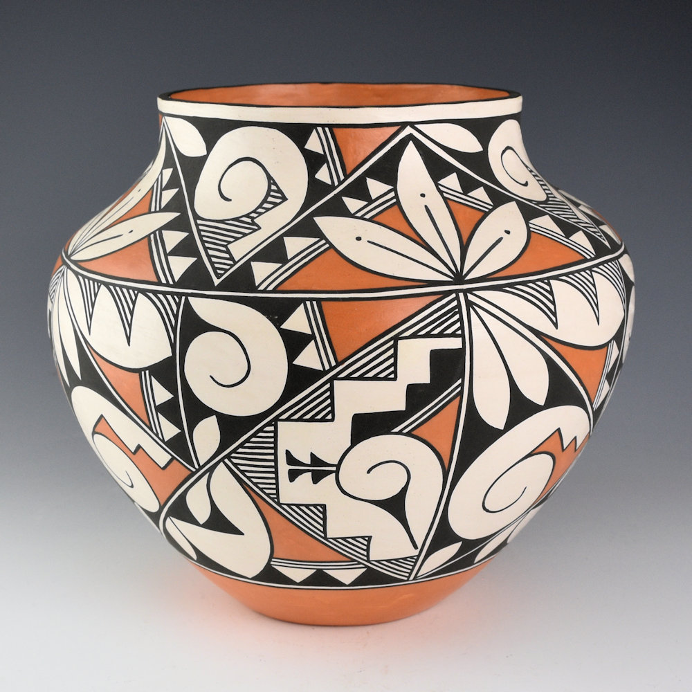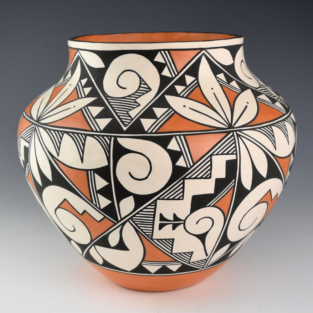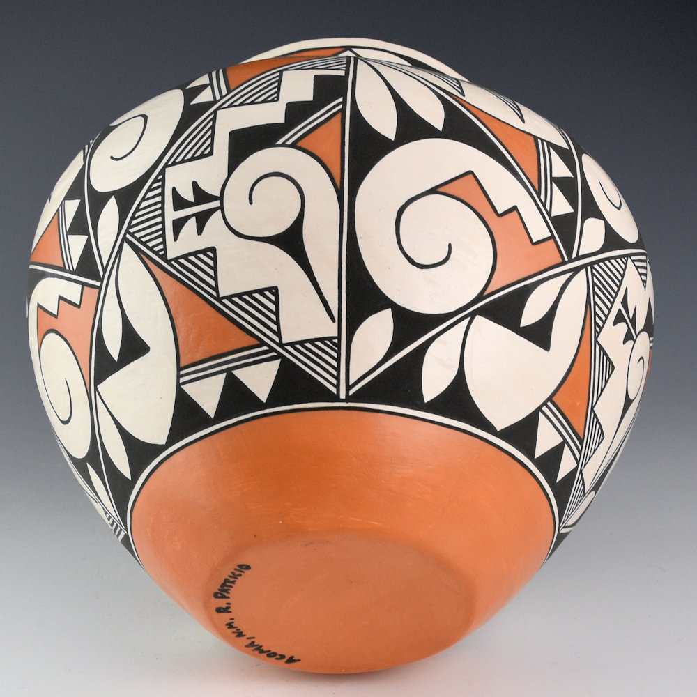 This is a classic water jar by Robert Patricio. Robert is known for his classic forms and use of both traditional and pre-historic imagery. This piece is coil-built from native clay and thin-walled. It has a high shoulder and a short neck. The jar is fully painted with rain and plant designs. It is a colorful and complex jar! Robert is one of the leading traditional Acoma potters working today, evidenced by his stunning forms and complementary designs. The jar is signed on the bottom, “R. M. Patricio”.