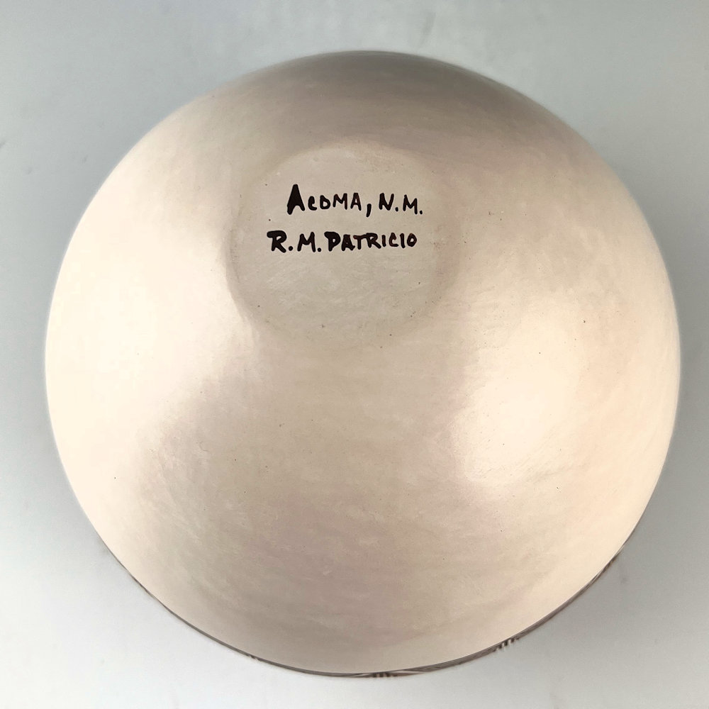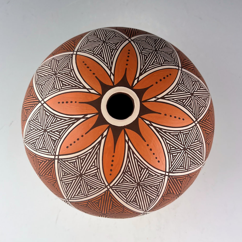 This seedpot by Robert Patricio utilizes classic Acoma fine-line designs. Robert is known for his classic forms and use of both traditional and pre-historic imagery. This piece is coil-built from native clay and thin-walled. It has a classic round shape. The top is a flower design that extends outward. The sides have fine-line designs along with star patterns. It is a complex and creative design. It is exceptional, and the black and white with the two different colors of red clya give the jar a very modern appearance. Robert is one of the leading traditional Acoma potters working today, evidenced by his stunning forms and complementary designs. The seedpot is signed on the bottom, “R. M. Patricio”.