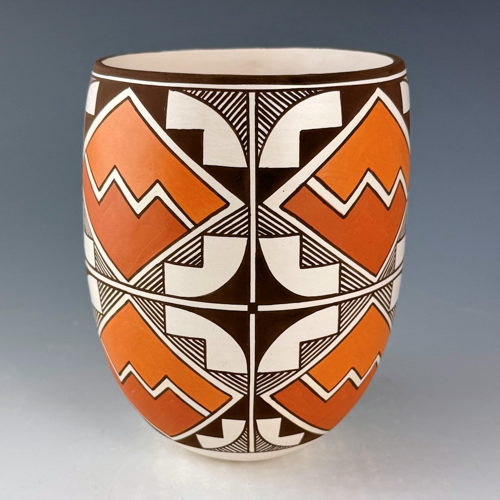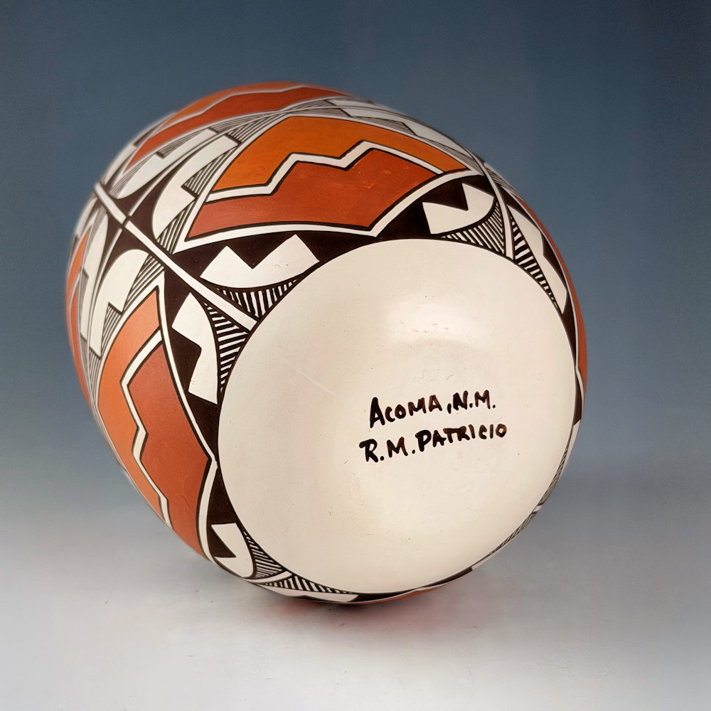 It’s great to see Robert Patricio revive his classic Chaco Canyon “chocolate jars”. It is a shape (see last photo) that was found in quantity at Chaco Canyon. It was only recently discovered to be a receptacle for chocolate or cacao! The jar is coil-built and painted with bee weed (black) and clay slips. The piece has cylindrical sides. It has his classic “Sunrise over the Mesas” design. The diamond shapes represent the sunrise over the mesas. As the jar is turned, the black-and-white areas are the stars in the sky, giving way to the morning light. It is an intricate design. The jar is signed on the bottom, “R. M. Patricio”. The jar is an exciting extension of his artistry in clay and continues the amazing Acoma legacy.