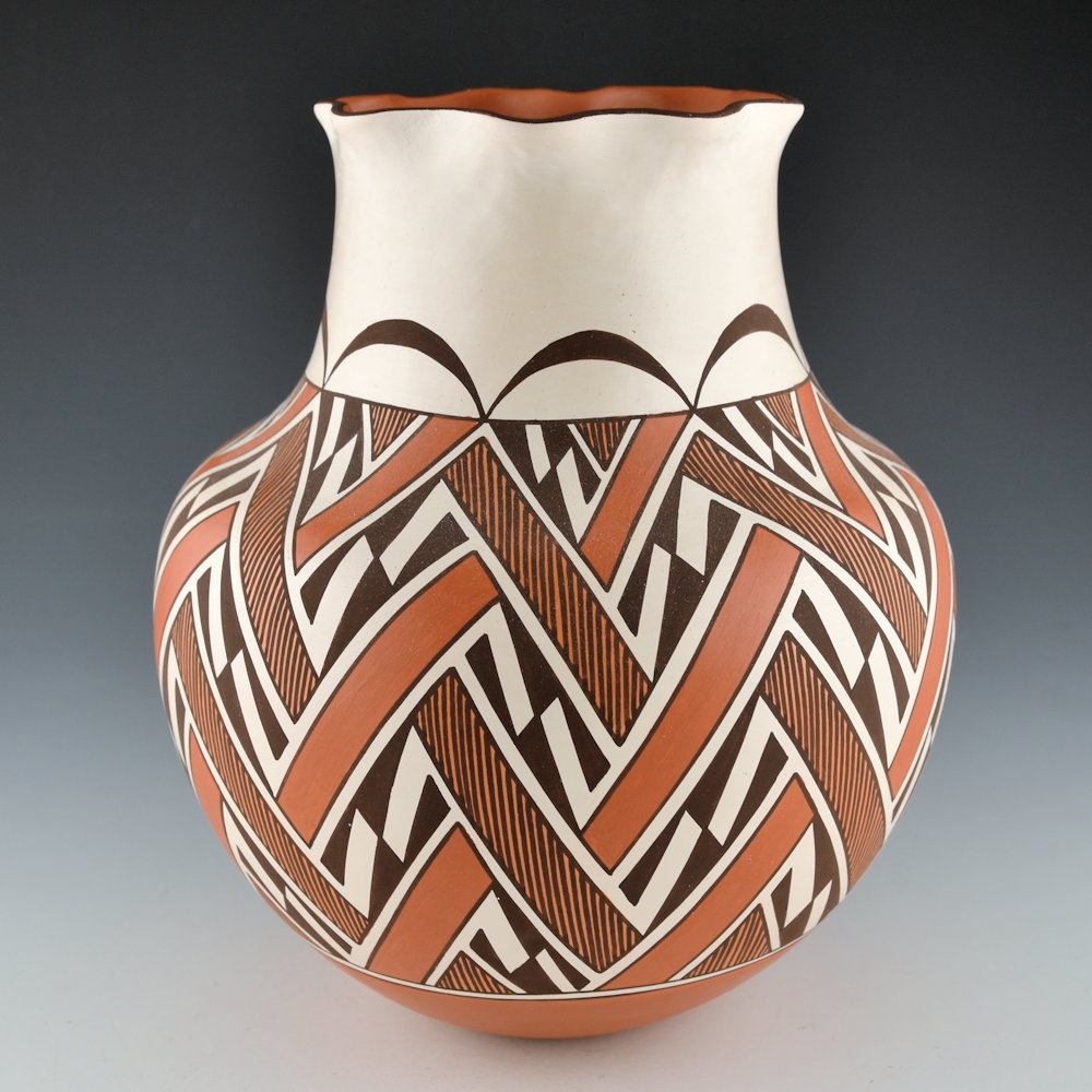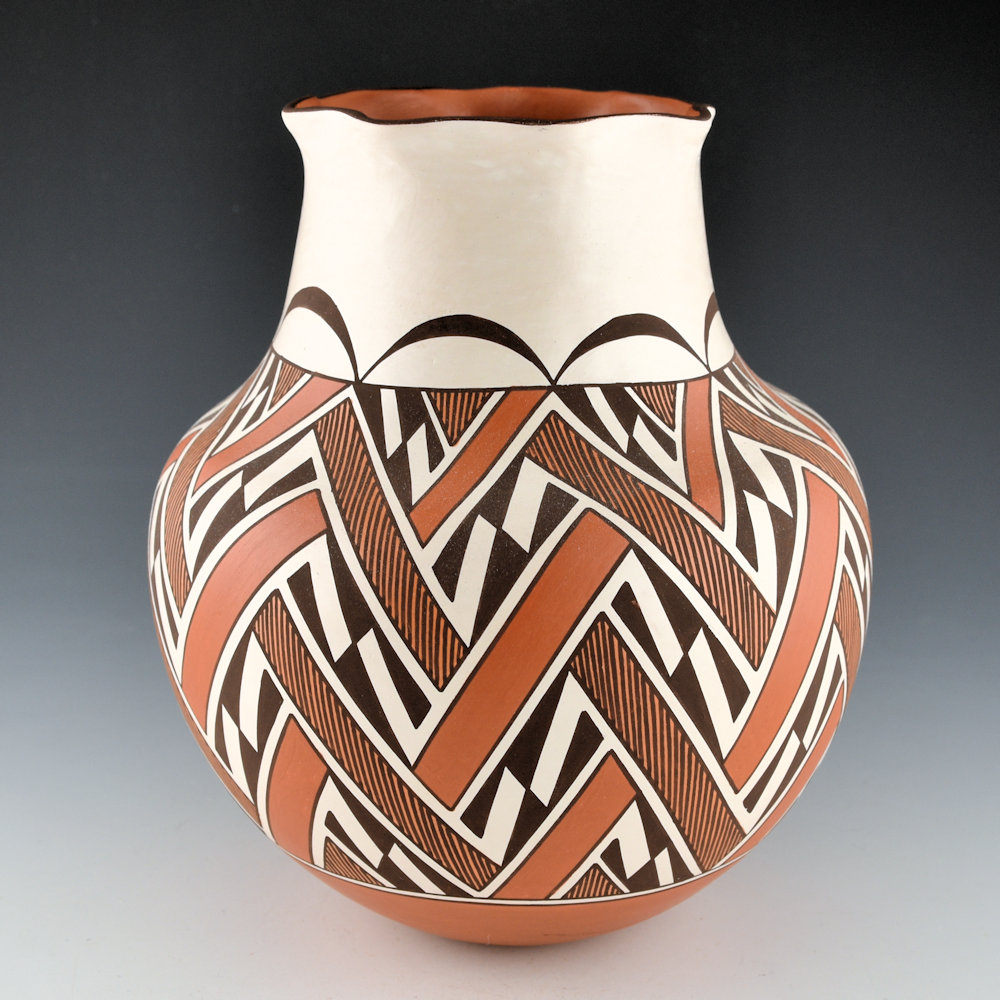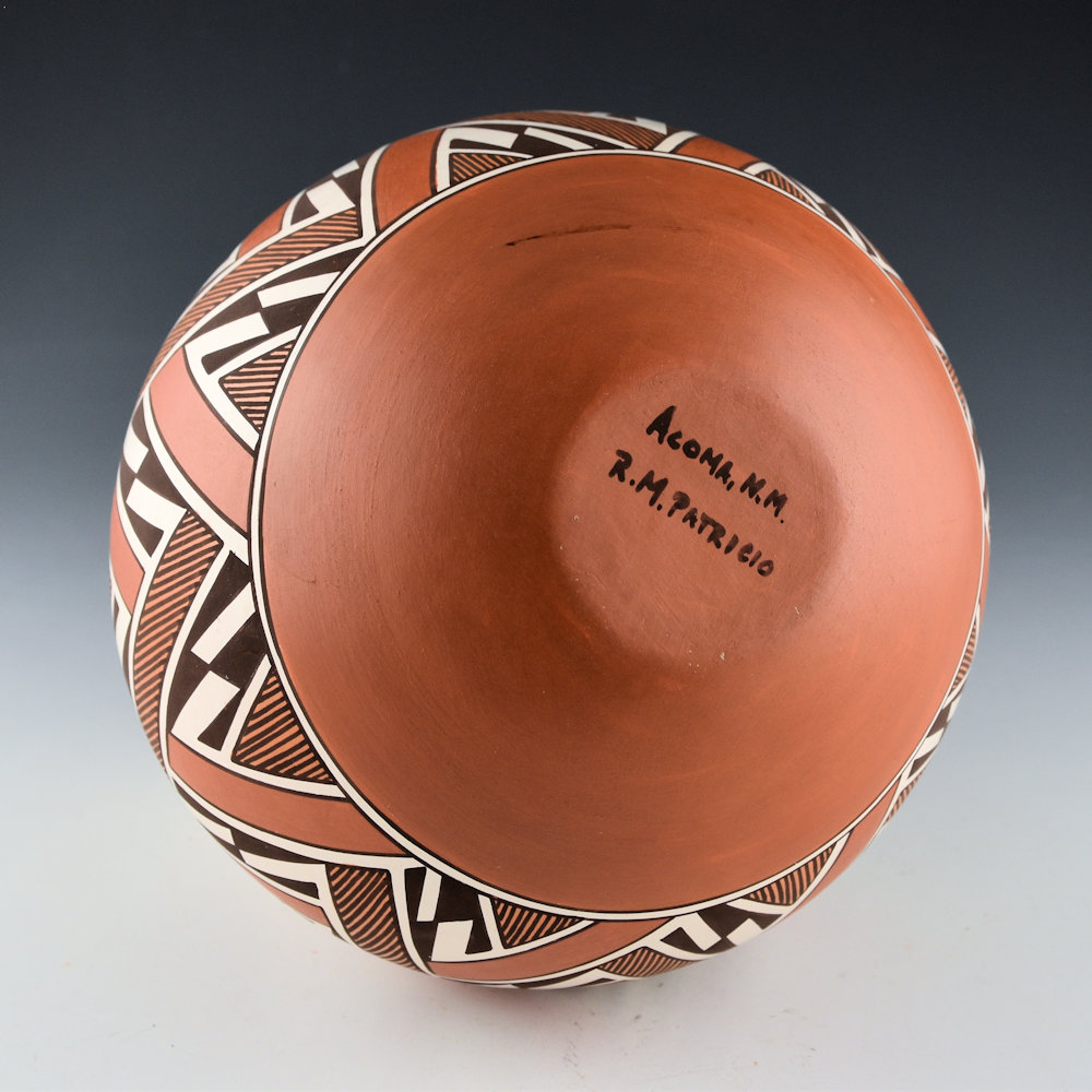 This is a classic jar by Robert Patricio. The piece is round in shape with an elongated neck and fluted rim. The piece is paitned with rounded clouds on the neck and the body of the jar has a classic lightning design. There are alternating red and orange clay bands, with fine-line additions and rectangular sections between. It is a complex design that works perfeclty on this shape of jar. It is signed on the bottom, “R. M. Patricio”. The jar is a striking extension of his artistry in clay and continues the amazing Acoma legacy. Robert is one of the few artists who has won “Best of Pottery” at Santa Fe Indian Market two times, most recently in 2022.