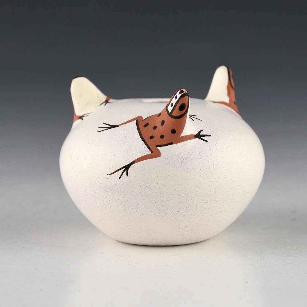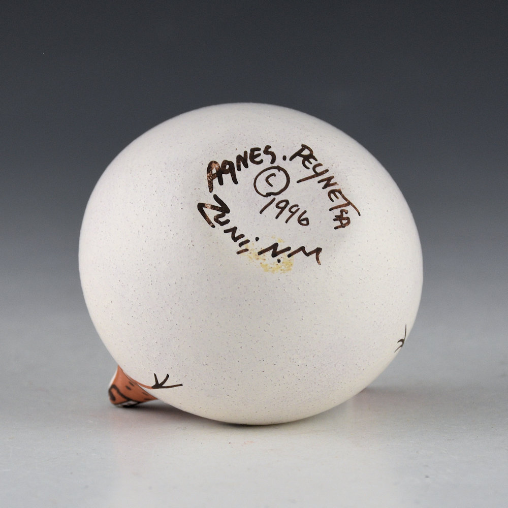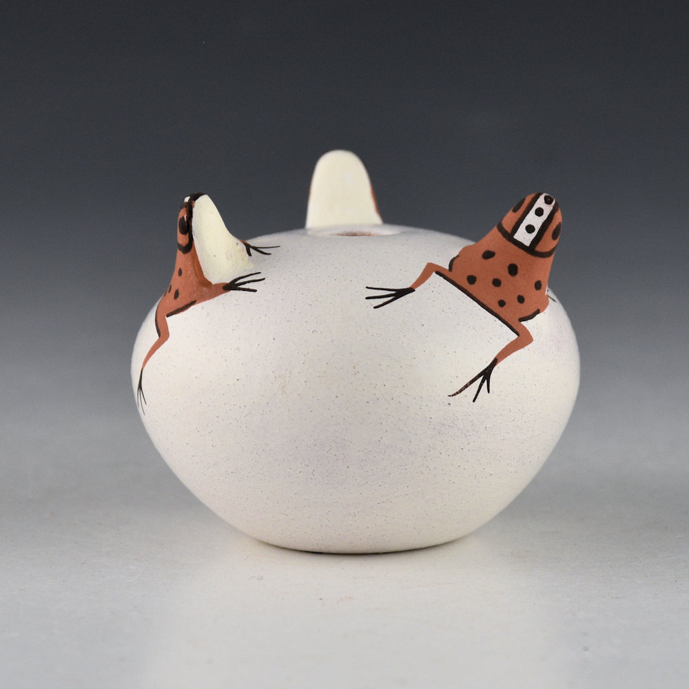Agnes Peynetsa (b. 1962) began making pottery in 1984.  She is the daughter of Charles and Wilma Peynetsa, wife of Berdel Soseech.  She is the sister of Priscilla Peynetsa and Anderson Peynetsa.  Agnes learned pottery making from Jennie Laate and her brother and sister. This seedpot is polished white. There are three frogs on the top in relief. They are painted with red and black clay slips.   The piece is signed on the bottom in the clay, “Agnes Peynetsa 1996”.  It is in excellent condition with no chips, cracks, restoration, or repair.