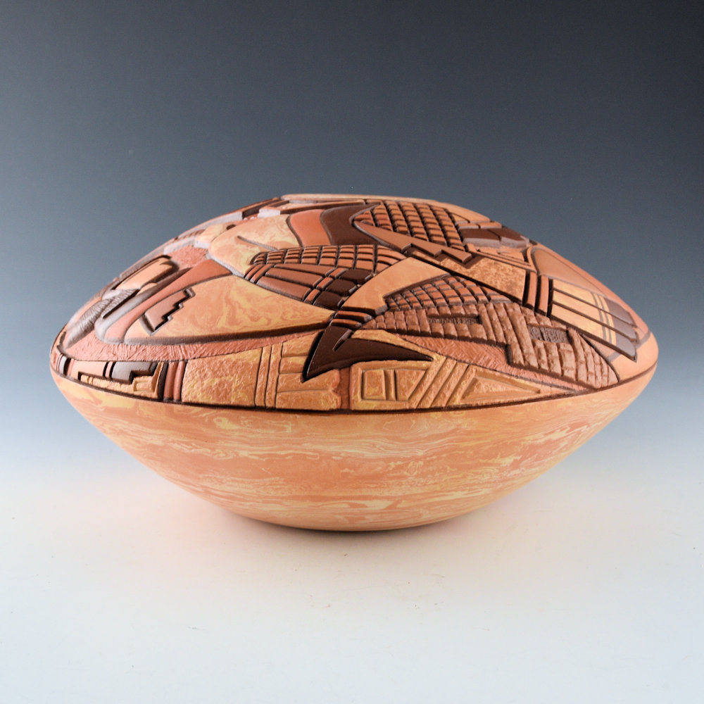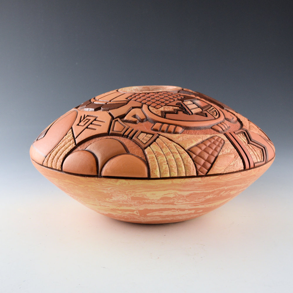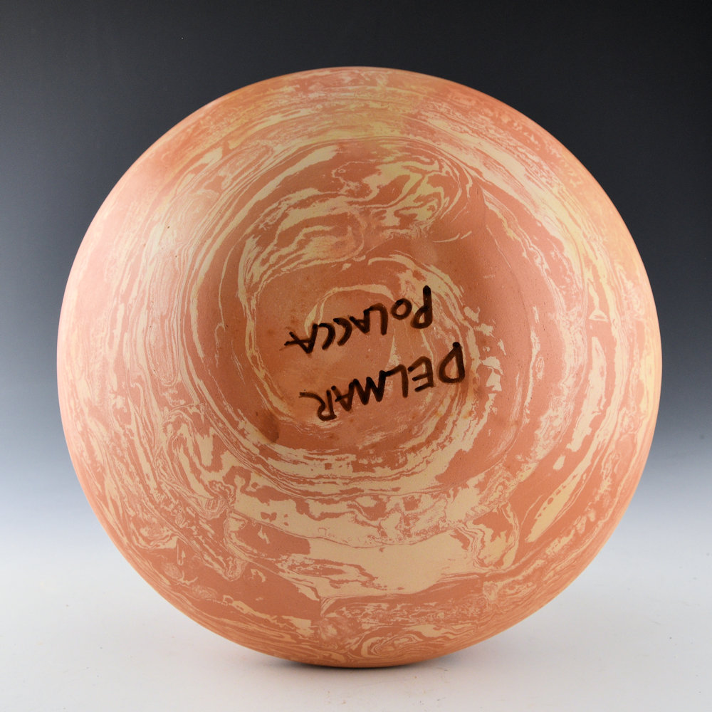 Delmar Polacca (b.1959) is a son of Thomas Polacca. He learned to make pottery from his father around 1993 and continues in a similar style with carved designs. He introduced the “marbling” of the clay, using two different colors of Hopi clay. This large bowl is coil-built and made from two different Hopi clays to create the “marbling'” coloration. The piece has a carved Hano Katsina and Hano Mana Katsina on the top. Next to them is a turtle and there are carved clouds, sun, rain, corn, and other designs across the surface. It is a very complex piece with designs at various levels. It is signed on the bottom in the clay, “Delmar Polacca”. It is in excellent condition with no chips, cracks, restoration or repair.