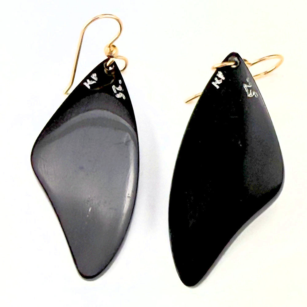 Kevin and Valerie Pourier are Oglala Lakota. Their home and studio are located on the Pine Ridge Reservation – Medicine Root District, just on the northern edge of the Badlands area of the reservation. The inspirational and material source of the Pourierʼs work is rightly ascribed to what also happens to be the Lakota Peopleʼs first name, Pte Oyate kin, the Buffalo People. As partners, they are pleased to cultivate the idea that their work not only comes out of the lifeways of the People but is, moreover, a new cultural art form. Each piece is hand-cut from buffalo horn, which is then carved and inlaid with stones. This is a pair of monarch butterfly wing earrings that are carved and then inlaid with opal and mother-of-pearl shell to create the coloration.