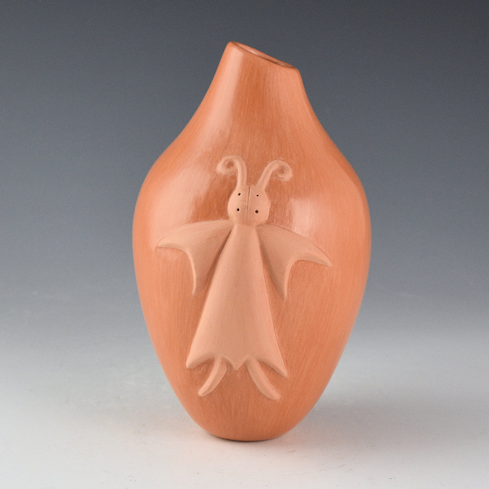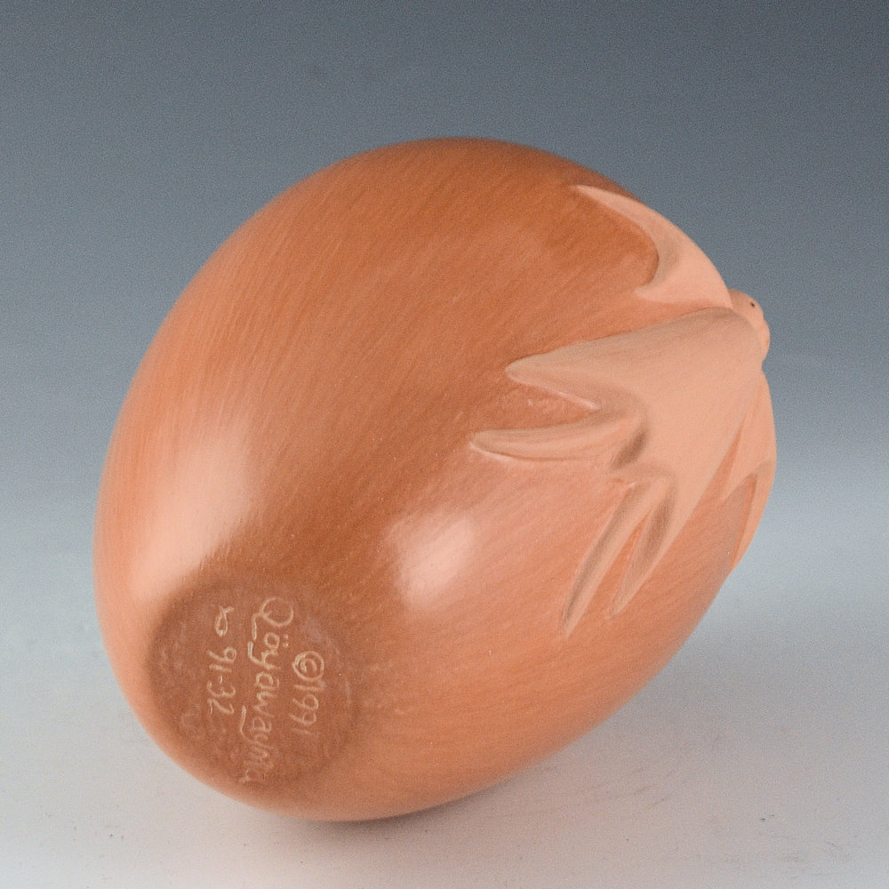Al Qoyawayma is known for his innovative pottery. This jar is a shape that he calls his “wish pot.” It is a distinctive form that was inspired by his aunt, Elizabeth White. She made similar shapes and they would be designed with corn or other motifs. The designs on Al’s pottery are all in repousse, which is to say that they are pushed out from the inside, not applied to the surface! This jar is from 1991 and has a stylized butterfly on the front. It is this “repousse” style that Al learned from his aunt, Elizabeth White. The use of a butterfly is also often a reflection of Elizabeth, who’s name in Hopi meant, “butterfly sitting among the flowers in the breeze”. Look a the the photos from the side, as the figure is VERY deeply pushed out in the clay! The butterfly is matte, while the jar is fully polished. The jar is made from red Hopi clay. It is signed on the bottom, “Qoyawayma”. It is in excellent condition with no chips, cracks, restoration, or repair.