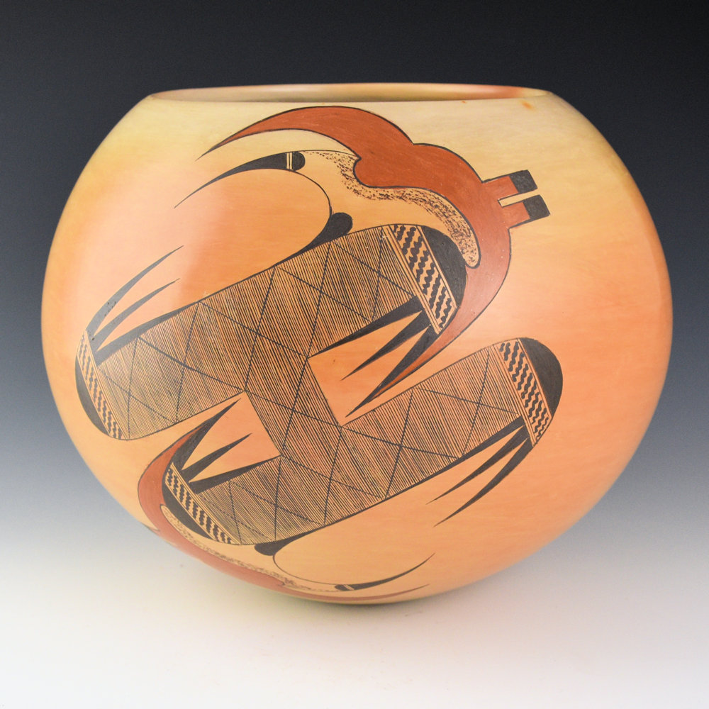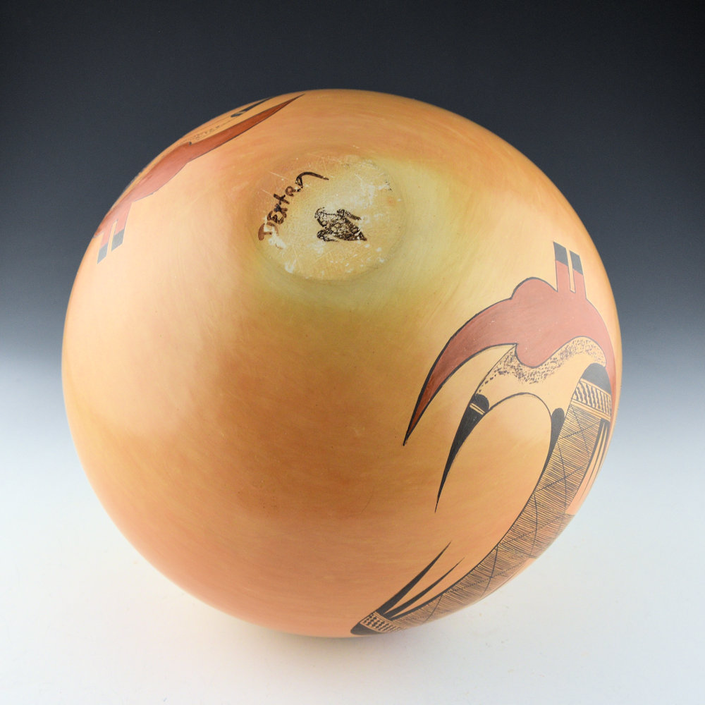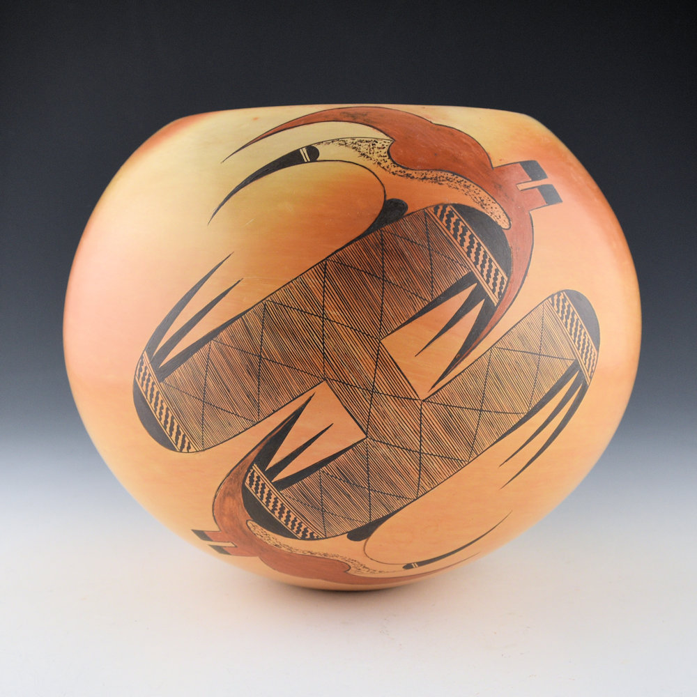 This is a large bowl by Dextra Quotskuyva. She is certainly one of the great innovators among Hopi-Tewa potters. Her work began with more classic imagery and evolved over the years to more unique and stylized designs. This piece is from the early 1980s. It has a round bowl that is coil-built, thin-walled, and fully stone-polished. The bowl itself is nearly perfeclty round! It is painted on each side with a large “bird wing” design. This imagery is one that was originated by Nampeyo of Hano (see last photo). You can see the double birds in red and black on each end of the central design. However, it is the double bird wings in the center that are so striking! They are VERY tightly painted with thin lines, which is where Dextra gained her early notoriety. The lines are nearly perfect on this piece, and note how THIN they are! There is the same double bird wings on each side. Separating them are a large, open space. This reflects Dextra’s early use of open space on her pottery and how it would influence her work over the years. The designs are all painted with bee-weed (black) and red clay that is polished, before the piece was fired. The bowl is signed, “Dextra” and an ear of corn representing the Corn Clan. The bowl is in excellent with no chips, cracks, restoration or repair.