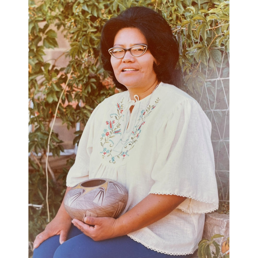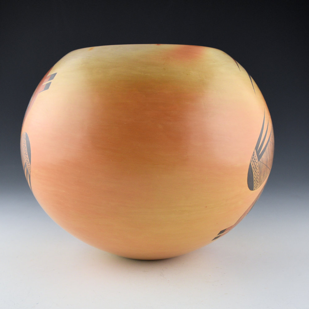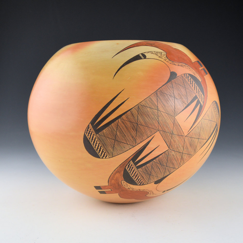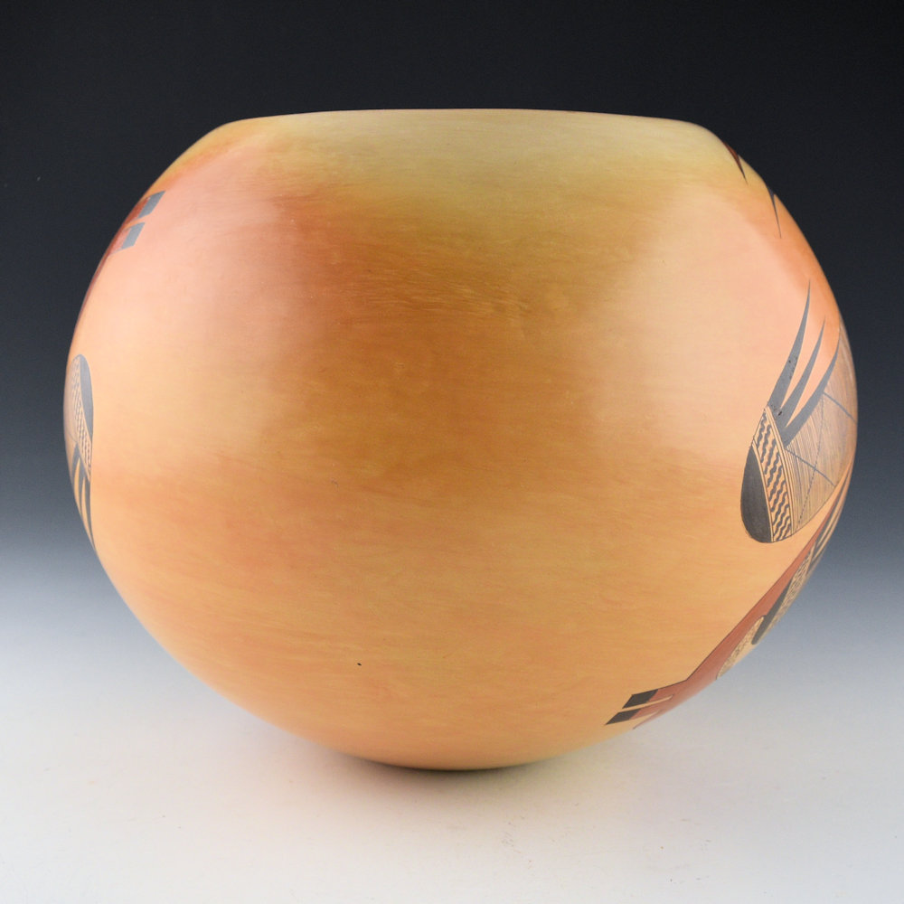 This is a large bowl by Dextra Quotskuyva. She is certainly one of the great innovators among Hopi-Tewa potters. Her work began with more classic imagery and evolved over the years to more unique and stylized designs. This piece is from the early 1980s. It has a round bowl that is coil-built, thin-walled, and fully stone-polished. The bowl itself is nearly perfeclty round! It is painted on each side with a large “bird wing” design. This imagery is one that was originated by Nampeyo of Hano (see last photo). You can see the double birds in red and black on each end of the central design. However, it is the double bird wings in the center that are so striking! They are VERY tightly painted with thin lines, which is where Dextra gained her early notoriety. The lines are nearly perfect on this piece, and note how THIN they are! There is the same double bird wings on each side. Separating them are a large, open space. This reflects Dextra’s early use of open space on her pottery and how it would influence her work over the years. The designs are all painted with bee-weed (black) and red clay that is polished, before the piece was fired. The bowl is signed, “Dextra” and an ear of corn representing the Corn Clan. The bowl is in excellent with no chips, cracks, restoration or repair.