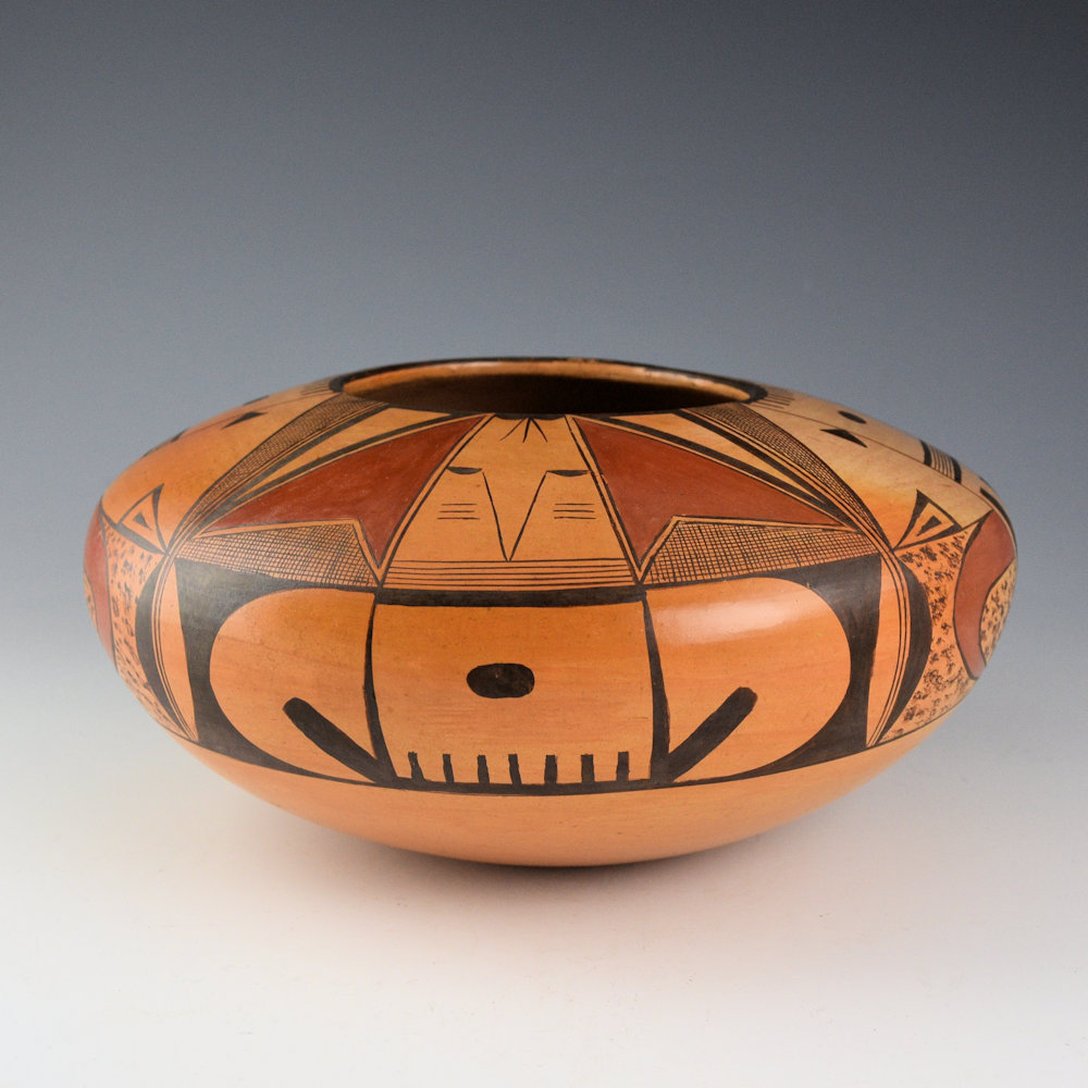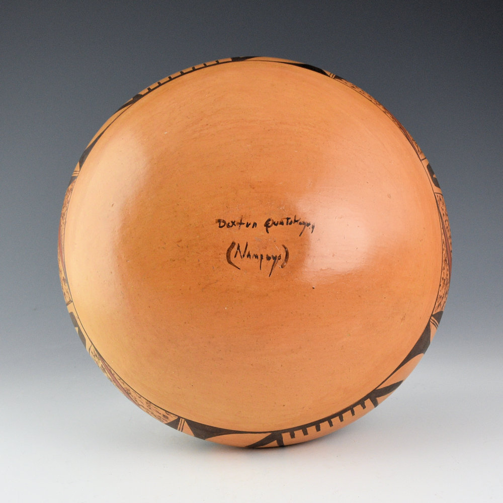 The design has often been referred to as a Katsina Face pattern. They are easy to visualize as are the moths when looking down on the bowl. The painting is her famous early use of thin lines and hachure patterns. Early on it was these VERY fine lines that set her apart from other potters. The red areas are stone polished. The bowl was traditionally fired, creating strong blushes on the surface. This bowl is signed on the bottom, “Dextra Quotskuyva” with a Corn Plant (for Corn Clan). It is in excellent condition with no chips, cracks, restoration or repair. Definitely a classic of her early work in terms of design and form.