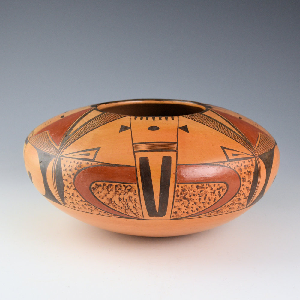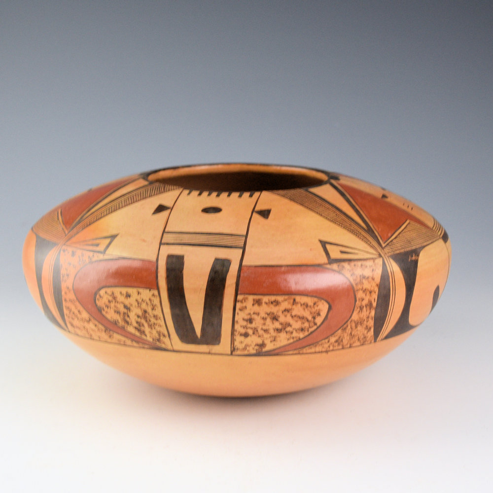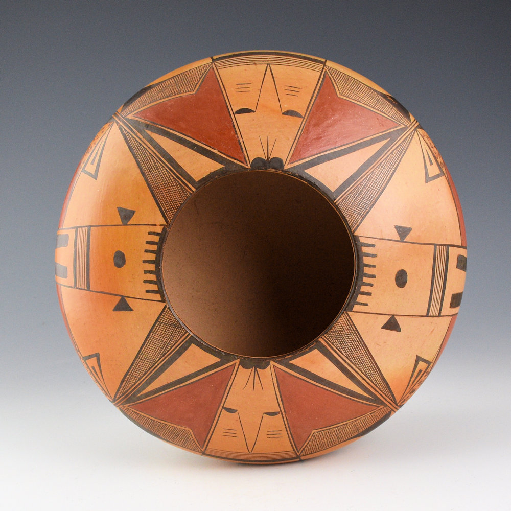 Dextra Quostkuyva Nampeyo is certainly one of the most influential Hopi-Tewa potters of the last 50 years. Not only has she taught numerous potters (Steve Lucas, Yvonne Lucas, Les Namingha, Loren Ami, Hisi Nampeyo, to name just a few), but her creative designs and forms have dramatically influenced the pottery itself. This bowl is from around 1982. It is thin-walled and a classic wide shape with a round shoulder and nearly flat top. It is a classic Sikyatki shape and one that Dextra did not make often at this size. The design is a classic one created by Nampeyo of Hano from Sikyatki designs. It was described in Painted Perfection as: