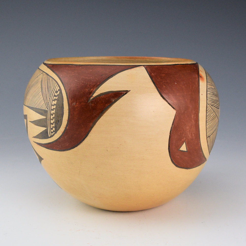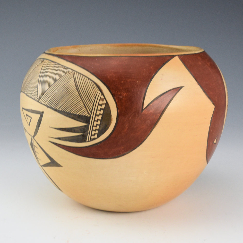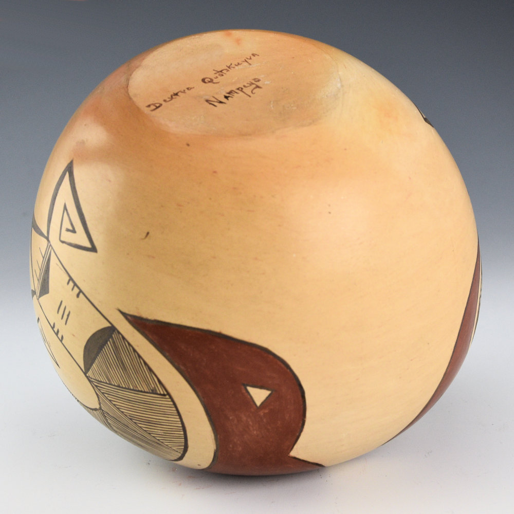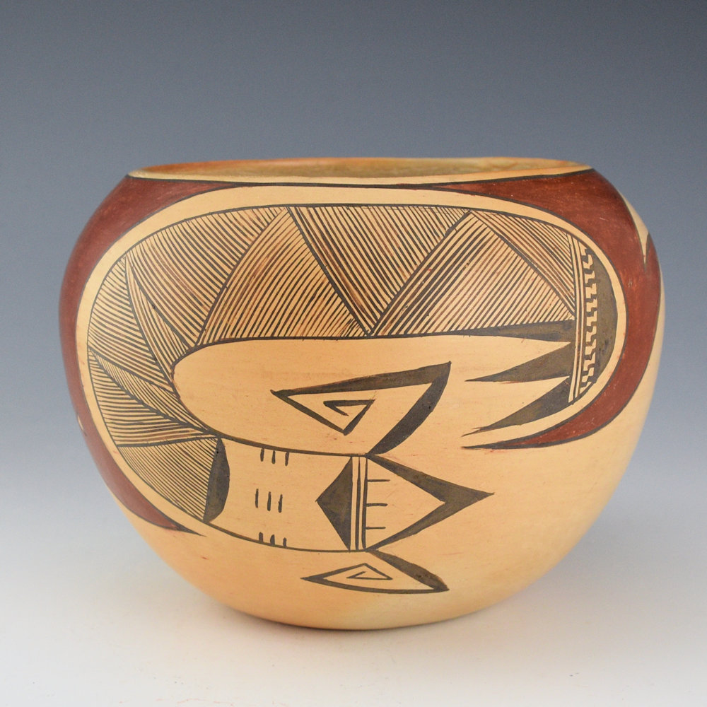 This is a classic bowl by Dextra Quostkuyva Nampeyo. She is known for her creative designs and forms that have dramatically influenced the world of Hopi-Tewa pottery. The piece is coil-built and VERY thin walled! It is taken from a classic design used by both Nampeyo of Hano, and her mother, Rachel. The last photo is a drawing of this design by Rachel Nampeyo from the book Painted Perfection. This bowl has large red polished birds. Below them is a dragonfly in motion with thin lines for the dragonfly tail and and painted wings. This piece reveals the evolutionary process of her pottery designs. There is a classic bird image that then become more complicated with the dragonfly, and yet, from a distance, it almost, ALMOST, has the same appearance. Fascinating. The bowl was traditionally fired to create the blushes on the surface. It is from the 1970s and painted with bee-weed (black) and red clay. It is signed, “Dextra Quotskuyva Nampeyo” on the bottom with a corn plant for Corn Clan. It is in excellent condition with no chips, cracks, restoration, or repair.