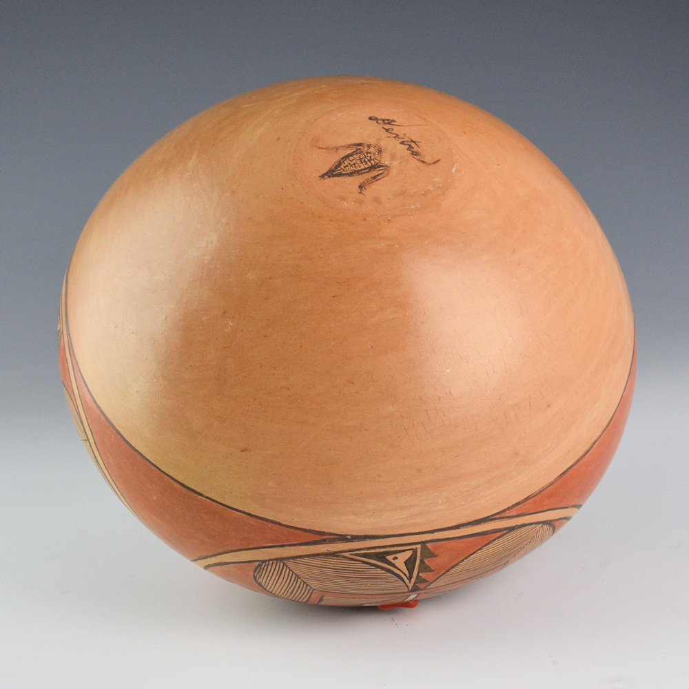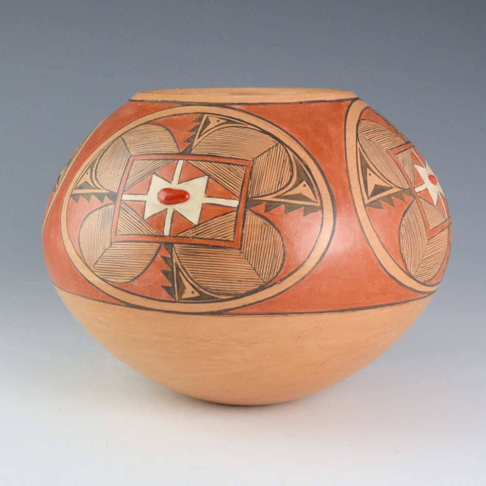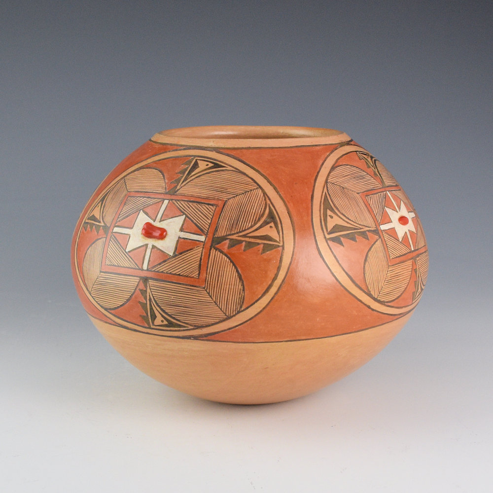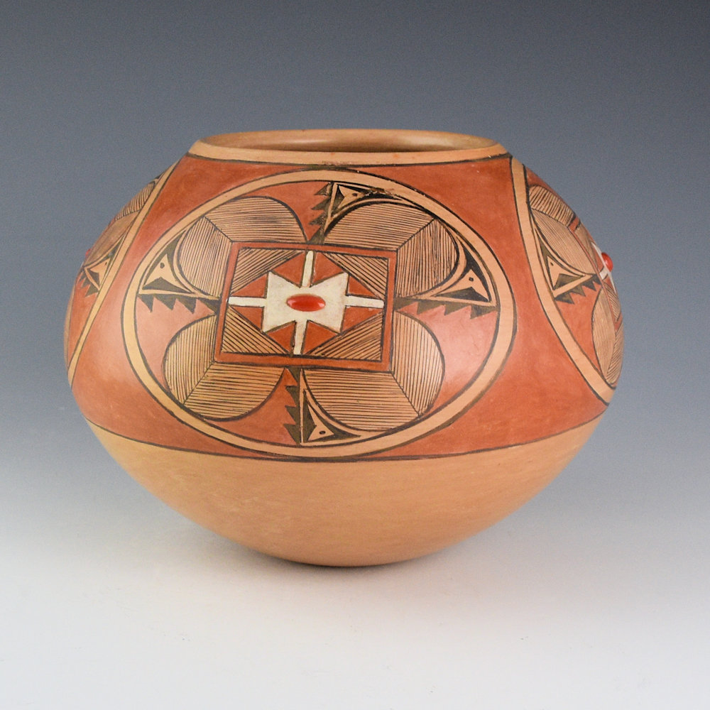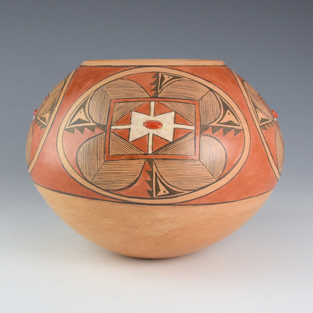 WOW! This is a complex bowl by Dextra Quostkuyva Nampeyo. She was certainly one of the most influential Hopi-Tewa potters of the last 50 years. Not only did she teach numerous potters (Steve Lucas, Yvonne Lucas, Les Namingha, Loren Ami, Hisi Nampeyo, to name just a few), but her creative designs and forms have dramatically influenced the pottery itself. This bowl is from 1980. It is thin-walled, coil-built, and painted with bee-weed (black) and polished red clay slips. The jar has a round shape and it is fully painted. There are four large flowers on each side of the bowl. They are painted with thin lines, and there is white clay at the center. In the center of each flower is an inset piece of coral. The area surrounding the flowers is polished brown. In the early 1980s, Dextra was innovative with texture, carving, and materials. Think of the time period in 1980, when most Hopi potters were creating a very classic range of designs, and how wild this must have appeared! Dextra often said she was inspired to include stones having seen the jewelry of Charles Loloma. There is a creative drive to the piece, much like that of her ancestor Nampeyo of Hano. The bowl was traditionally fired, creating strong blushes on the surface. This bowl is signed on the bottom, “Dextra” and an ear of corn for Corn Clan. It is in excellent condition with no chips, cracks, restoration, or repair. Definitely a classic of her creative clay art!