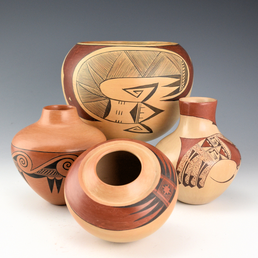 “I was watching my mom (Rachel Nampeyo) all the time, and I was picking up everything she was doing. I found my own polishing stones. I would collect clays. My mother didn’t like it when I did different types of designs. She was different in her ideas. My mother, she went so far as to say that whatever our great-grandmother had reproduced from old designs—those were important designs. We’re supposed to have the basics, she’d say. The big six. Don’t part from that. The six traditional designs. One of them is the migration design, the eagle feather design, the hummingbird design, the horned lizard, the moth design, and parrots. Those are the ones that started with Lesso and Nampeyo. The designs are mainly from Sikyatki people—it was their pottery that was dug out when they were excavating. They were beautiful designs they had used quite a bit.” Dextra Quotskuyva, Spoken Through Clay