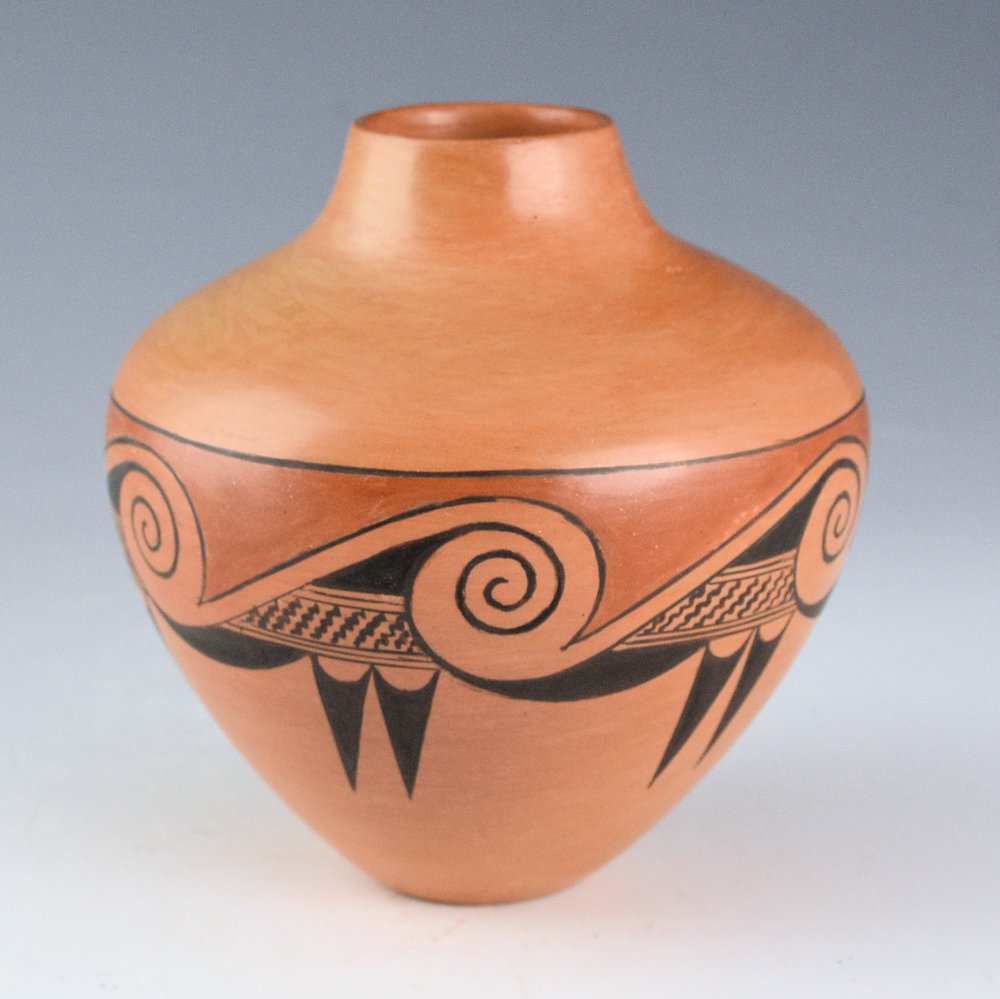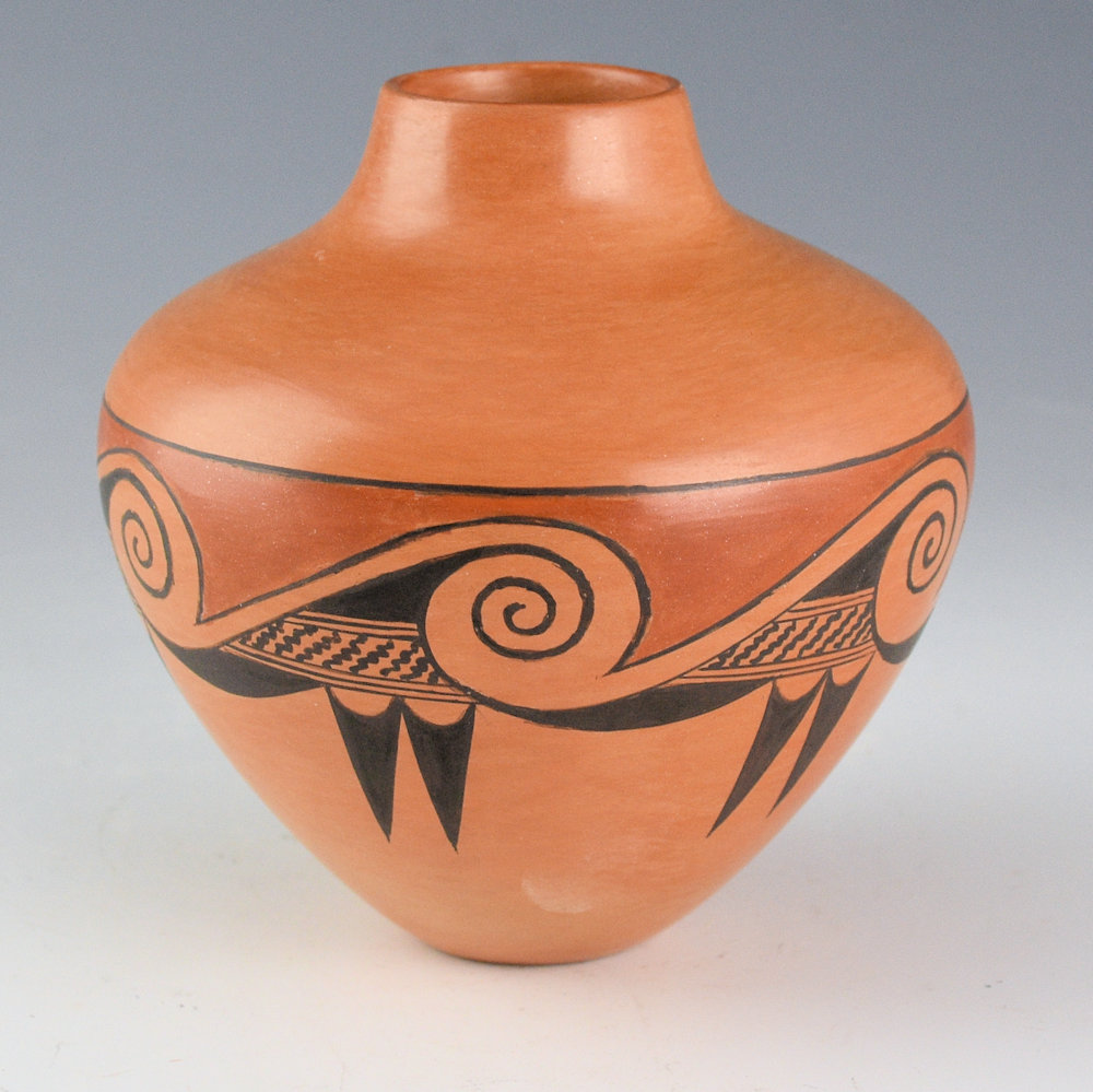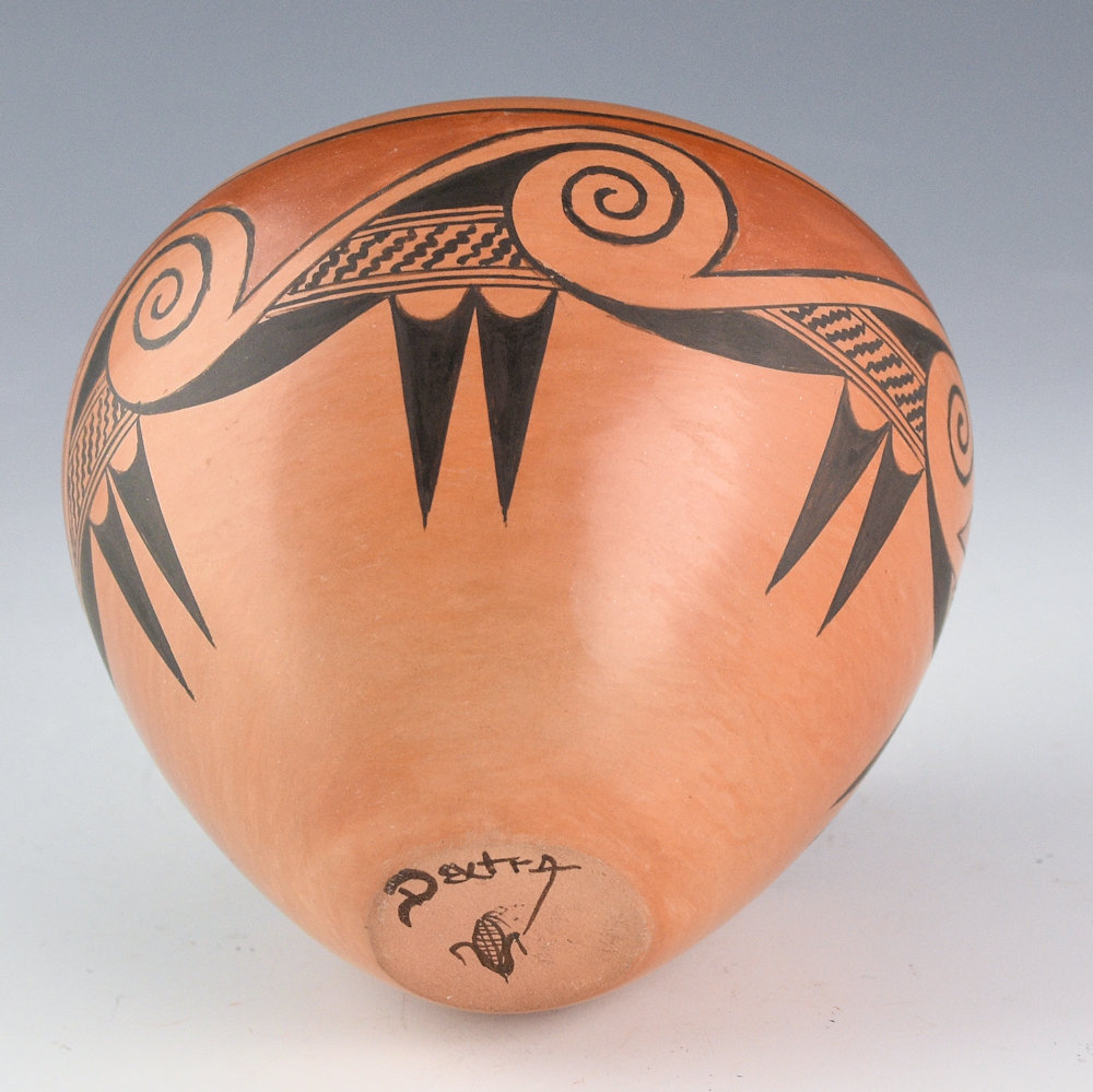 This is a classic jar by Dextra Quostkuyva Nampeyo. She is known for her creative designs and forms that have dramatically influenced the world of Hopi-Tewa pottery. The shape has a high shoulder and short neck. The entire piece is fully polished. There is a central band of design that is painted with bee-weed (black) and brown clay. There are a series of rolling clouds along with bird wings that are extended downward. Above the clouds is a polished brown area. This piece is from a period in Dextra’s pottery where she focused on form and simplicity of design, allowing the firing and the clay to have a voice in her clay art. The jar was traditionally fired to create the blushes on the surface. It is from the 1980s and painted with bee-weed (black) and red clay. It is signed, “Dextra” on the bottom with a corn plant for Corn Clan. It is in excellent condition with no chips, cracks, restoration, or repair.