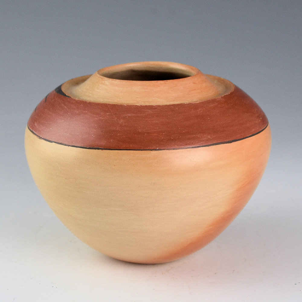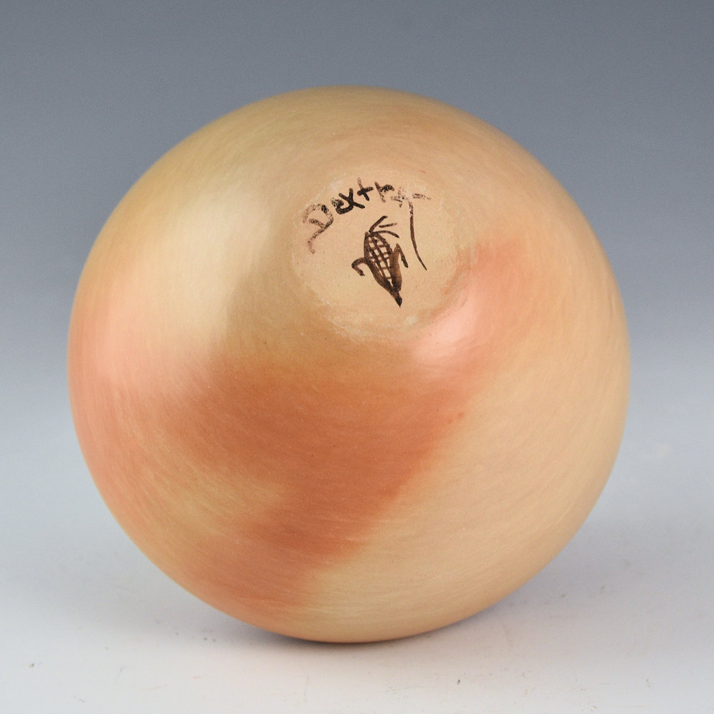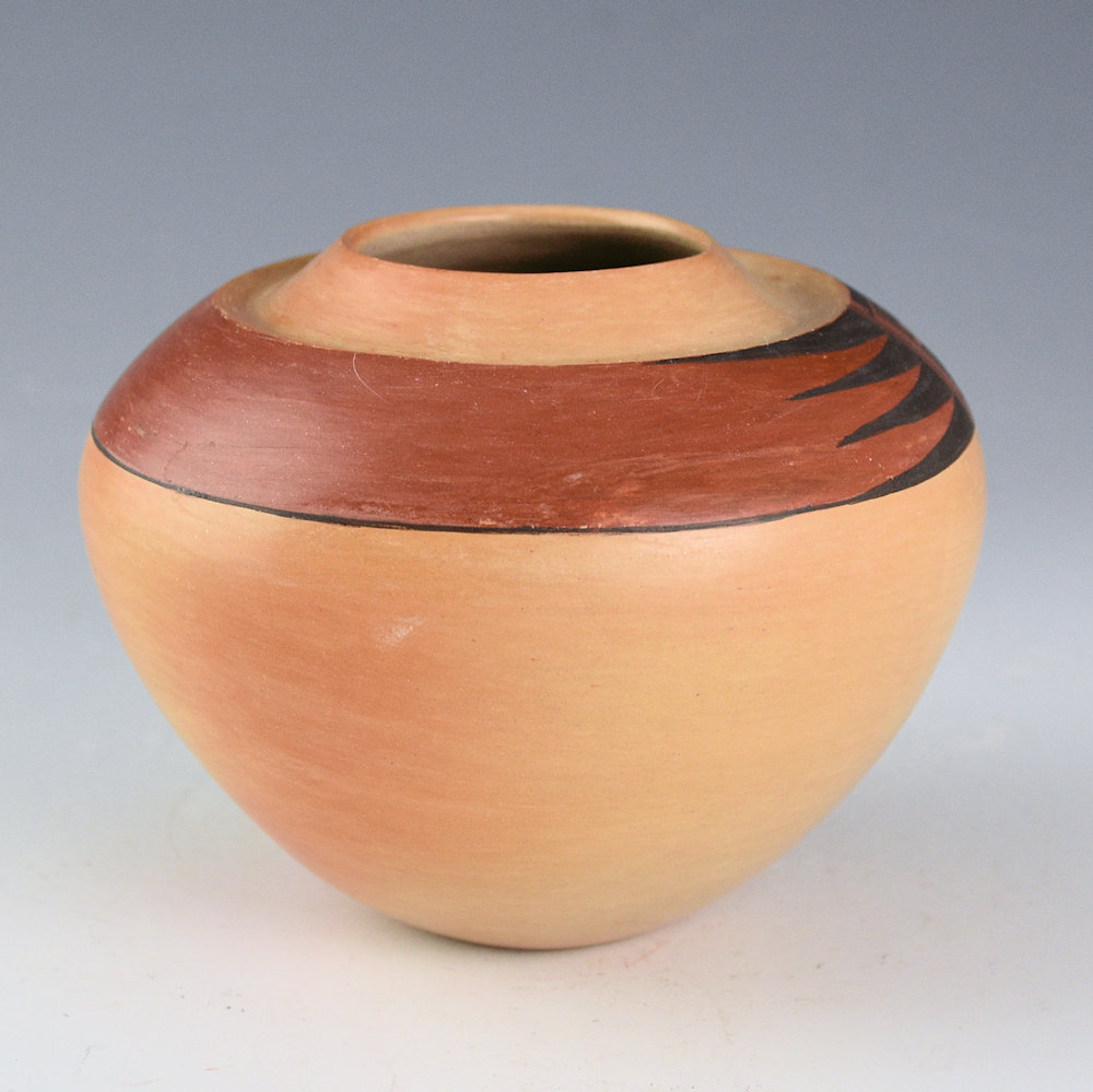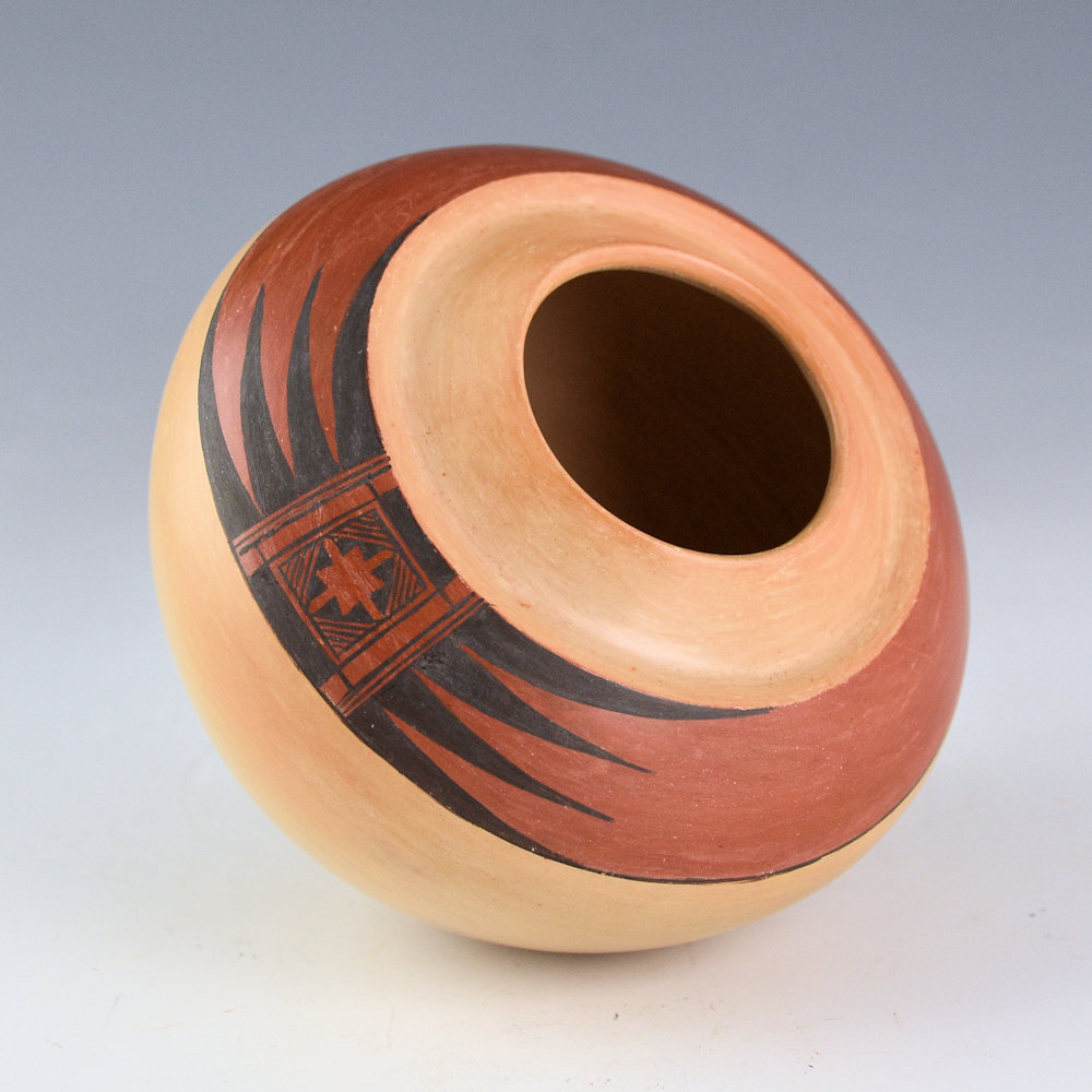 This is an unusual jar by Dextra Quostkuyva Nampeyo. She is known for her creative designs and forms that have dramatically influenced the world of Hopi-Tewa pottery. The shape is unusual with a sharp, indented shoulder near the top of the piece! Just past the shoulder there is a band that is slipped and polished red. There is an eagle wing painted on the red with bee-weed (black). This piece is from a period in Dextra’s pottery where she focused on form and simplicity of design, allowing the firing and the clay to have a voice in her clay art. The bowl was traditionally fired to create the blushes on the surface. It is from the 1980s and painted with bee-weed (black) and red clay. It is signed, “Dextra” on the bottom with a corn plant for Corn Clan. It is in excellent condition with no chips, cracks, restoration, or repair.