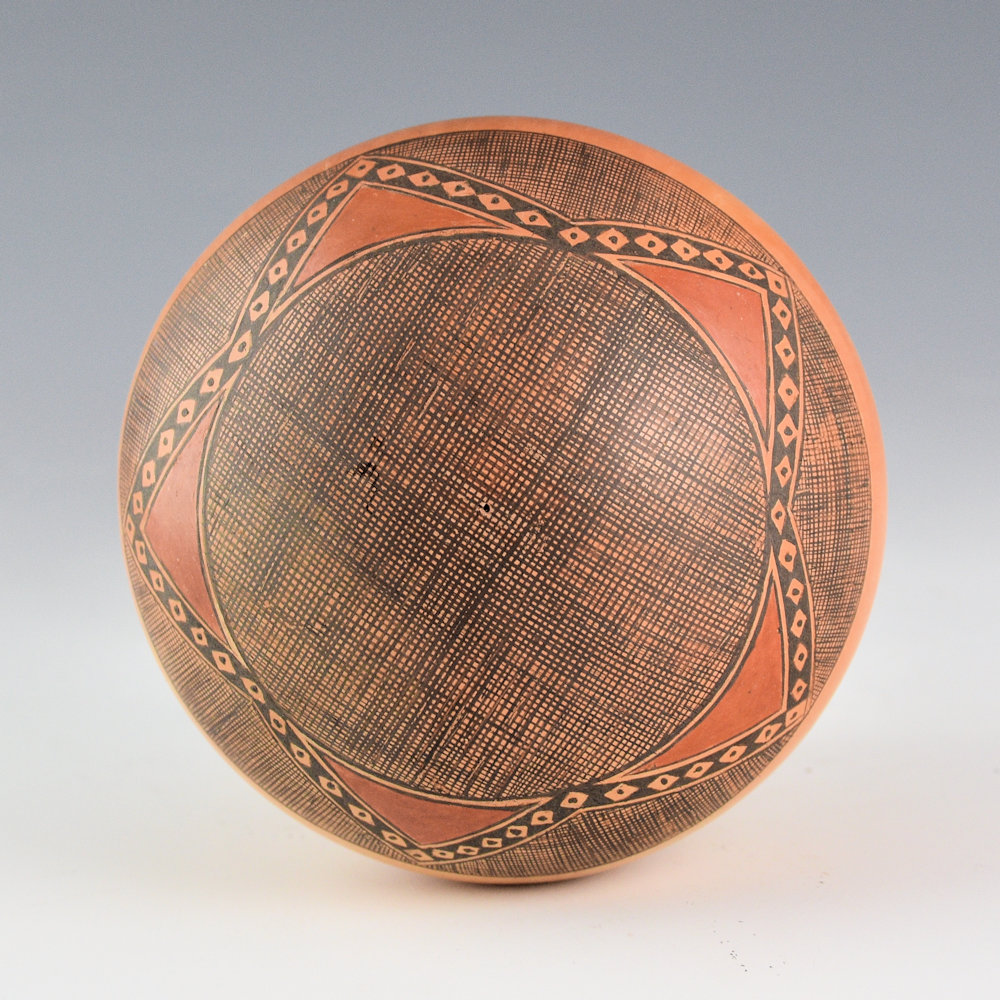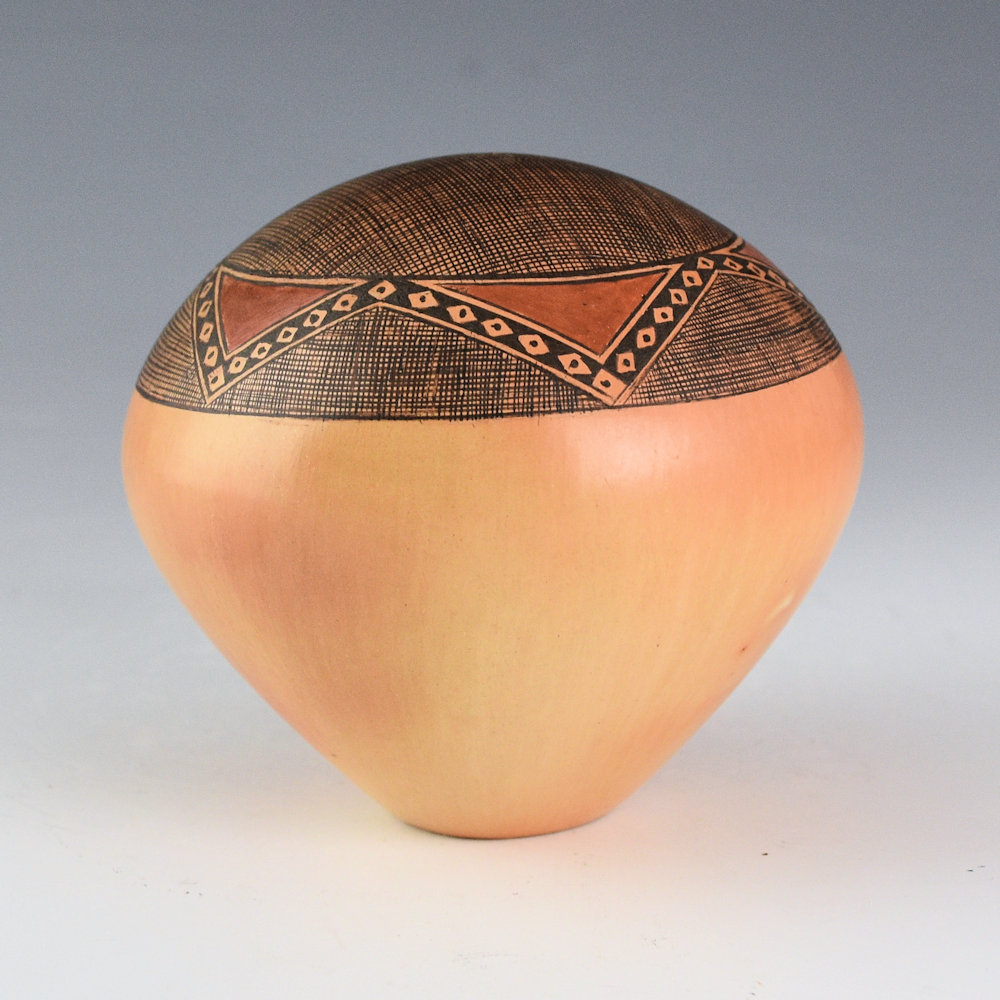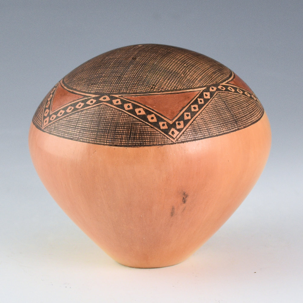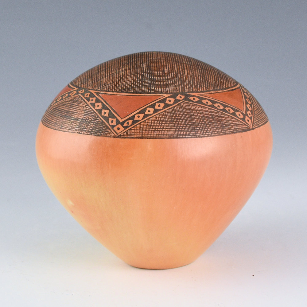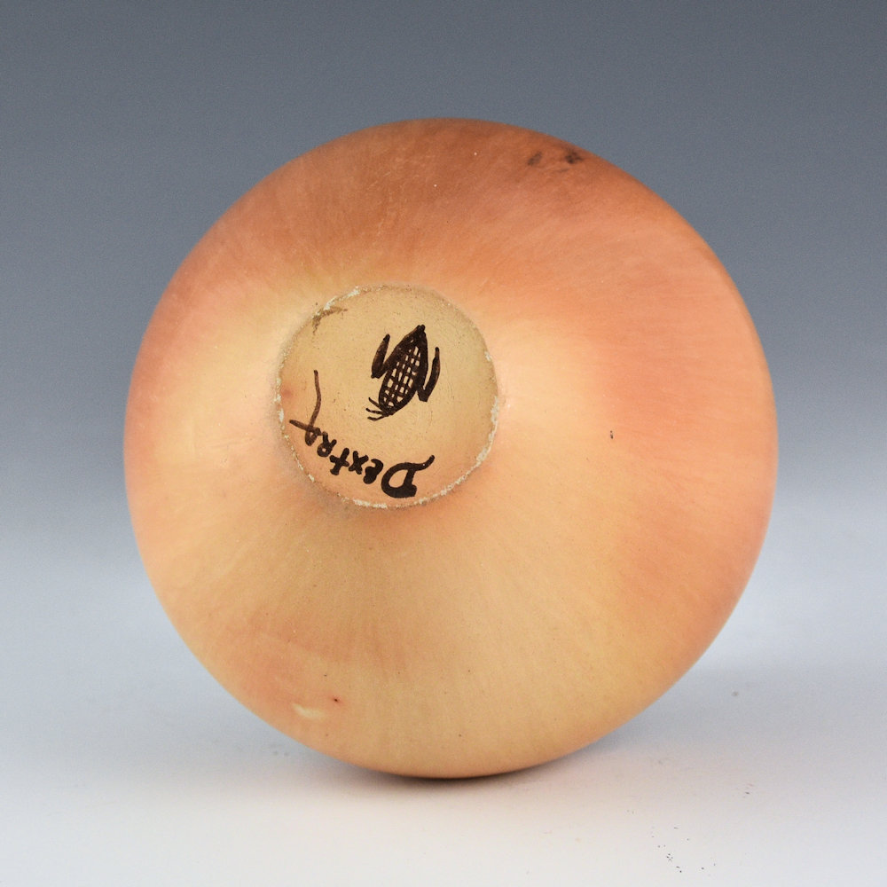 This is a very tightly painted seedpot by Dextra Quostkuyva Nampeyo. She was certainly one of the most influential Hopi-Tewa potters of the last 50 years. Not only did she teach numerous potters (Steve Lucas, Yvonne Lucas, Les Namingha, Loren Ami, Hisi Nampeyo, to name just a few), but her creative designs and forms have dramatically influenced the pottery itself. The seedpot has a narrow base and round top. It is fully polished and painted with bee-weed and clay slips. The fine-line hatchwork is simply breathtaking in person! It was the use of thinly painted lines that made Dextra famous in the 1970s and this is one of the most complex painted fine-lines I have seen. There are triangular “petals” for the flower that are polished brown. The seedpot was traditionally fired to create the blushes on the surface. It is signed, “Dextra” on the bottom with a corn plant for Corn Clan. It is in excellent condition with no chips, cracks, restoration, or repair.