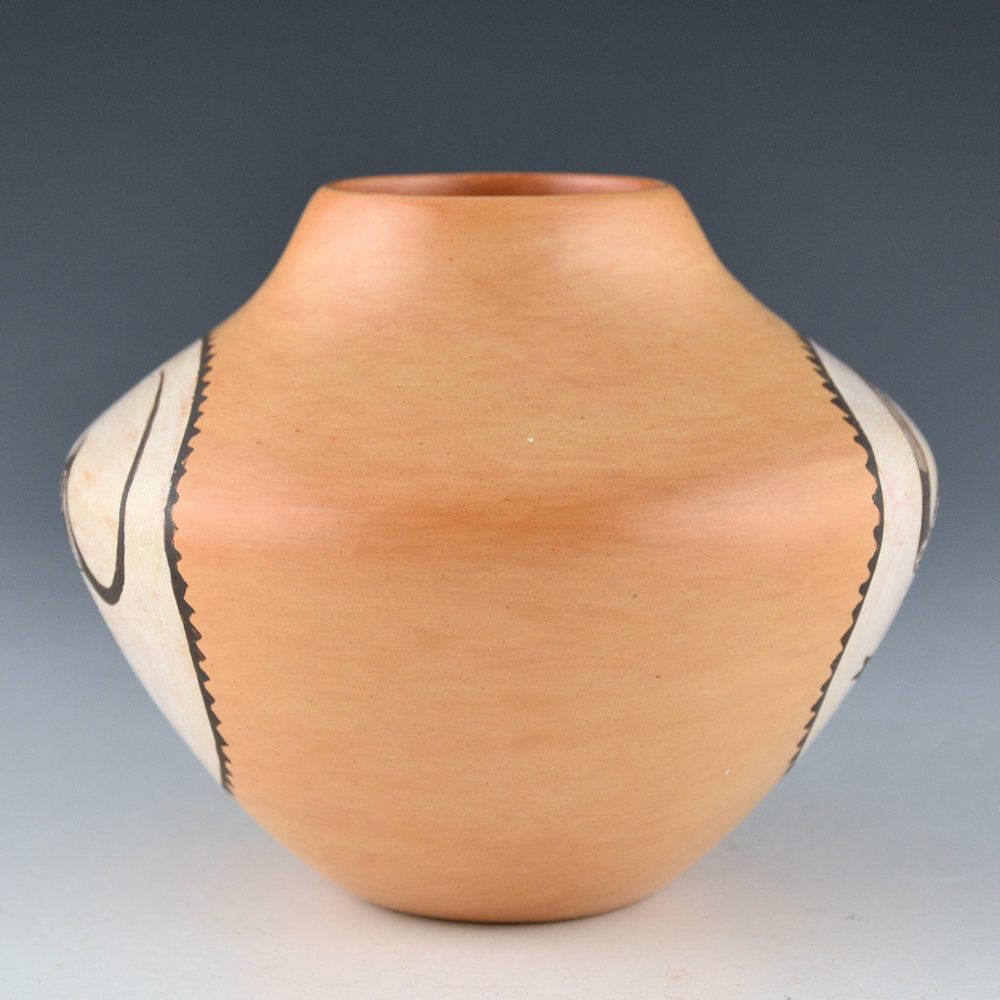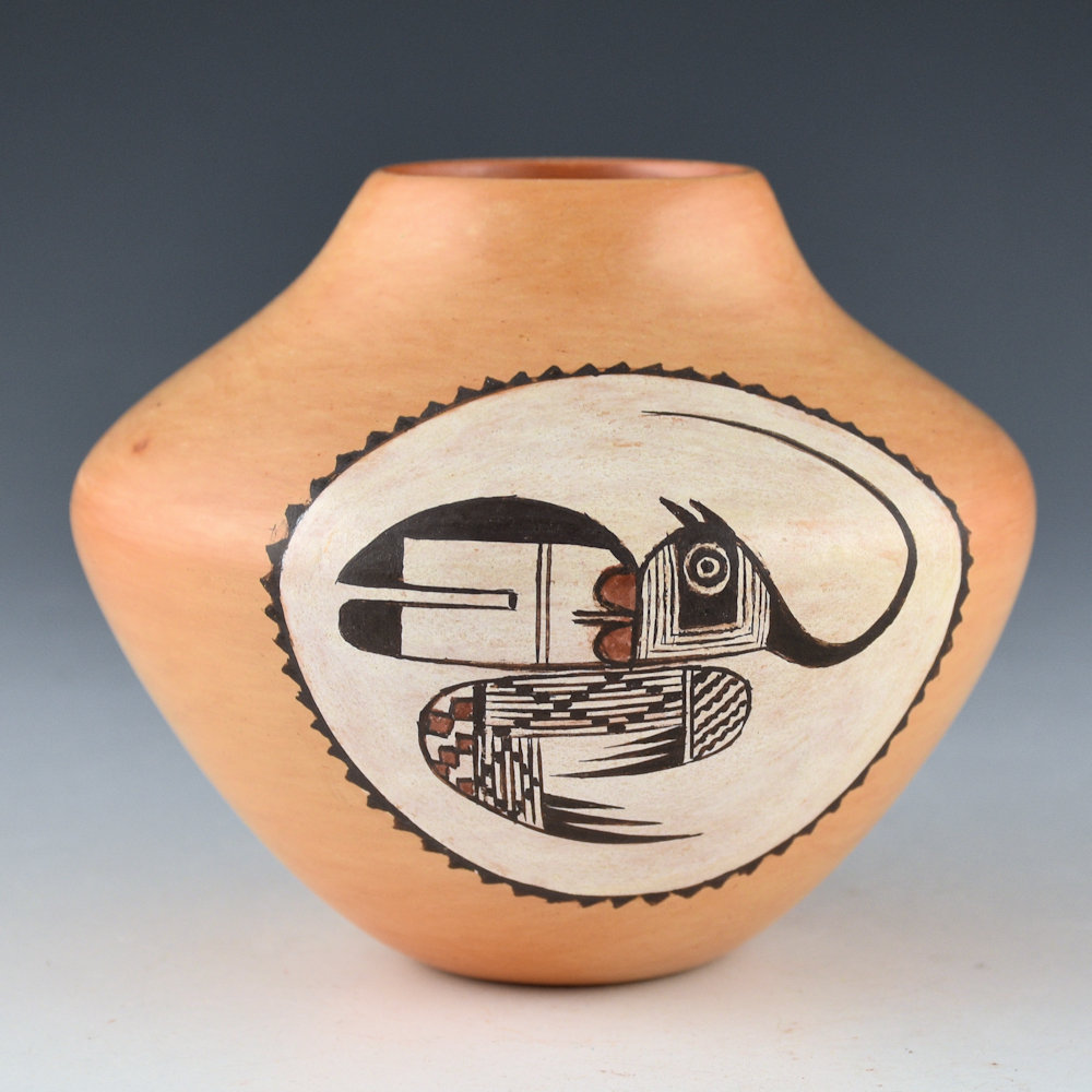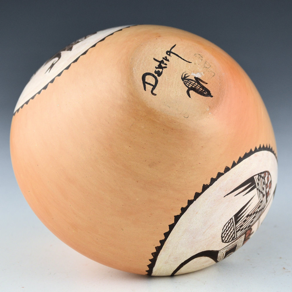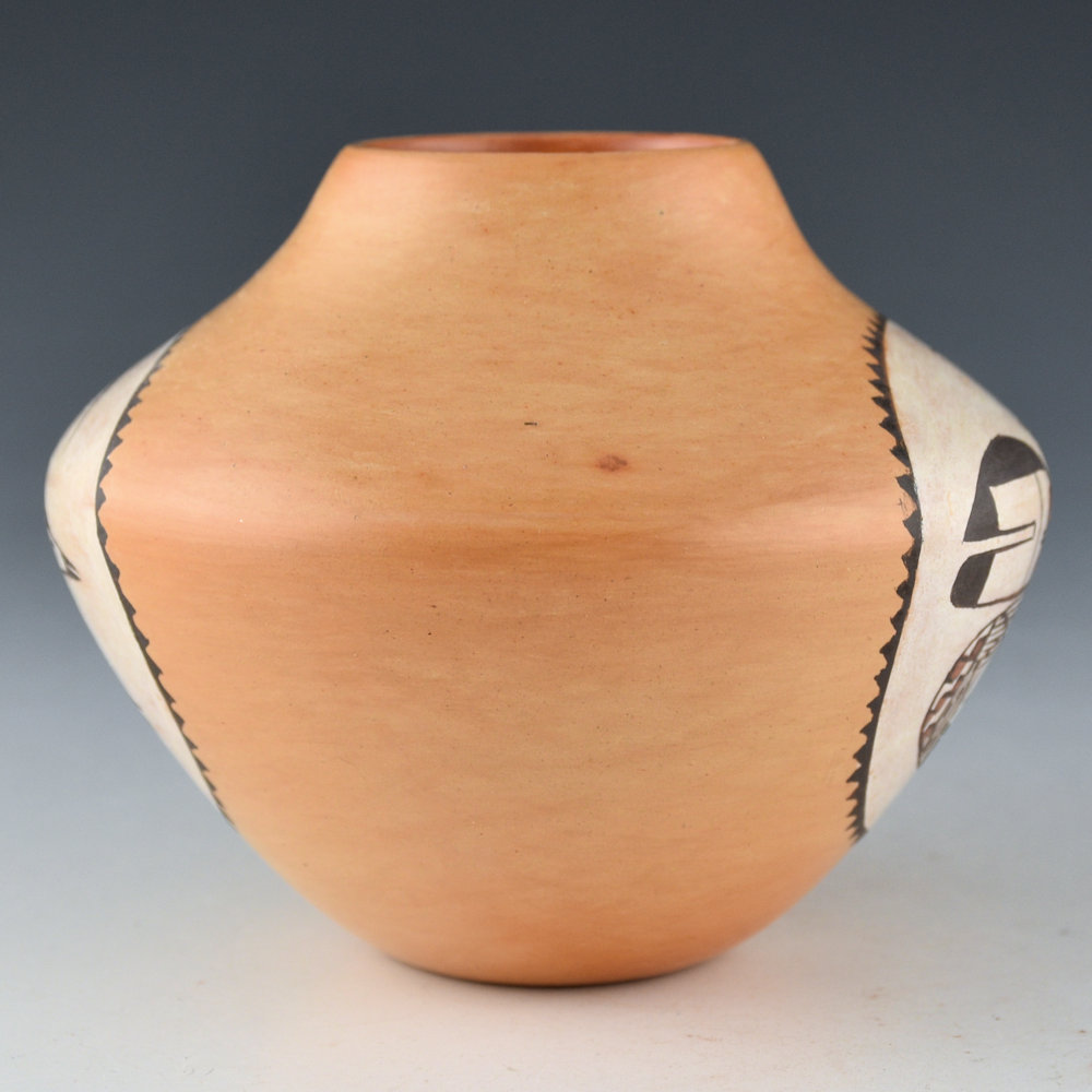 This is an incredibly intricate small jar by Dextra Quotskuyva. It was made in the early 1980s and has a high shoulder and a short neck. The jar is polished with the natural color of the clay and a tan clay on the inside of the rim. There is a medallion on each side. One side has a tightly painted lizard. I thought this always looked like a fox or some other animal, but when I was at Dextra’s house working on Spoken Through Clay, I showed her a piece with this same design. She said it was a lizard, so that’s what I continue to call it. The opposite side is a design I have never seen before. It looks like a beetle. Check out the details in the head and the checkerboard designs below. It is outstanding! It is an exceptional piece for its size and reflects Dextra’s detail in painting! It was traditionally fired so that there are blushes and color variations around the surface. It is signed on the bottom with bee-weed, “Dextra” with an ear of corn representing the Corn Clan. It is in excellent condition with no chips, cracks, restoration or repair.