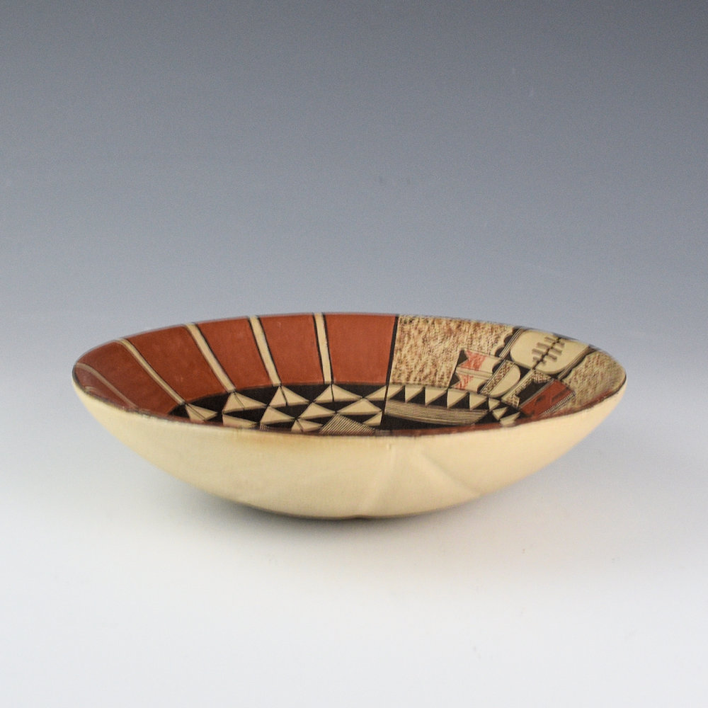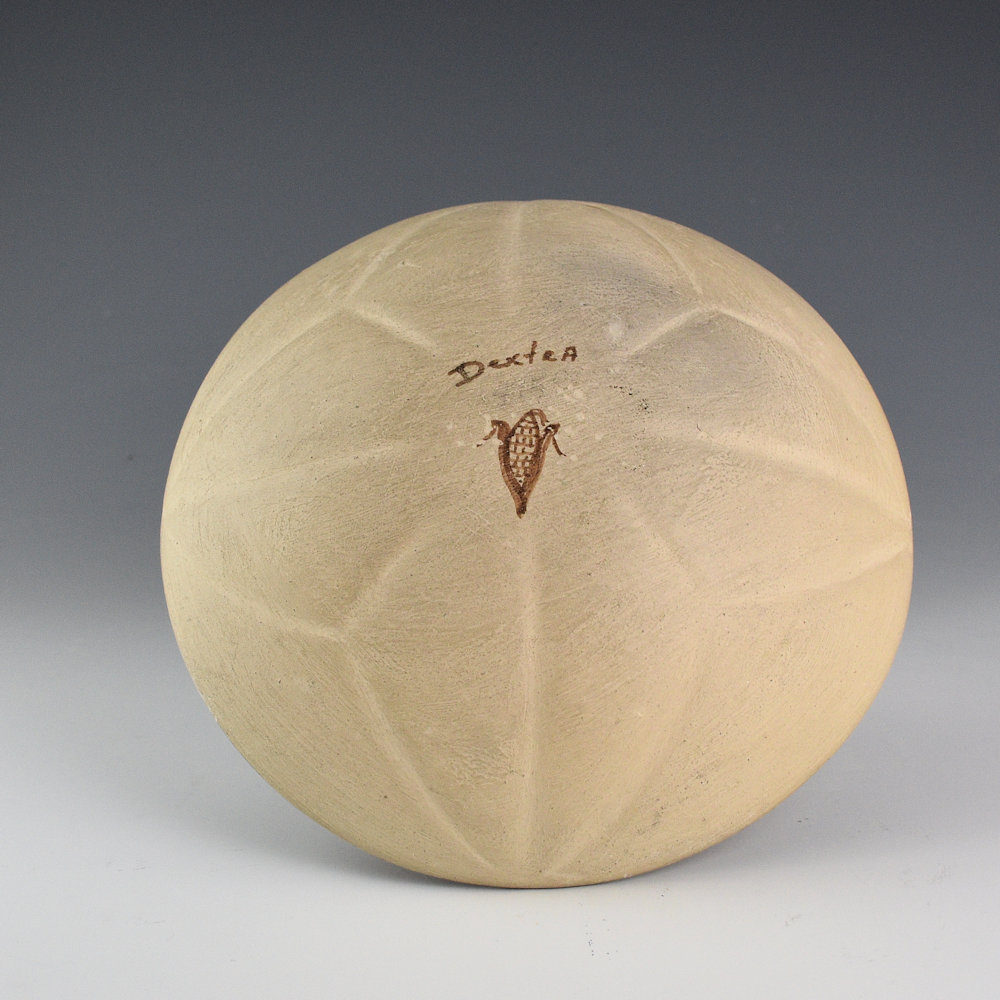 This is a complex open bowl by Dextra Quostkuyva Nampeyo. She was certainly one of the most influential Hopi-Tewa potters of the last 50 years. Not only did she teach numerous potters (Steve Lucas, Yvonne Lucas, Les Namingha, Loren Ami, Hisi Nampeyo, to name just a few), but her creative designs and forms have dramatically influenced the pottery itself. The back of the bowl is incised are carved with a flower design. The front is painted with a large katsina figure holding a child or “cradleboard” katsina. The katsina is complex in design using fine-lines and various colors of clay to the face. Note how she used a white clay over the polsiehd red and brown areas. The rim of the plate has polsihed brown areas. In the early 1980s, Dextra was innovative with texture, carving, and materials. Think of the time period in 1980, when most Hopi potters were creating a very classic range of designs, and how wild this must have appeared! There is a creative drive to the piece, much like in that of her ancestor Nampeyo of Hano. The jar was traditionally fired, creating strong blushes on the surface. This bowl is signed on the bottom, “Dextra” and an ear of corn for Corn Clan. It is in excellent condition with no chips, cracks, restoration, or repair. Definitely a classic of her creative clay art!