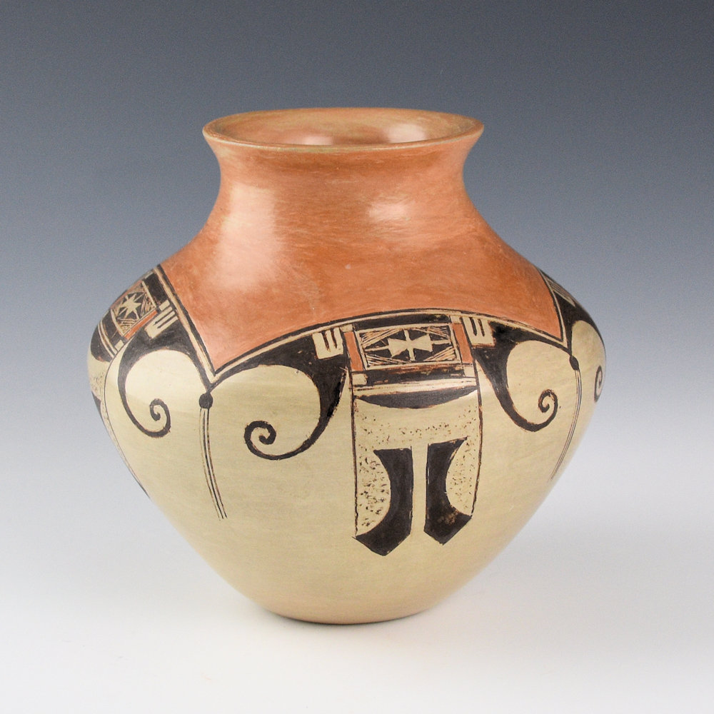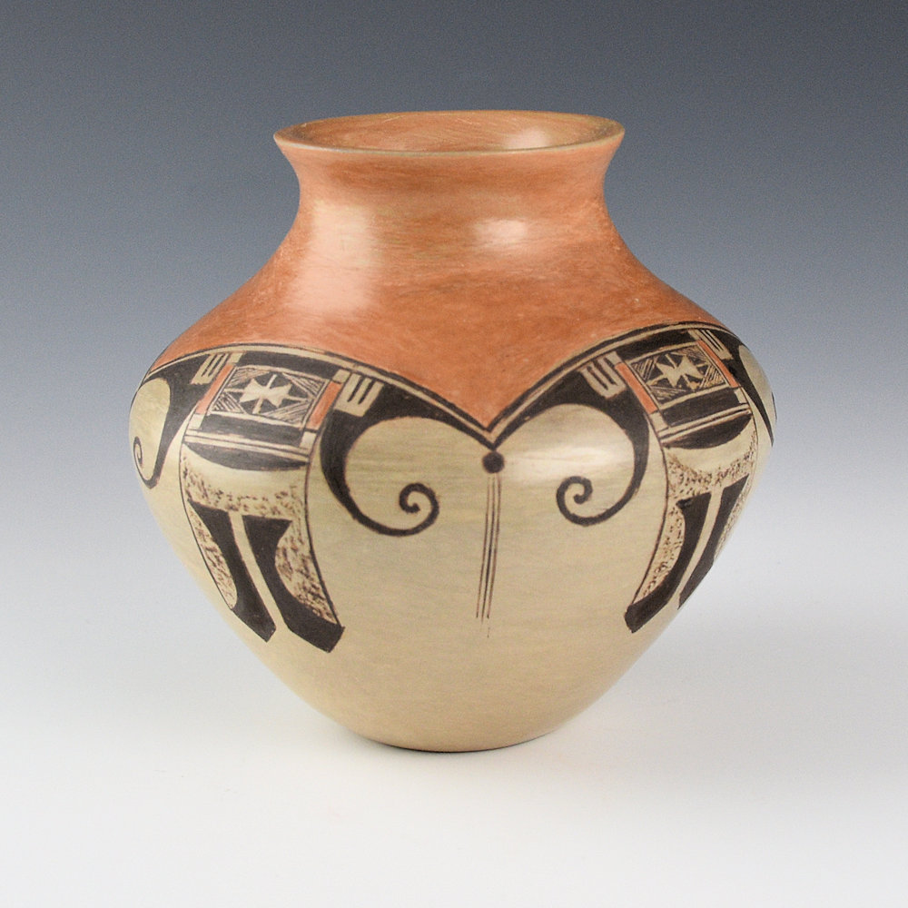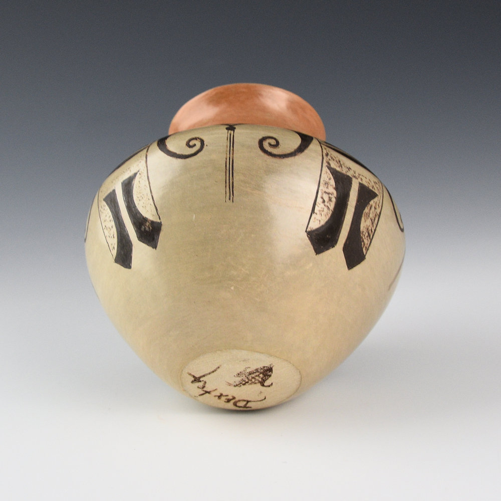 This is a classic jar by Dextra Quotskuyva. She is certainly one of the great innovators among Hopi-Tewa potters. Her work began with more classic imagery and then has evolved over the years to more unique and stylized designs. This piece is from the mid 1980s. It has a round shoulder and a short neck with a turned-out rim. The neck and rim are polished tan while the top of the shoulder is red. The body of the jar has four eagle tails extending downward. They are painted with bee-weed. The TINY lines are simple perfection and a reflection of Dextra’s early fame. The jar was traditionally fired to create the blushes on the surface. The tight, creative painting, the unique shape, and the high stone polished surface are all reflective of the high quality pieces created by Dextra. The bottom of the jar is signed with her incised “Detra” with an ear of corn representing the Corn Clan. The jar is in excellent with no chips, cracks, restoration or repair. Dextra has been the subject of a retrospective of her pottery at the Wheelwright Museum entitled, “Painted Perfection“.