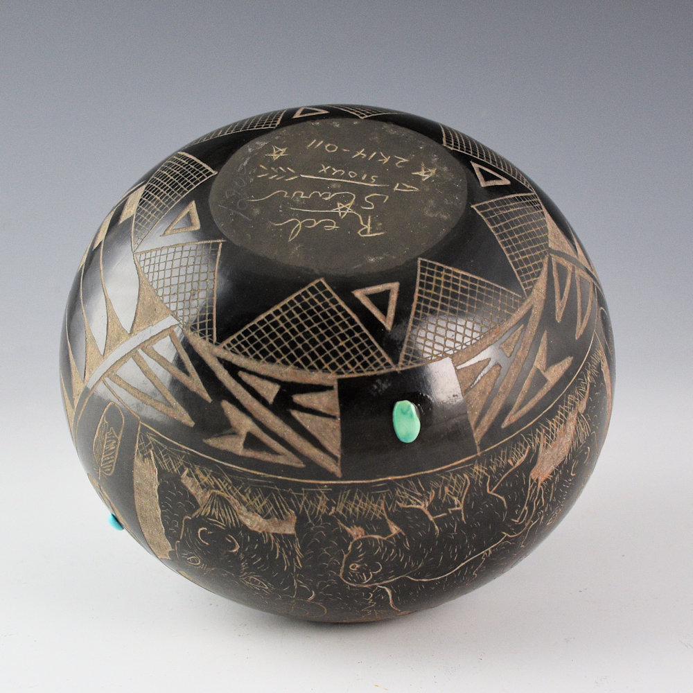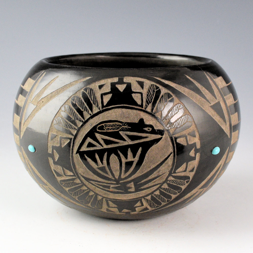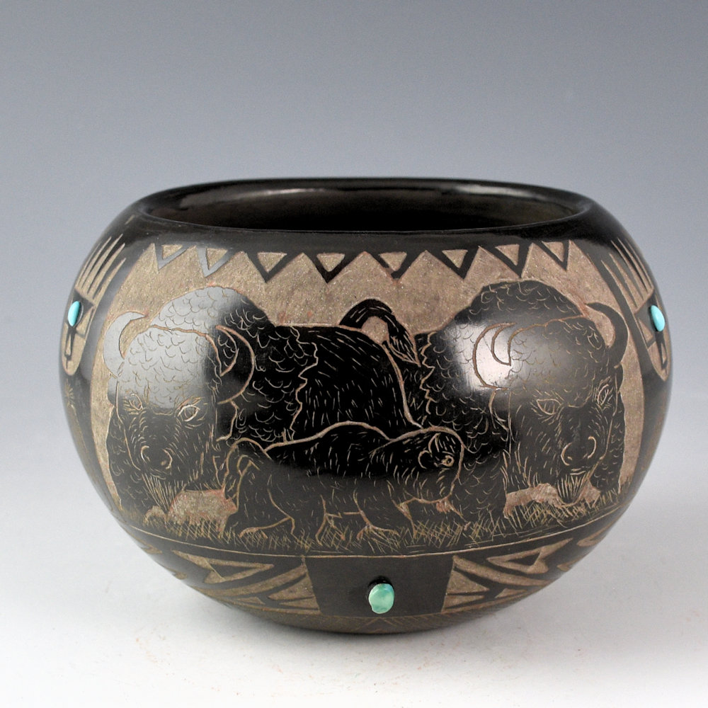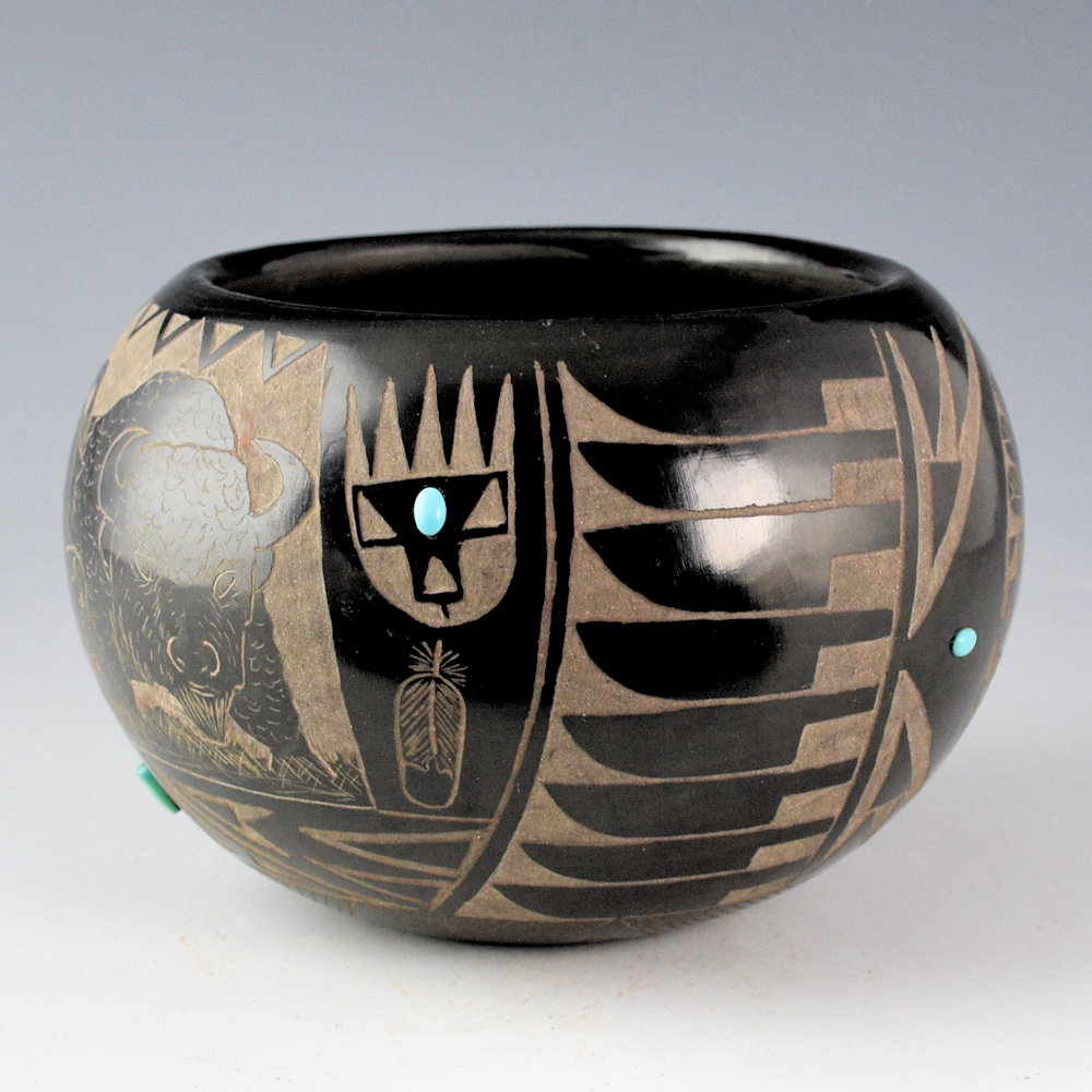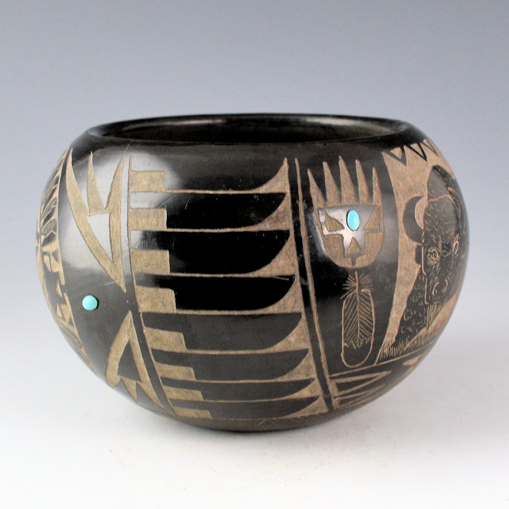 Red Starr (Sioux) was married to Santa Clara potter Harriet Tafoya and learned to make Santa Clara pottery. This bowl is a larger piece of his work. It is fully polished and fired black. The bowl is etched after firing. There is a heartline bear on one side, surrounded by a feather pattern. The opposite side has a scene with three buffalo. Separating the sections bear paws, feathers, and Sioux eagle feathers. The bowl has additional inset pieces of turquoise. It is in excellent condition with no chips, cracks, restoration, or repair. It is signed on the bottom in the clay, “Red Starr”.