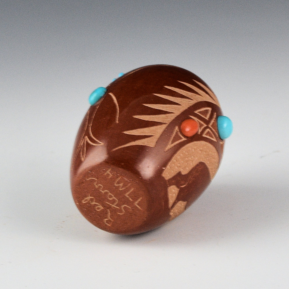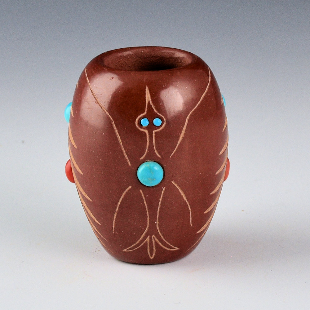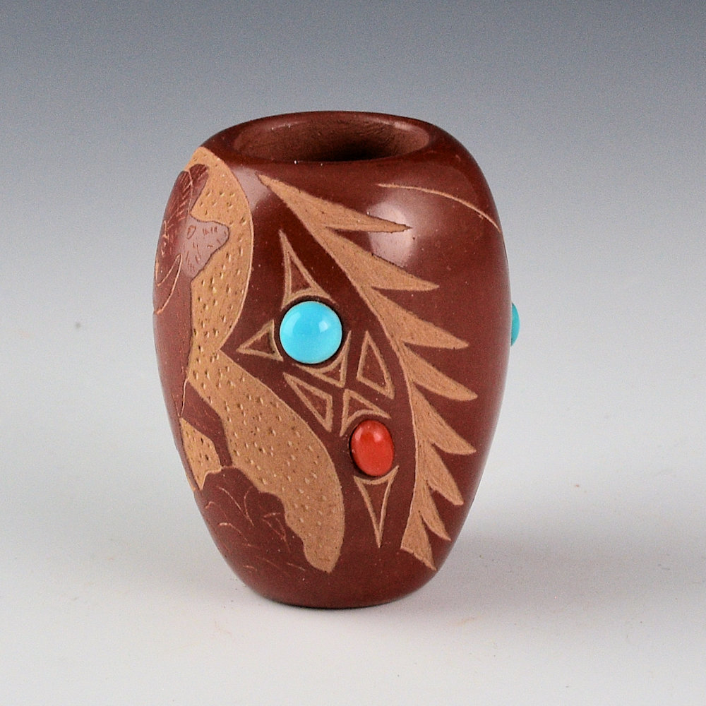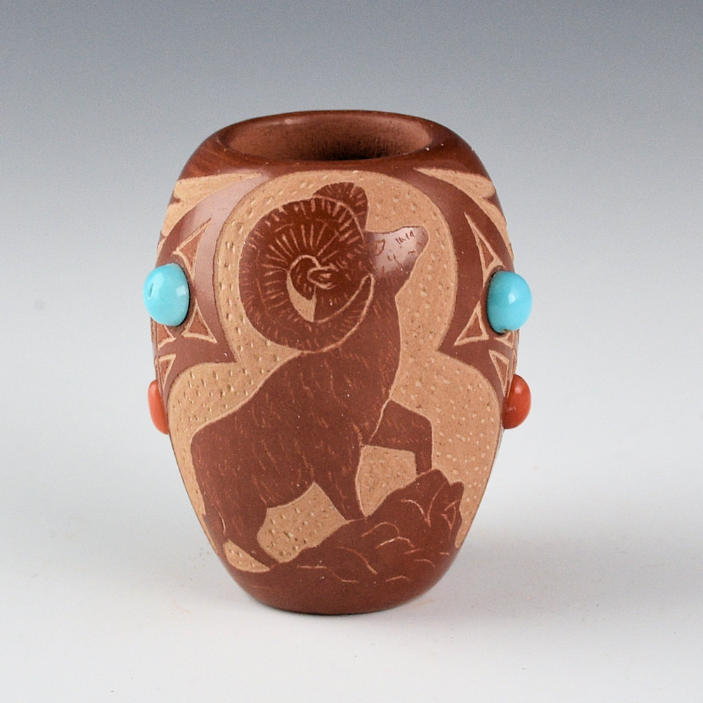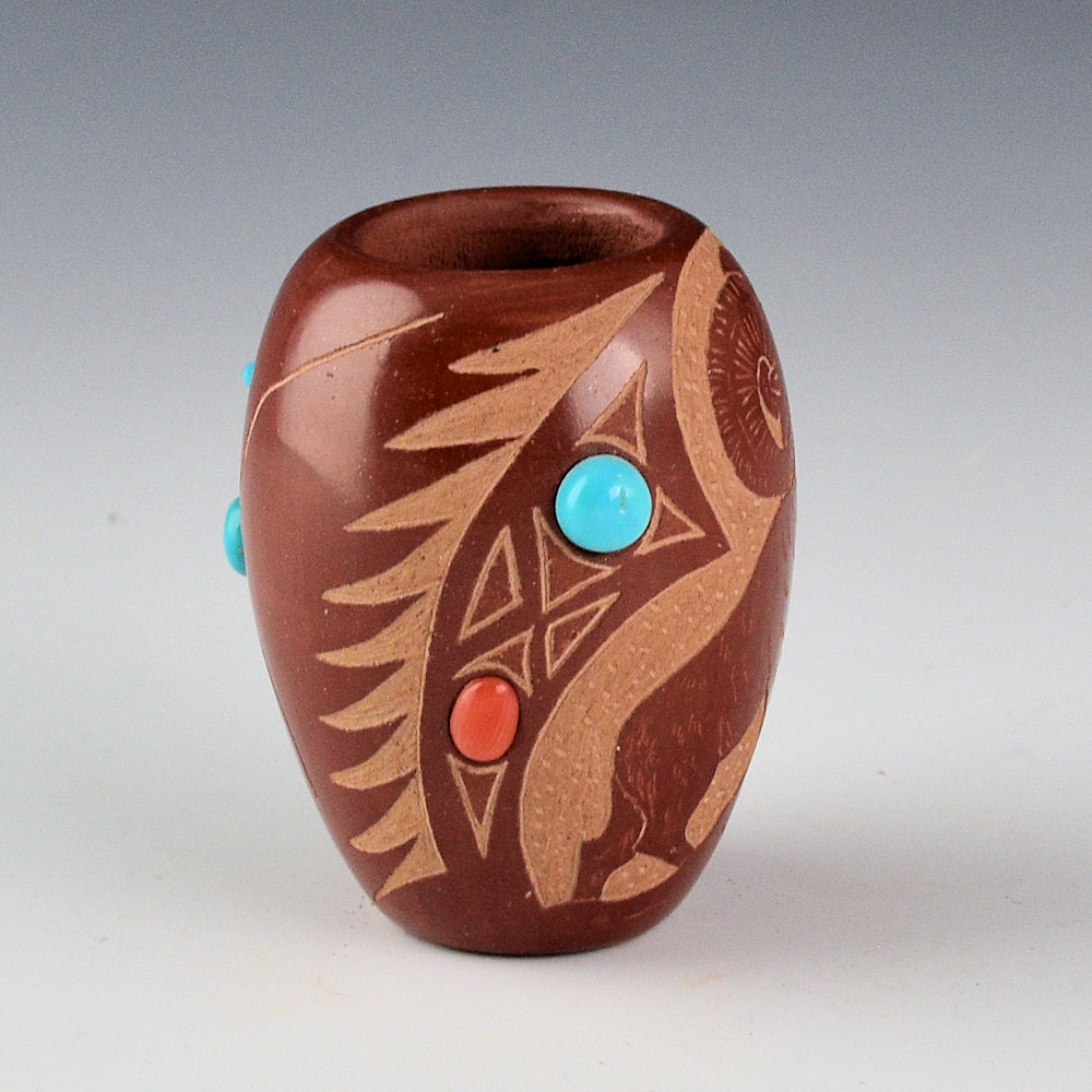 Red Starr (Sioux) was married to Santa Clara potter Harriet Tafoya and learned to make Santa Clara pottery.  This small jar is fully polished and fired red.  There is a realistic Big Horn Sheep on one side.  The opposite side has a Thunderbird.  On either side of the Big Horn Sheep are inset coral and turquoise. The thunderbird has inset turquoise for its eyes and in the center of its body.   It is in excellent condition with no chips, cracks, restoration, or repair.  It is signed on the bottom in the clay, “Red Starr”.