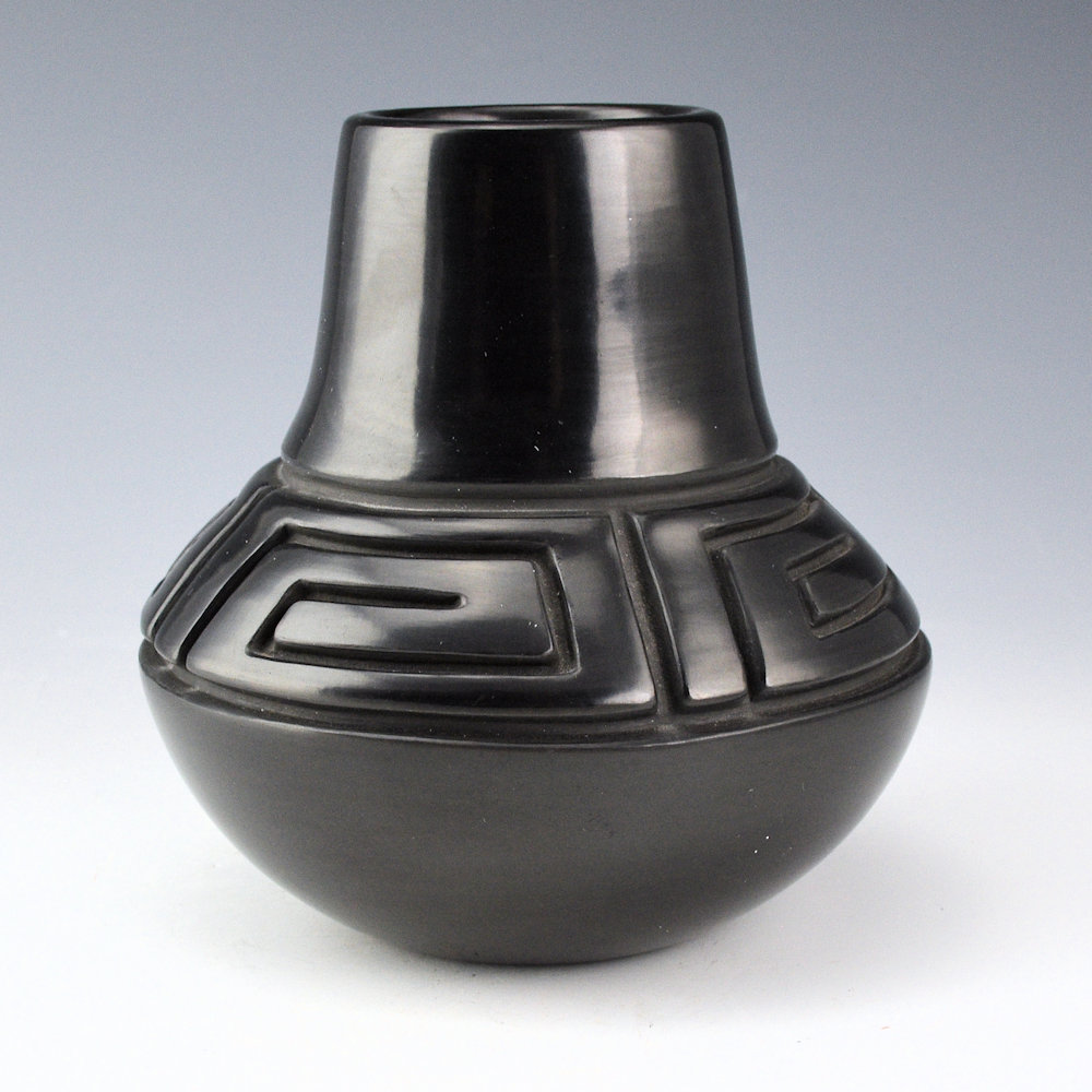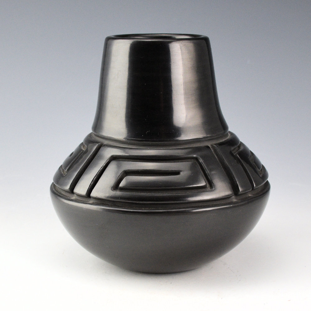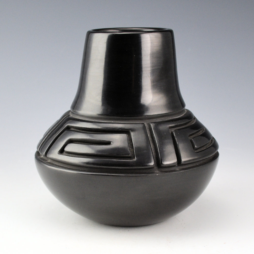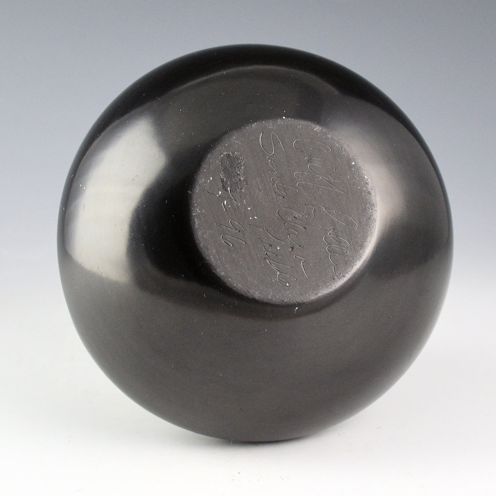 Cliff Roller is a son of noted potter Toni Roller. Each piece is coil-built and stone-polished. This jar has a round body and an elongated neck. The neck is fully polished and the body of the jar has four carved cloud designs. It is deeply carved and highly polished. The jar is signed on the bottom in the clay, “Ciff Roller”. It is in excellent condition with no chips, cracks, restoration or repair. While Cliff makes very little pottery these days, each piece remains a statement to his skill as a potter! The jar ha a Blue Ribbon from the 1996 Eight Northern Pueblos Show.