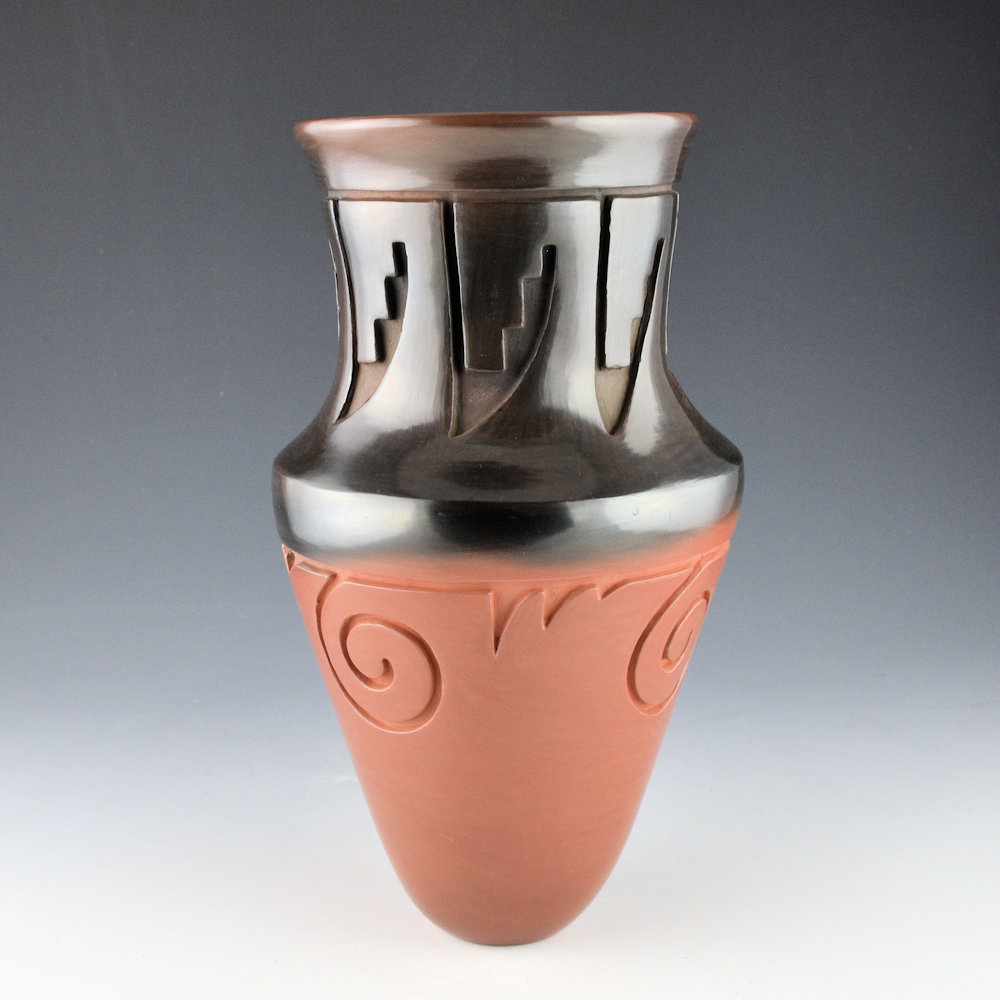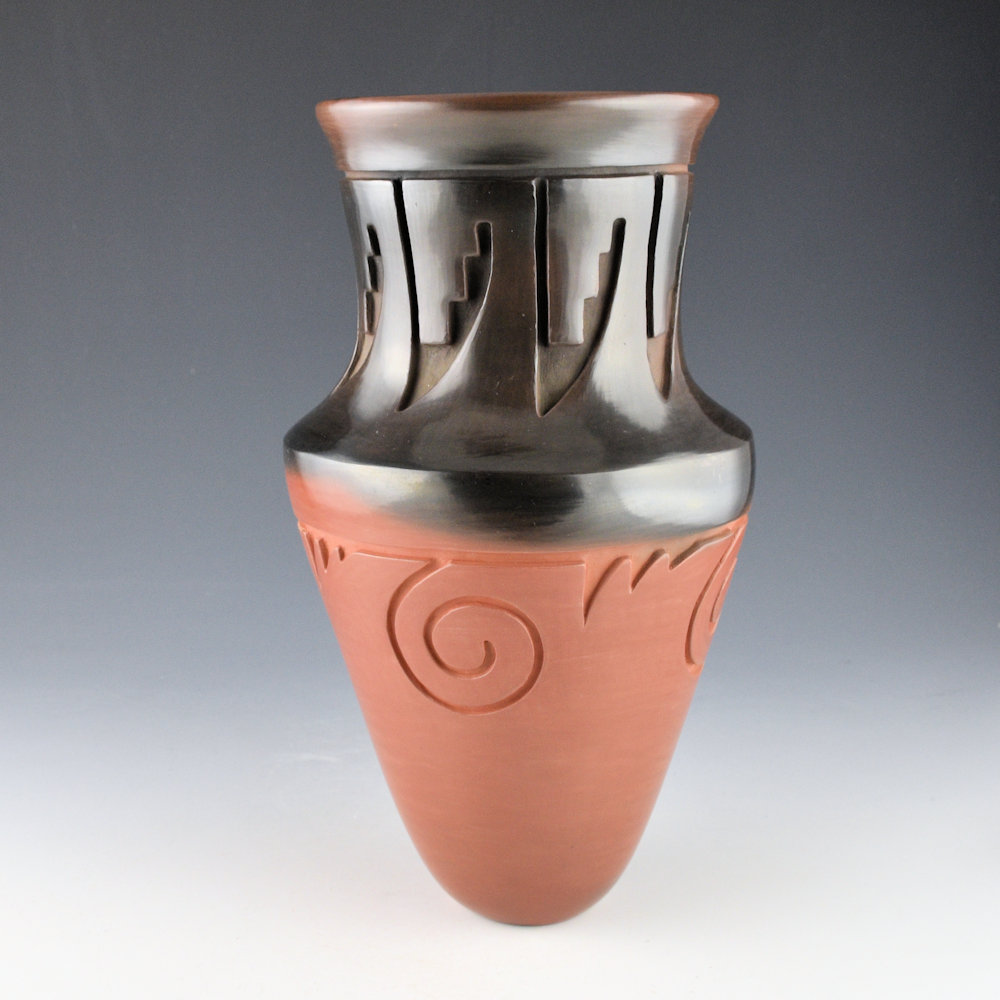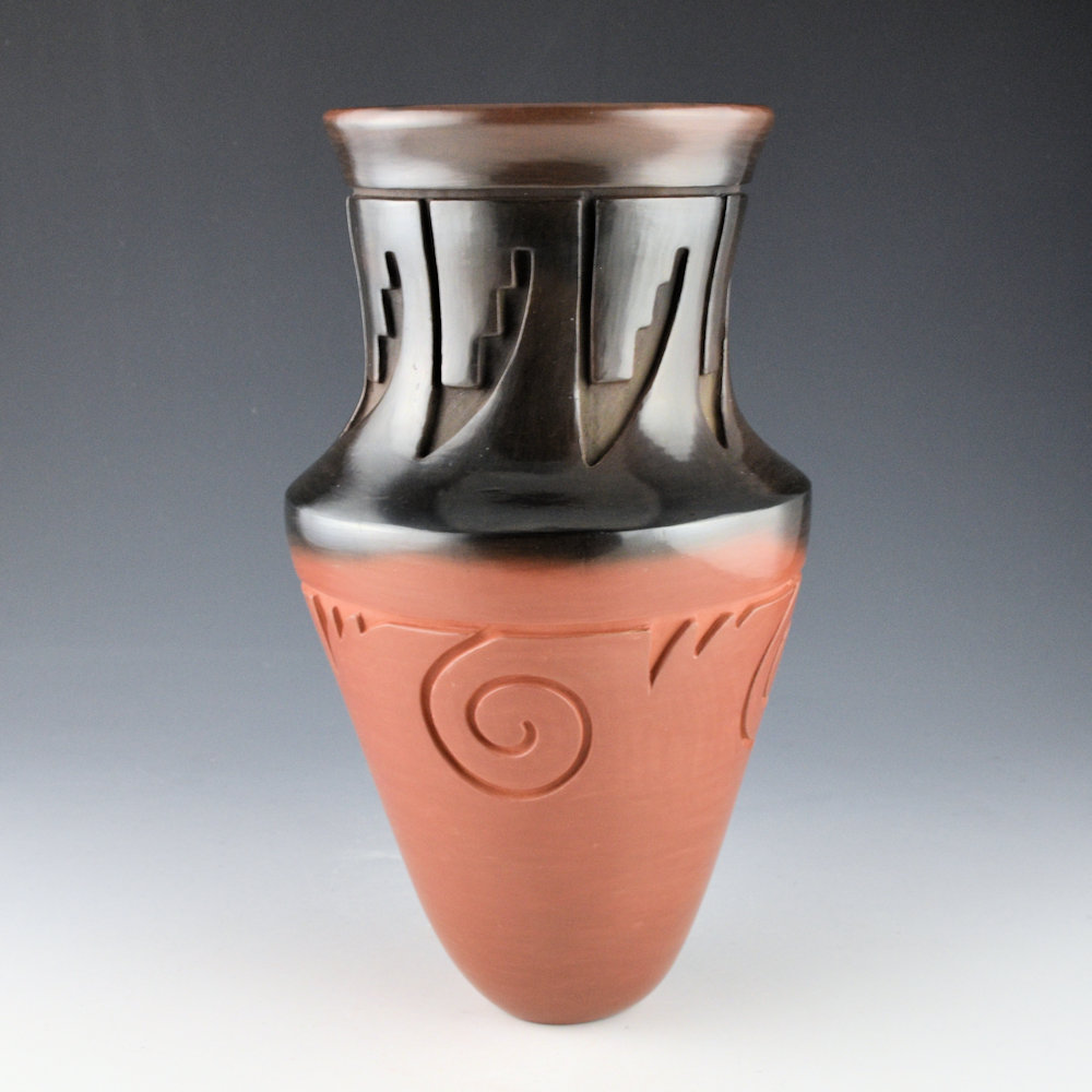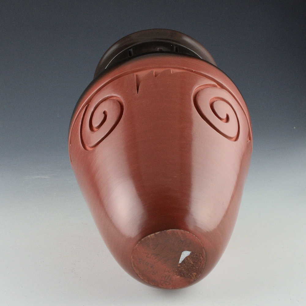 Ryan Roller is a son of Jeff Roller and a grandson of noted potter Toni Roller. Each piece is made from native clay, coil-built, carved, polished, and traditionally fired. This jar has a sharp shoulder and turned out rim. The neck of the jar has carved feathers. There are carved clouds below the shoulder. The jar was polished red and the coloration is from the firing. This “two-tone” piece incorporates a traditional red firing with aspects of the black firing and the reduction technique using manure to make a piece black. Here, he has just made the area from the shoulder to the neck black, while the remainder is a dark, almost purplish-brown. The coloration is striking, and the carving is deep and precise. It is signed, “Ryan Roller”. It is in excellent condition with no chips, cracks, restoration, or repair.