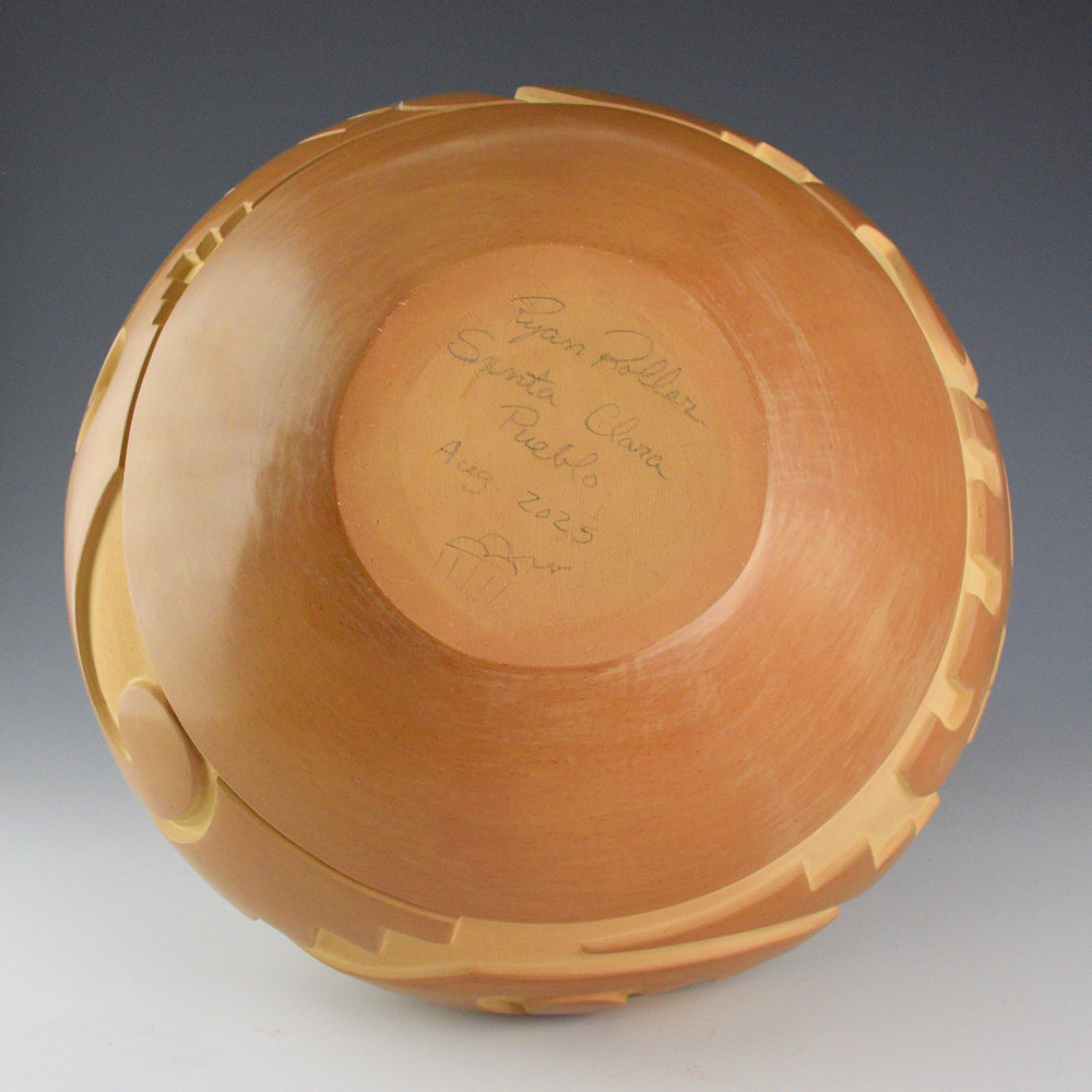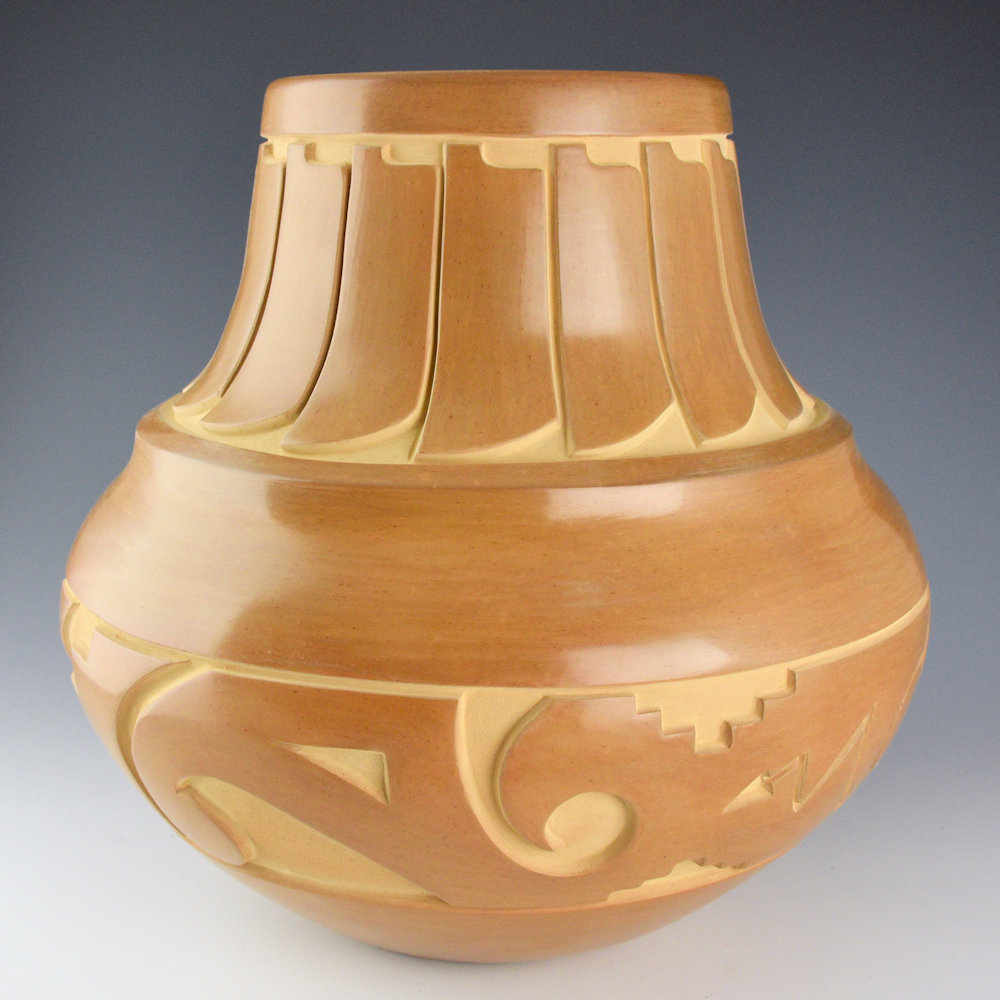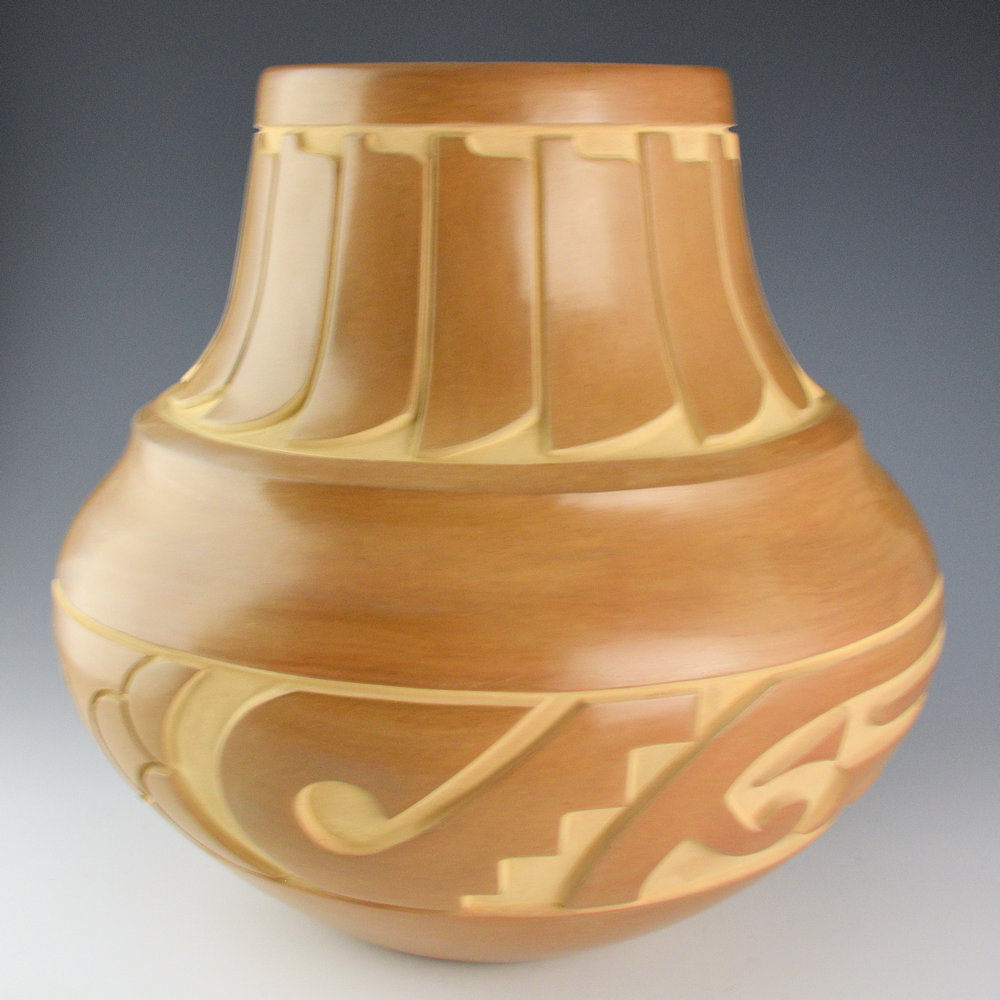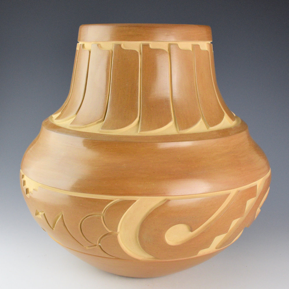WOW!  This is a spectacular large double shoulder water jar by Ryan Roller.  Ryan is a grandson of Toni Roller and a son of Jeff Roller.  He has been making pottery since he was a child it is his recent work that has risen to a new level of sophistication in form, polish, carving, and firing techniques.  This new jar has an elegant form with a double shoulder and elongated neck. The neck is deeply carved with sixteen feathers.  The double shoulder or “rainbow ridge” is fully polished. The bottom of the jar has carved old-style avanyu, cloud, rain and kiva step designs.  This is the first all tan piece we have had from Ryan and it is striking.  The jar is the natural color of the clay, and it is particular clay which was found by his grandmother, Toni around 2012.  The jar is just polished with water to create the shine, and it one of the most difficult techniques to achieve a polish.  Ryan said he had four pieces break before this one turned out!  The coloration is a yellow-gold, which simply glows!  There is an elegance to the form and design, especially the plain double shoulder where the color of the clay and the polishing are allowed to have such prominence. Stunning!  It is signed, “Ryan Roller”.