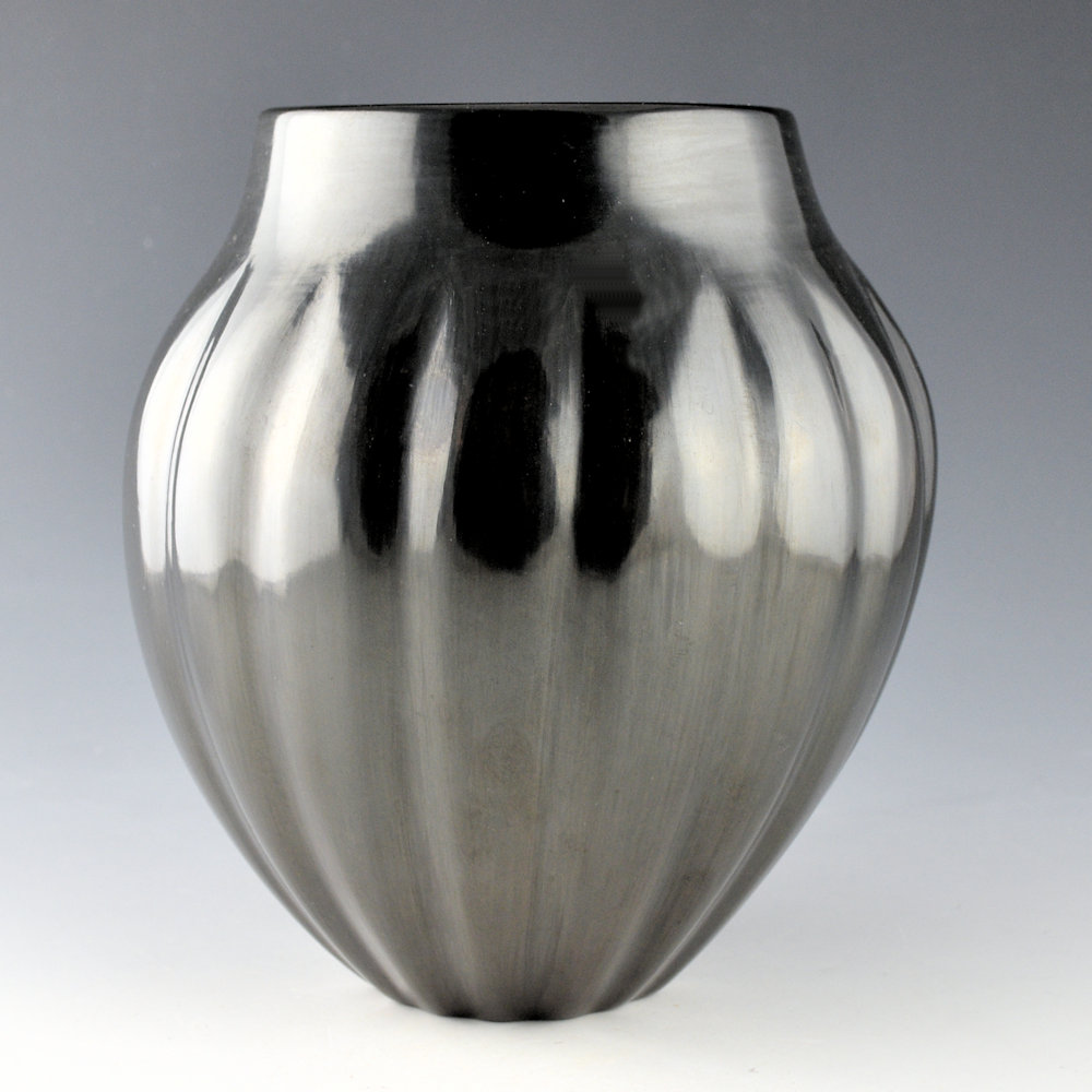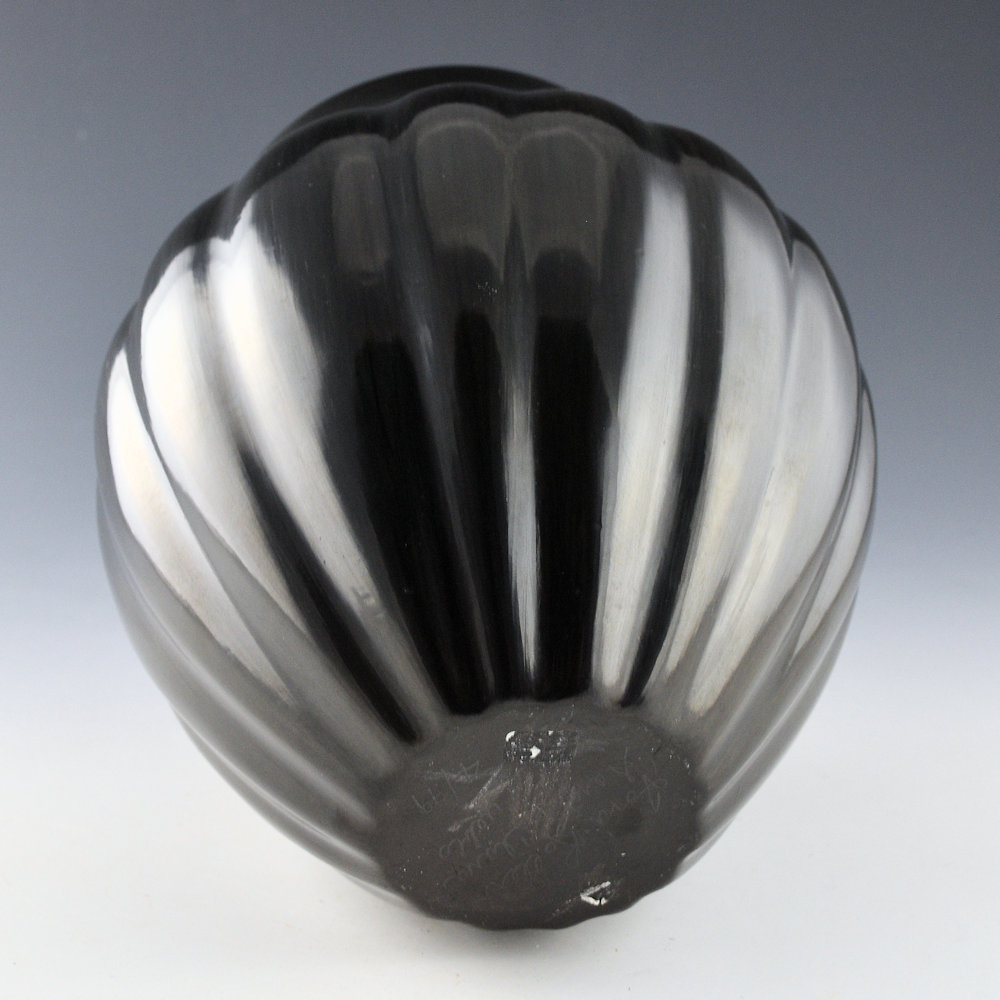 Toni Roller is known for her classic shapes and exquisite stone-polished pottery.  She is a daughter of Margaret Tafoya and has developed her own distinctive style yet adhering to the traditional methods and techniques of her mother.  This bowl is from 2006 and has a round body.  The bowl is carved with 16 melon ribs. Each rib is evenly spaced and carved into the clay.  The entire surface is fully polished to a high shine. It was traditionally fired and it is signed on the bottom in the clay, “Toni Roller”.  It is in excellent condition with no chips, cracks, restoration, or repair.