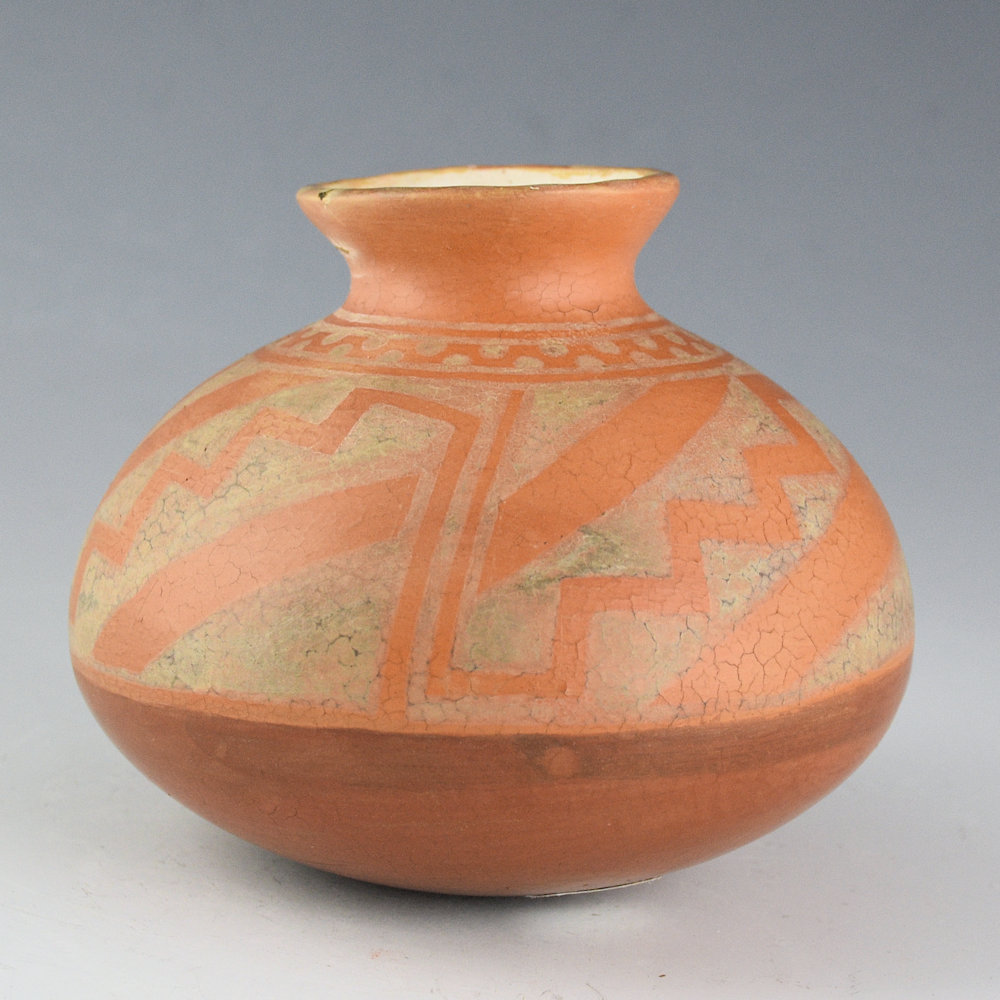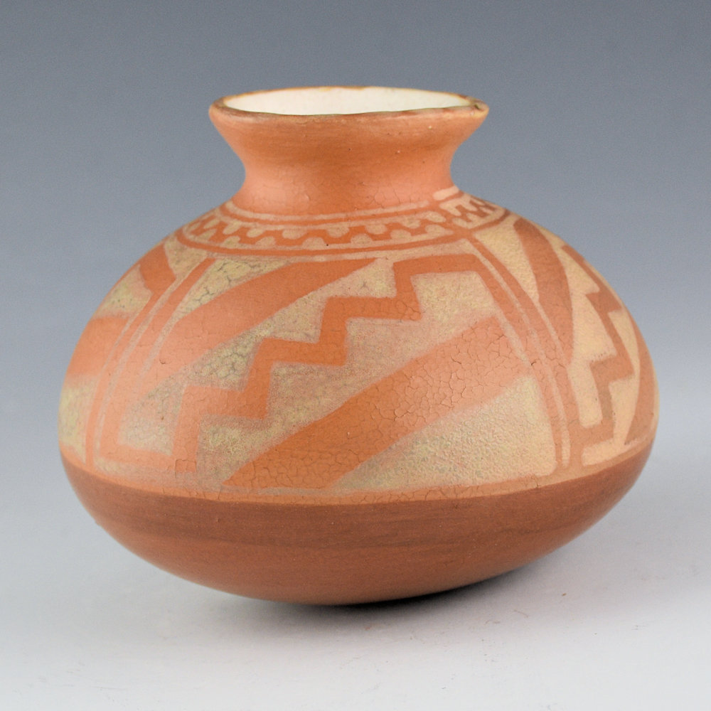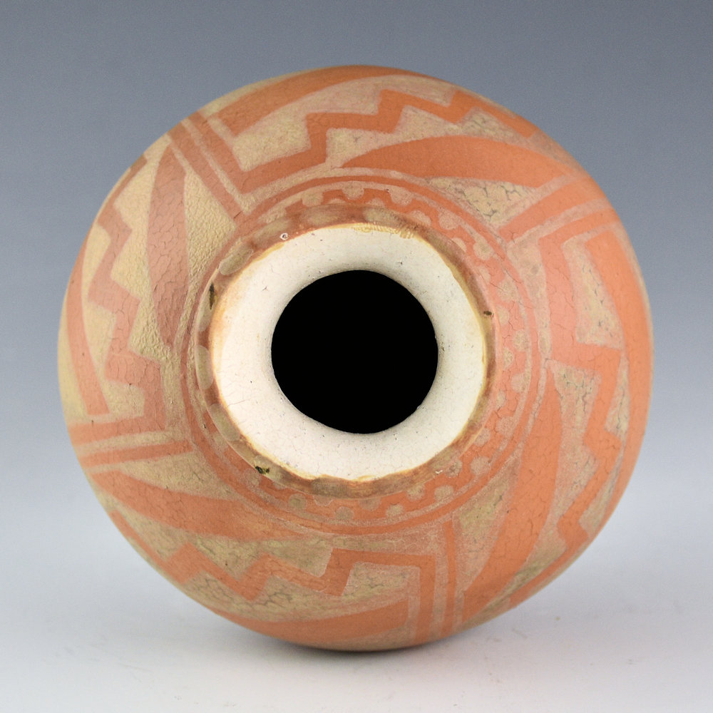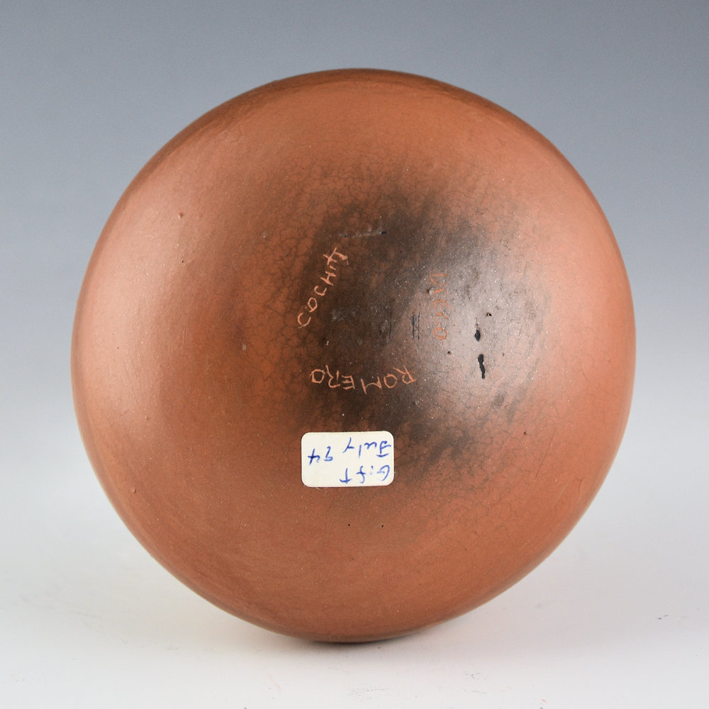 Diego Romero was one of the potters around 1990 to break away from more classic shapes and styles of pottery. He returned to a pre-contact style of Mimbres culture (1100’s in southwest New Mexico) and was inspired by the open bowl shape. This small jar is from 1994 and it is from the collection of gallerist Robert Nichols. The jar is in the style of ancient Ho-hokam pottery. It is painted with stylized designs and has polished base. There is small note that it was a gift to Robert from July 1994. The jar is signed, “Diego Romero”. It is in very good condition with no chips, cracks, restoration or repair. An interesting piece of early Diego Romero pottery history!