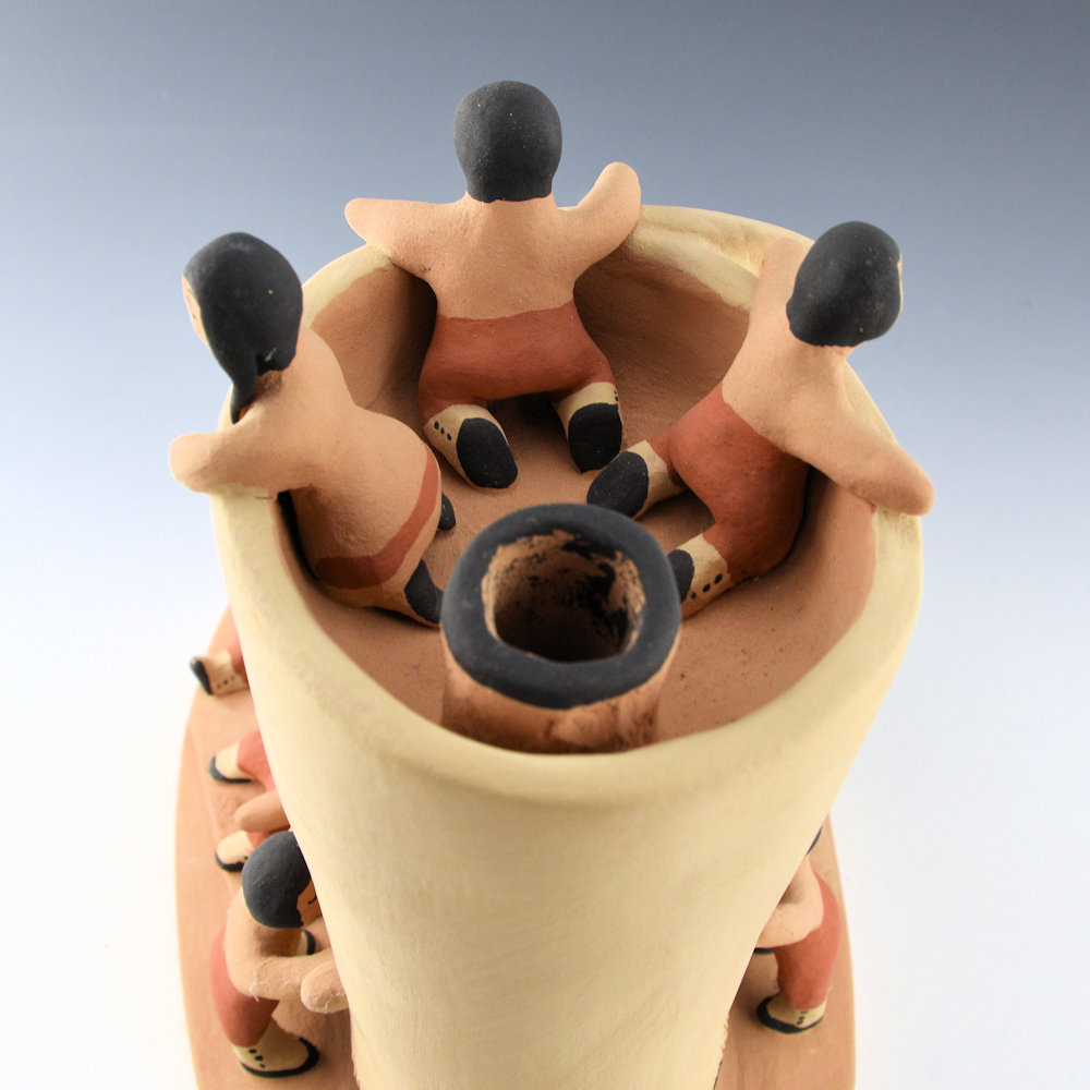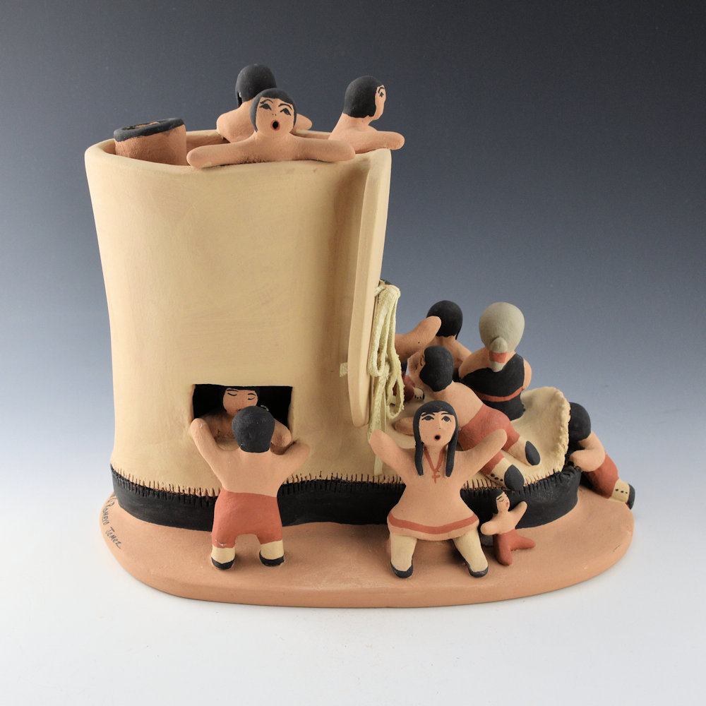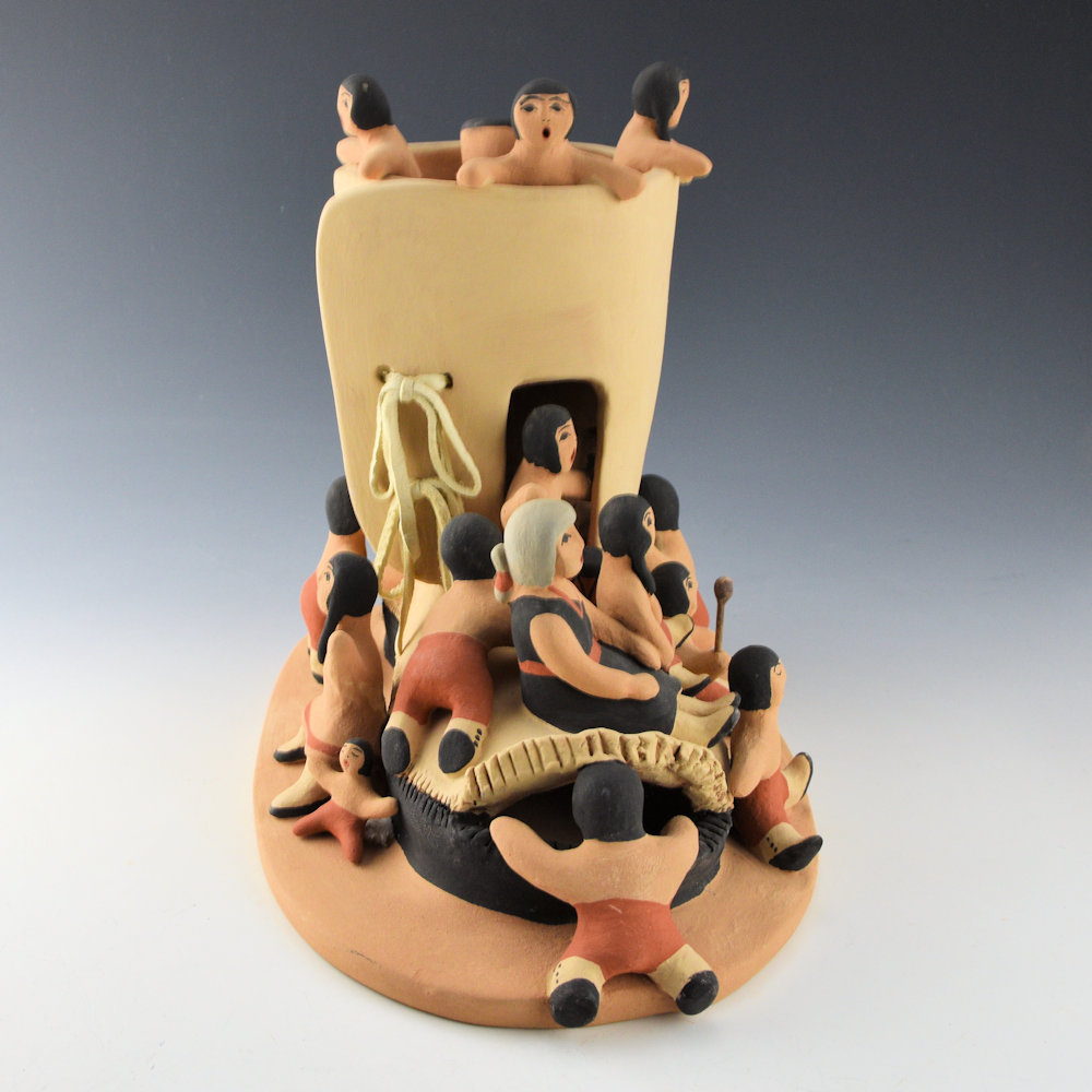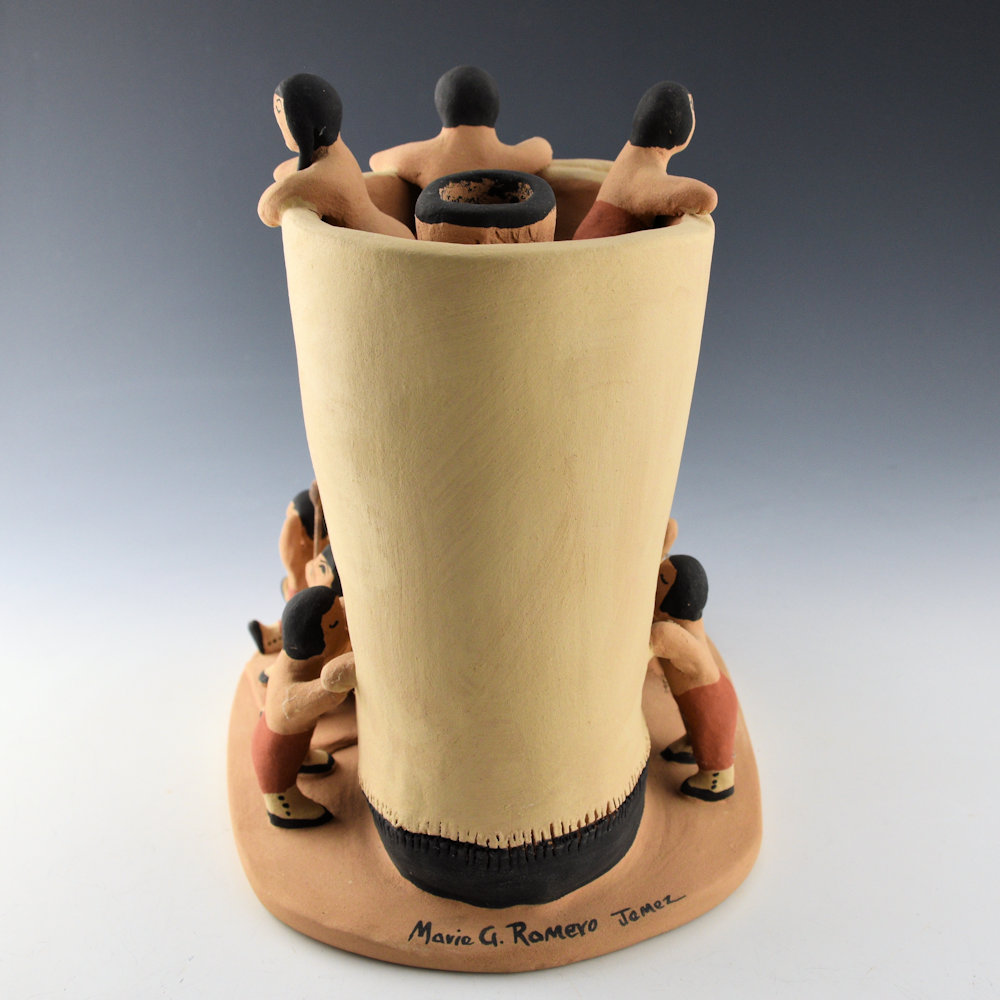 Marie Romero was one of the great traditional matriarchal potters from Jemez Pueblo. She learned to make pottery from her mother, Persingula Gachupin, and influenced her daughters Laura Gachupin and Maxine Toya. This is one of famous, “Old Woman and the Shoe” storyteller figures. For this piece, the shoe has been replaced with a Pueblo moccasin. There are 15 kids on the piece, each in a different pose. There are two “windows” looking out from the inside with the children in them. It is charming and very creative piece! The piece is made with native clay and painted with native clay slips. Marie had a wonderful way to capture Pueblo culture in her pottery. This piece is in excellent condition with no chips, cracks, restoration or repair.