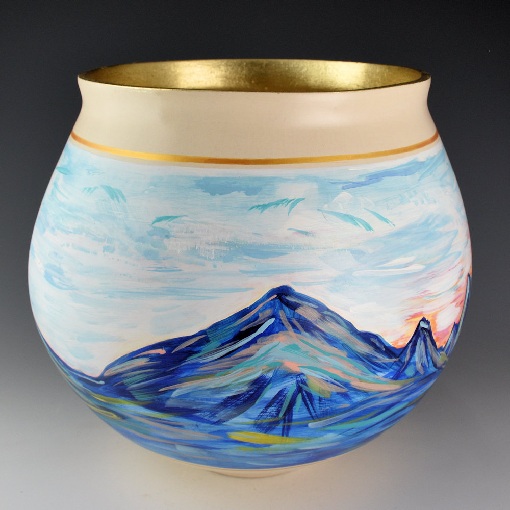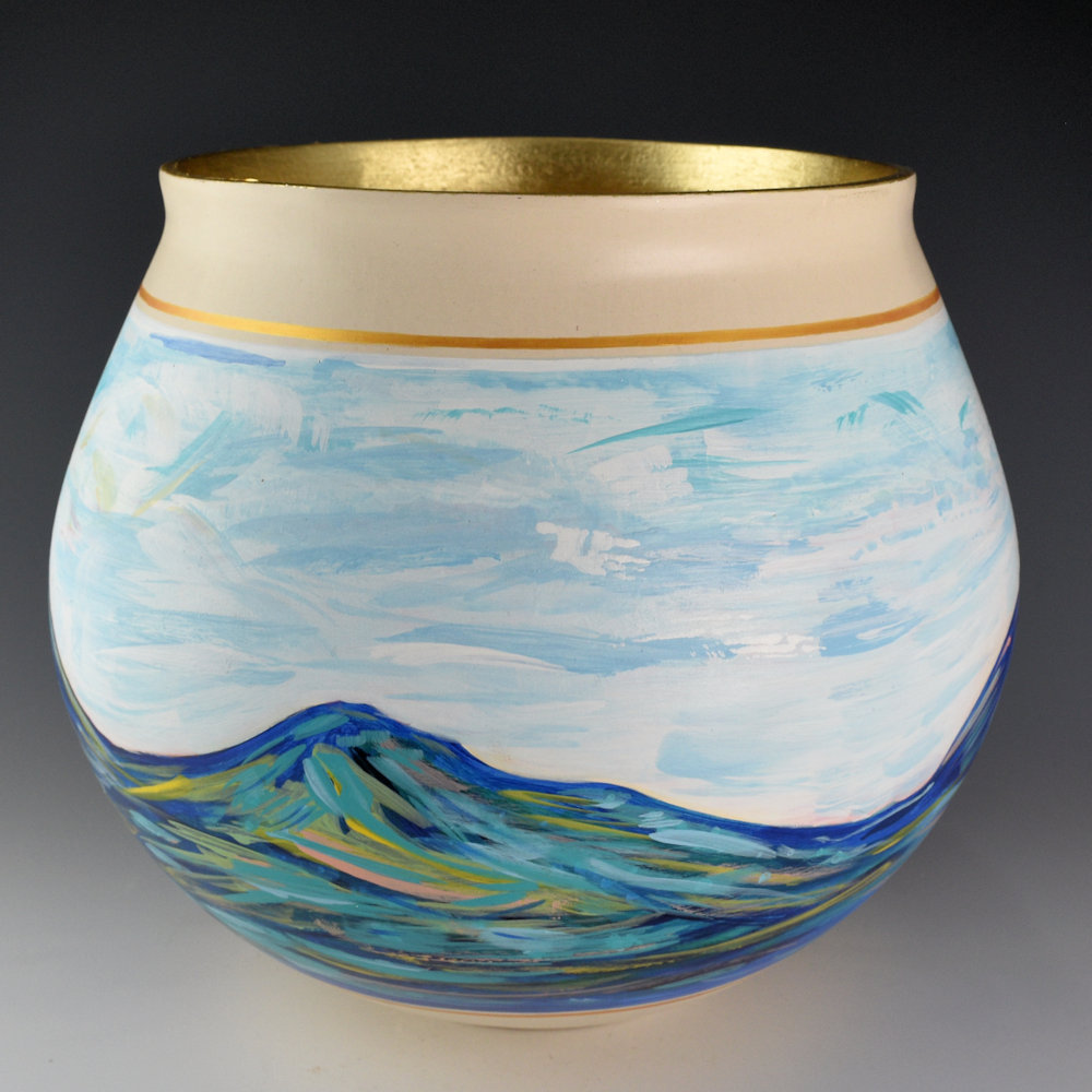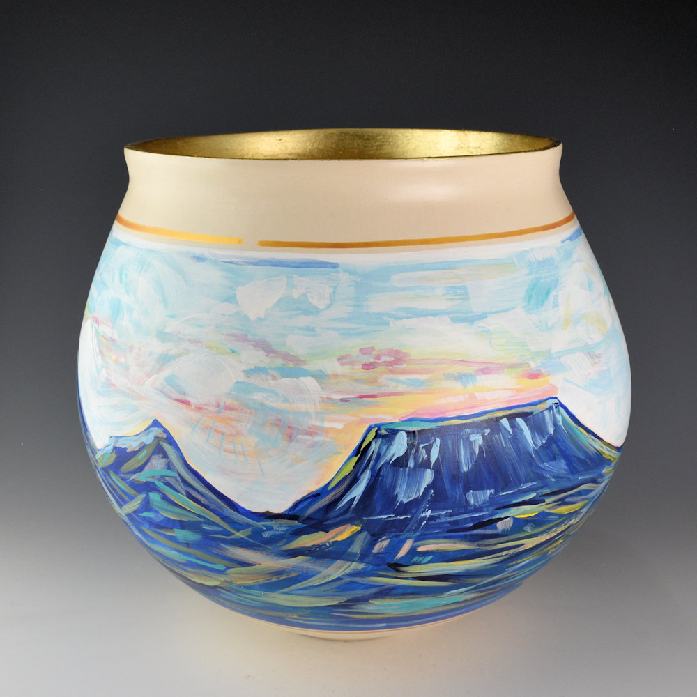 Santiago Romero is the son of noted Cochiti potter Diego Romero and nephew of Mateo Romero. In the past, he made figurative clay coyotes and smaller vessels. He is also known for his oil paintings. This jar is coil-built using white native clay. It has a round shape and turned out rim. The jar was fired and then painted with oil paints, and then sealed. The jar is entitled, “Black Mesa”. The jar has a striking blue sky and colorful mesas. The rim and the inside rim have gold leafing. The jar is a creative departure from his paintings on canvas. It is signed on the bottom, “Santiago”. It was made in 2025.
