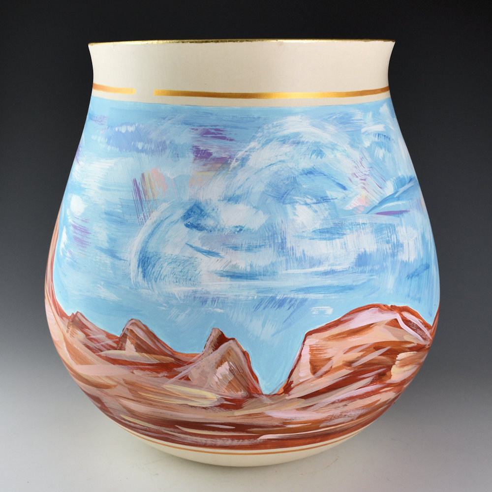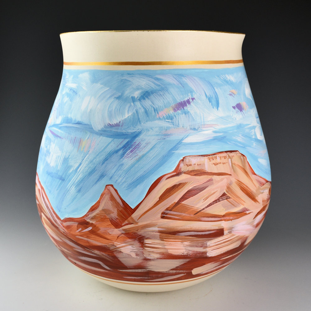 Santiago Romero is the son of noted Cochiti potter Diego Romero and nephew of Mateo Romero. In the past, he made figurative clay coyotes and smaller vessels. He is also known for his oil paintings. This jar is coil-built and has a low shoulder and turned out rim. The jar was fired and then painted. The jar is entitled, “North of Abiquiu”. The jar has a striking blue sky and red mesas. The rim and the inside rim have gold leafing. The jar is a creative departure from his paintings on canvas. It is signed on the bottom. It is exciting to see a new generation of Cochiti potters creating new stories in clay!