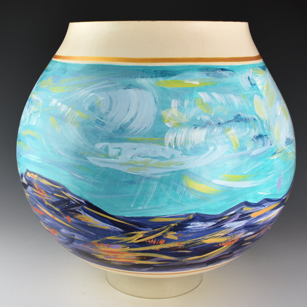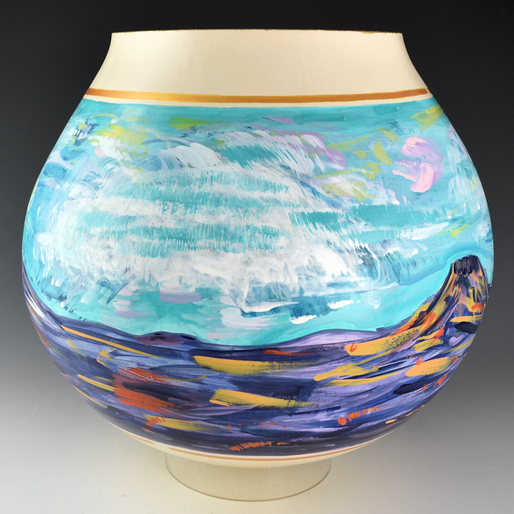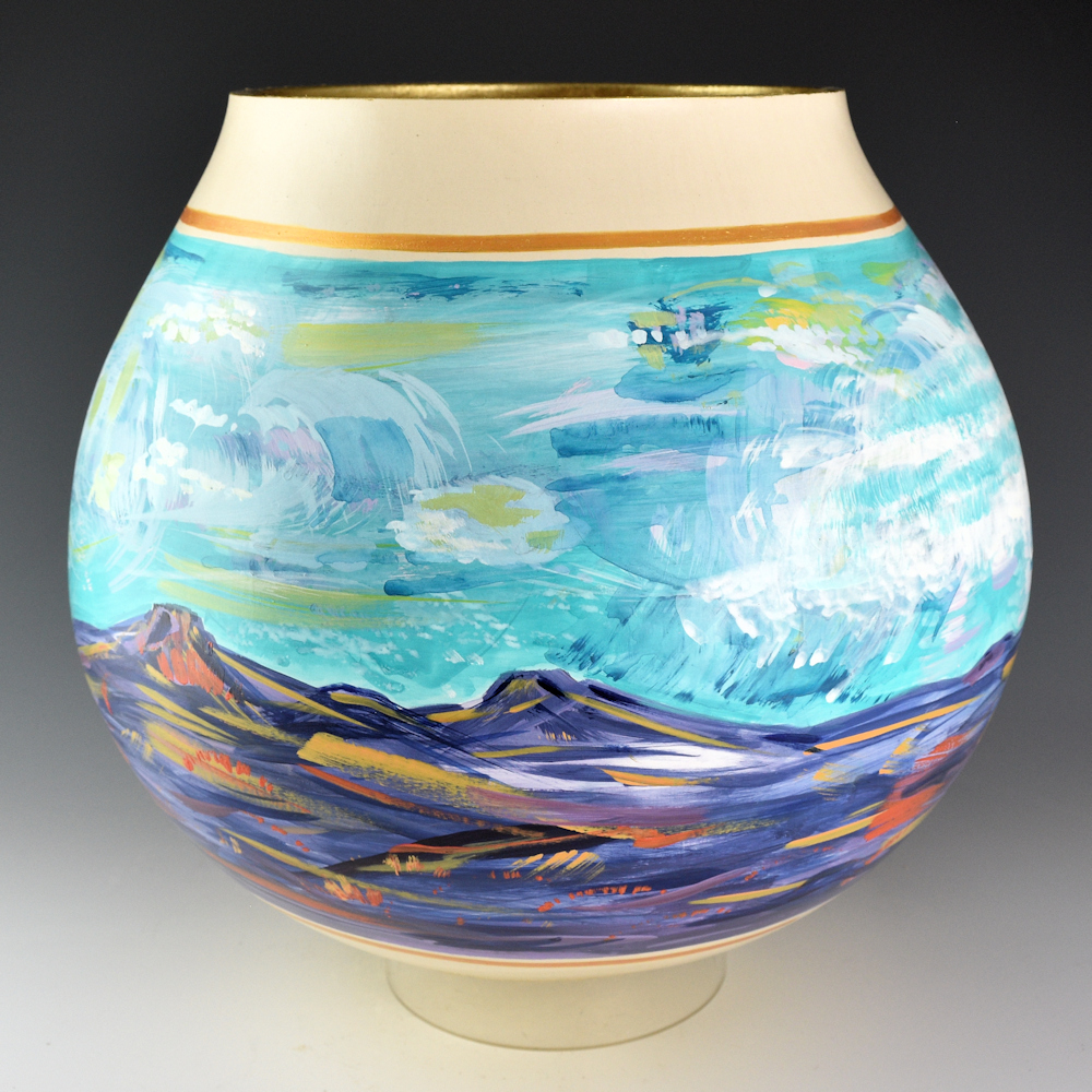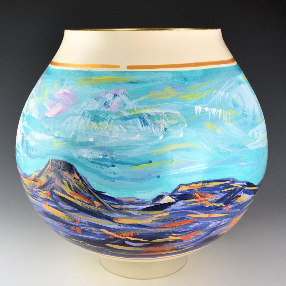 Santiago Romero is the son of noted Cochiti potter Diego Romero and nephew of Mateo Romero. In the past, he made figurative clay coyotes and smaller vessels. He is also known for his oil paintings. This jar is coil-built and has a round shape and turned out rim. The jar was fired and then painted. The jar is entitled, “Summer”. The jar has a striking blue sky and colorful mesas. The rim and the inside rim have gold leafing. The jar is a creative departure from his paintings on canvas. It is signed on the bottom. It is exciting to see a new generation of Cochiti potters creating new stories in clay!