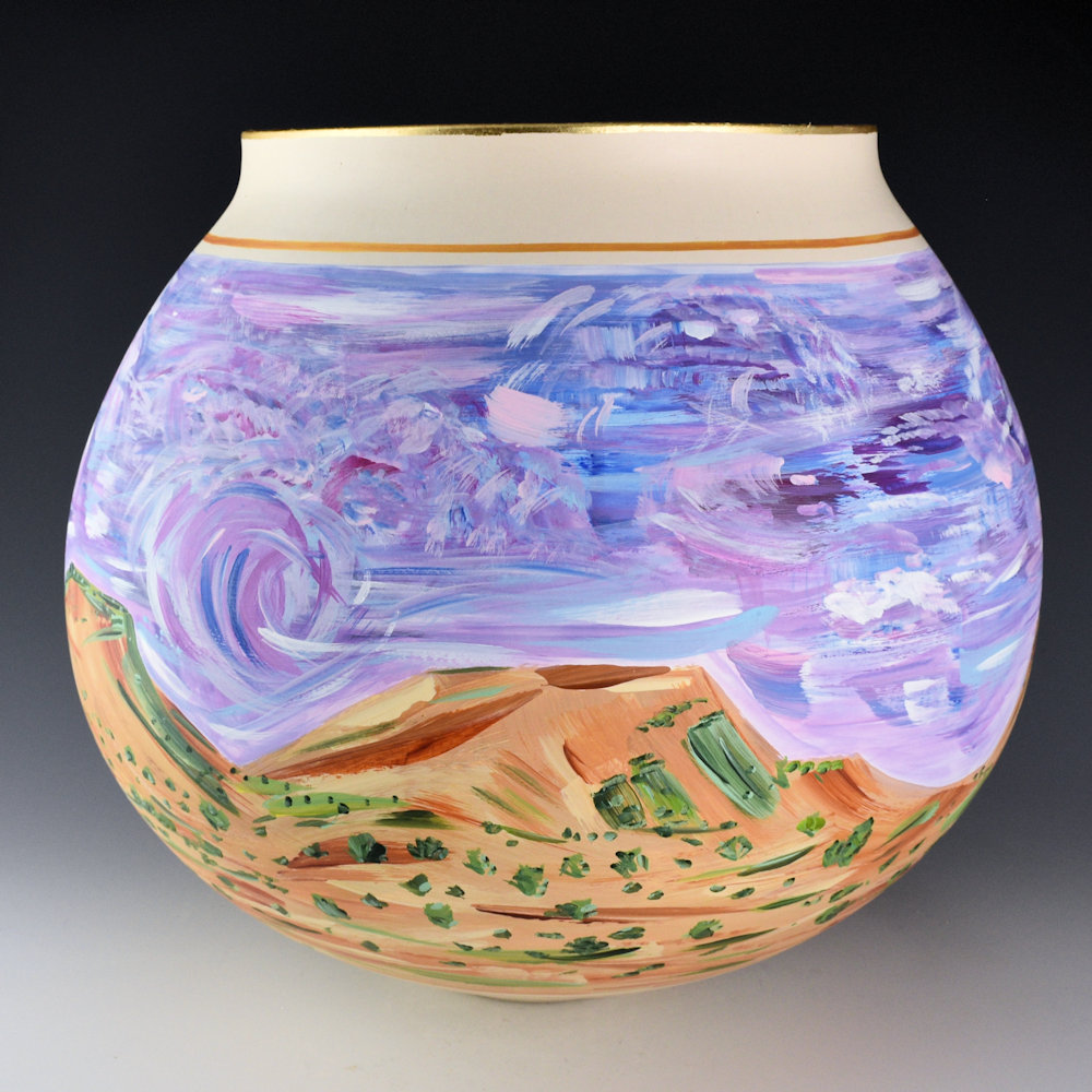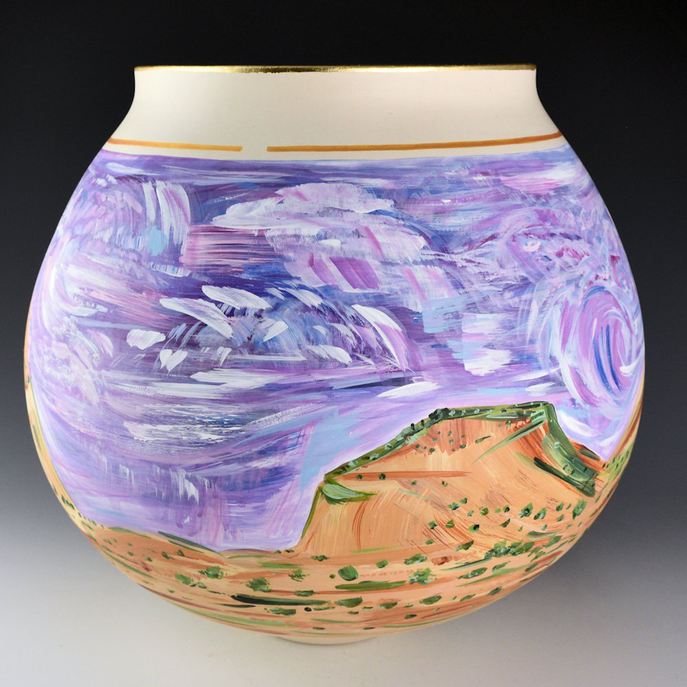Santiago Romero is the son of noted Cochiti potter Diego Romero and nephew of Mateo Romero. In the past, he made figurative clay coyotes and smaller vessels. He is also known for his oil paintings. This jar is coil-built and has a round shape and turned out rim. The jar was fired and then painted. The jar is entitled, “Sunset Skies”. The jar has a striking purple hued sky and colorful mesas. The rim and the inside rim have gold leafing. The jar is a creative departure from his paintings on canvas. It is signed on the bottom. It is exciting to see a new generation of Cochiti potters creating new stories in clay!