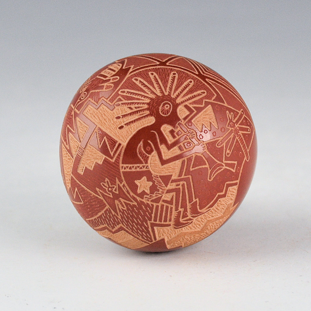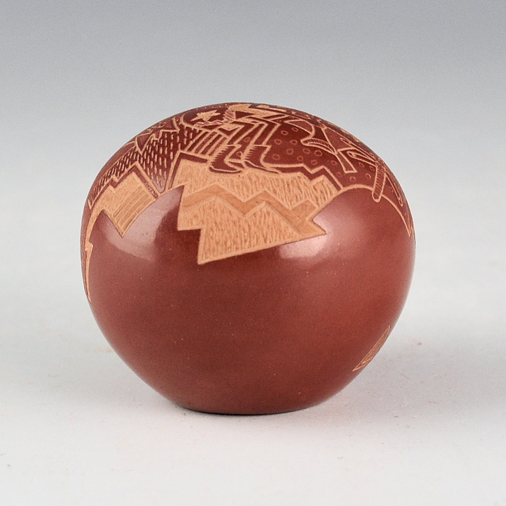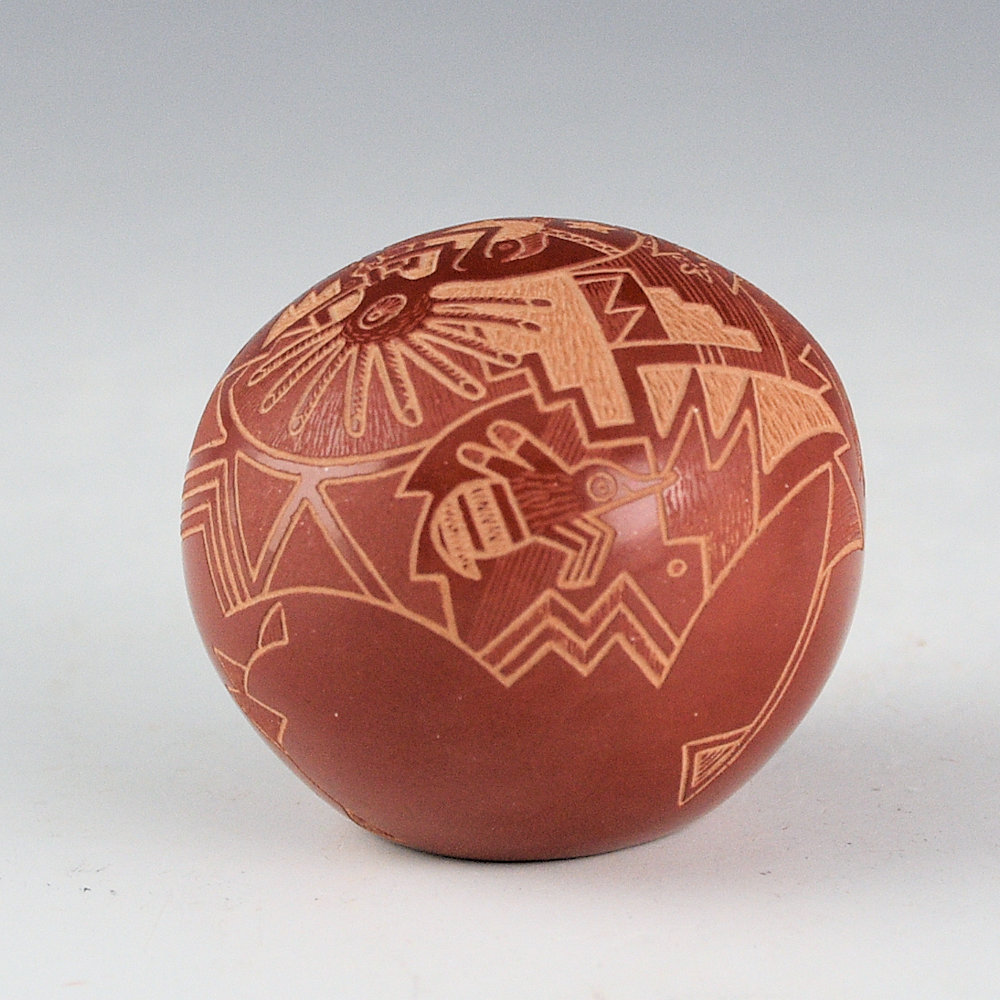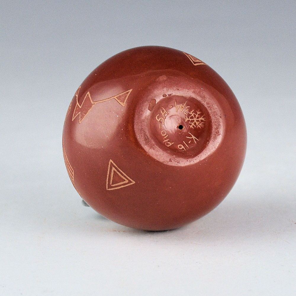 Susan “Snowflake” Romero’s pottery is highly polished and intricately etched with detailed imagery. Many of her skills are ones that she learned from her father, Joseph Lonewolf. This seedpot is fully polished and fully designed. On the top is a flute player. Joseph would use name the flute player on this pieces, “Calling the Creatures”. The flute player here is calling a dragonfly, bee, and butterfly. The piece is highly polished and etched on various levels. Note the various colorations, as Susan often etches just the polished area away to reveal the matte red, and going deeper, there is the tan of the clay. It is very complicated and time-consuming to etch in this manner! However, the results are exceptional. The piece is signed on the bottom in the clay with her Tewa name, “Pho-sa-We”. It is in excellent condition with no chips, cracks, restoration or repair.