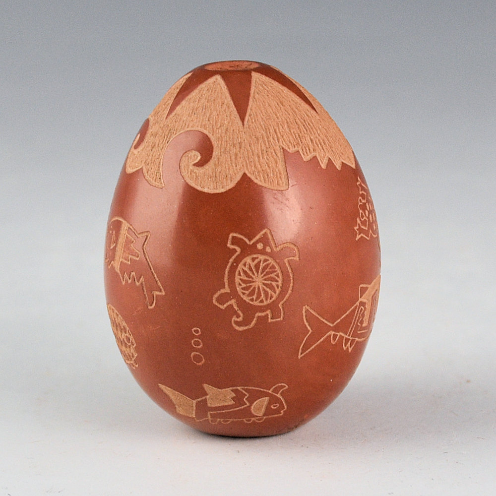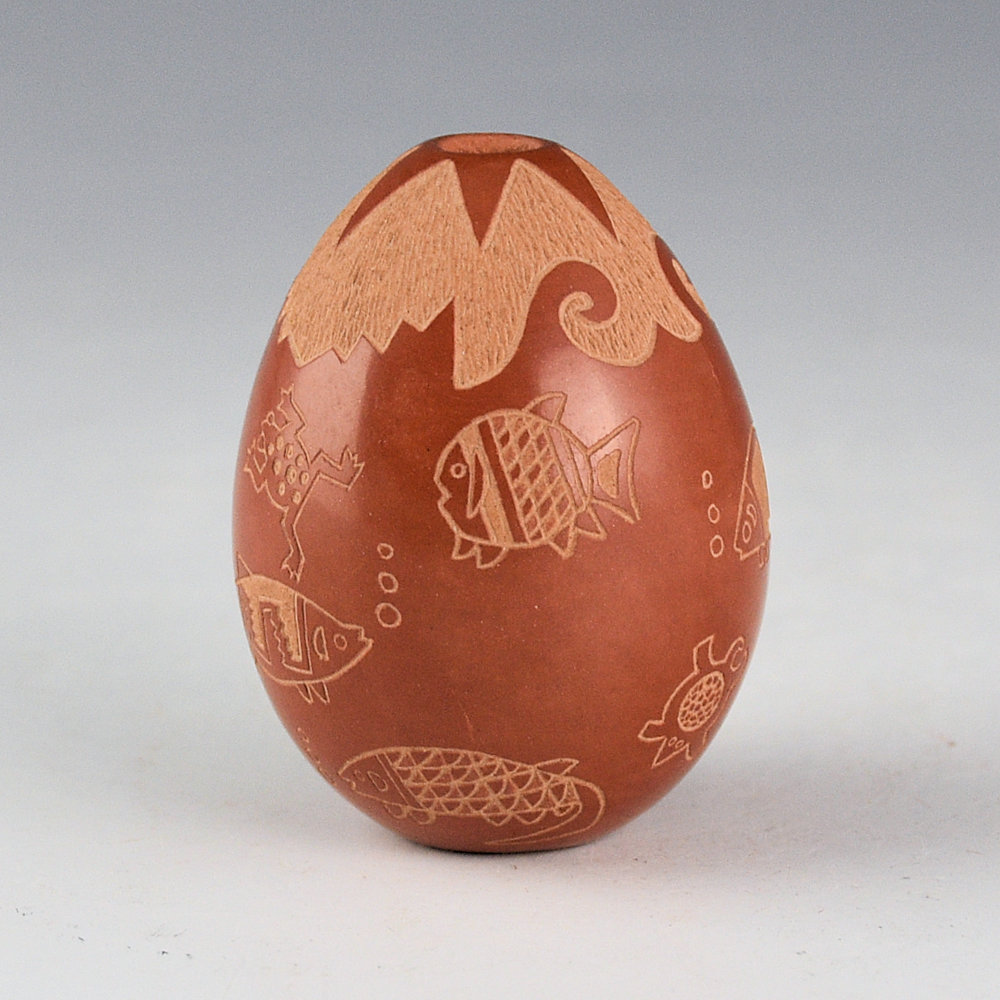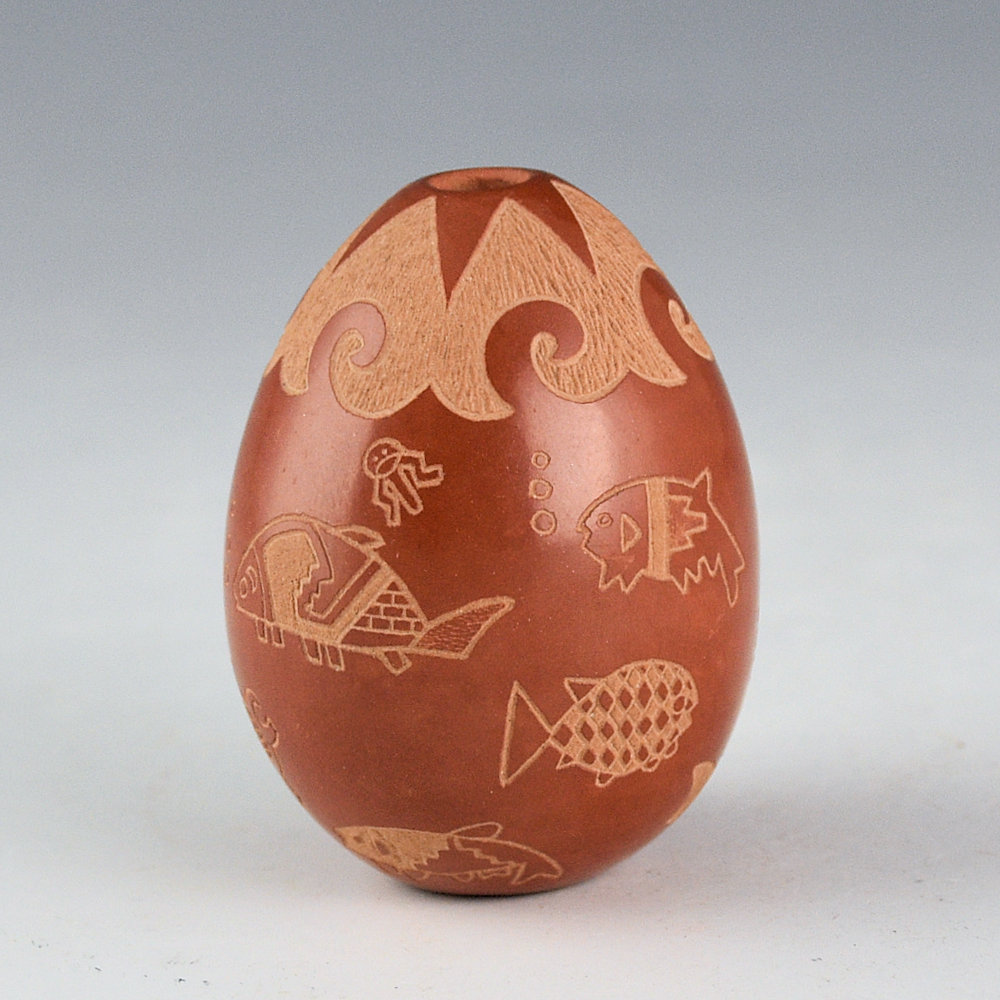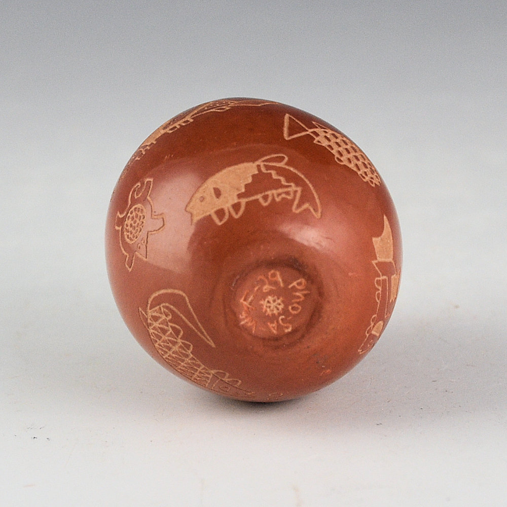 Susan “Snowflake” Romero’s pottery is highly polished and intricately etched with detailed imagery. Many of her skills are ones that she learned from her father, Joseph Lonewolf. This seedpot is fully polished and fully designed. On the top is a star and below are waves. Etched below the waves are fish, frogs, turtles, and even a tadpole! It is a charming piece with a lot of varied designs. The piece is signed on the bottom in the clay with her Tewa name, “Pho-sa-We”. It is in excellent condition with no chips, cracks, restoration or repair.