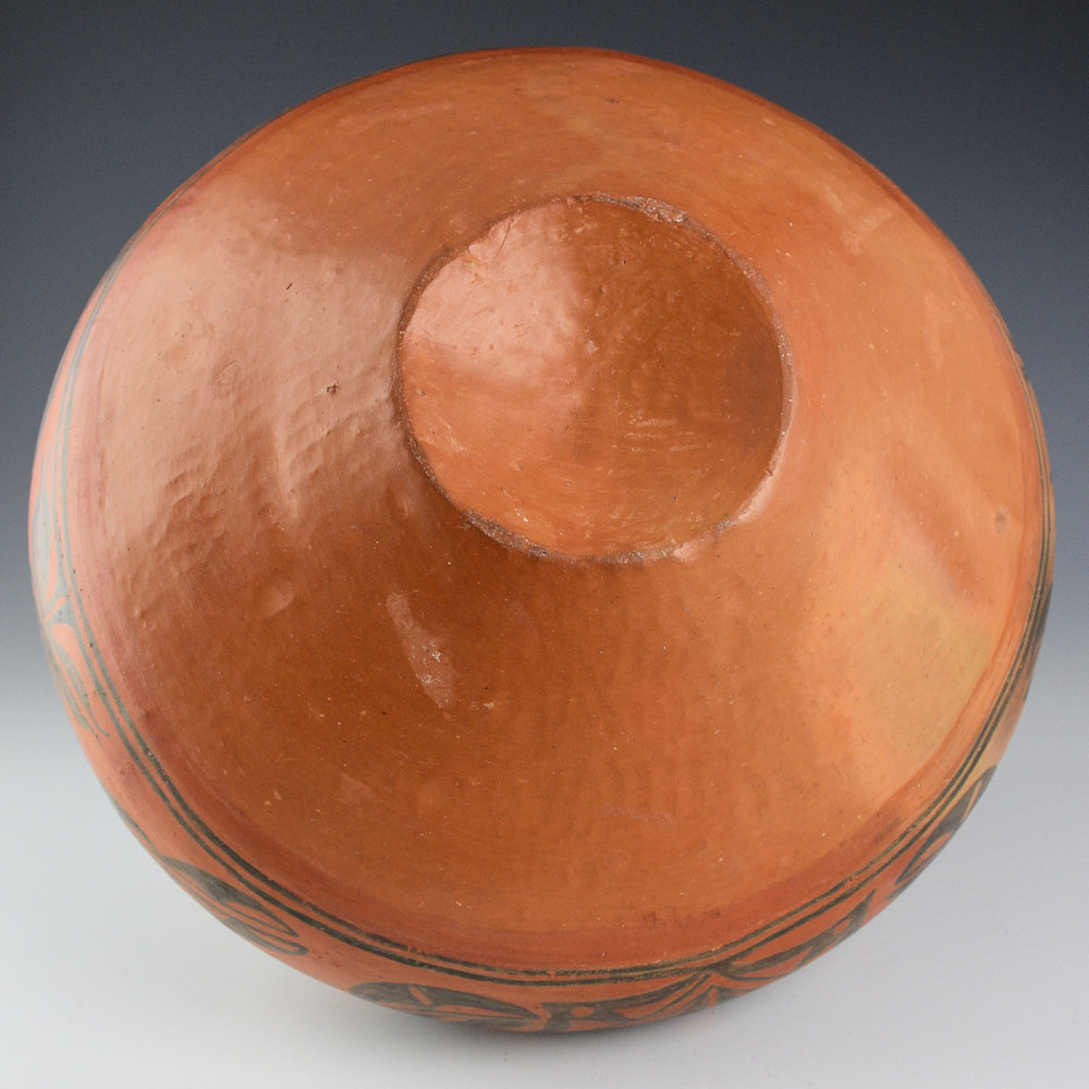 Tonita Roybal (1892–1945) was a daughter of noted potter Dominguita Pino. Tonita became as well known as her mother, first for her black-on-red pottery and later for her polychrome vessels. Tonita’s brother, Crescencio Martinez (1879–1918), and her first husband, Alfredo Montoya (1892–1913), were both sought after for their exquisite and creative painting. It may well be that their creativity opened the door for Tonita, as she painted her pieces from the mid-1910s through about 1925, when her second husband, Juan Cruz Roybal, began to more consistently paint the exterior of her pottery. This jar is has a round body and short neck. It is shape that creates a lot of space for painted designs. The jar was painted by Tonita’s brother, Cresencio. It is a complex and fluid series of designs. It is in very good condition with no cracks, restoration, or repair.