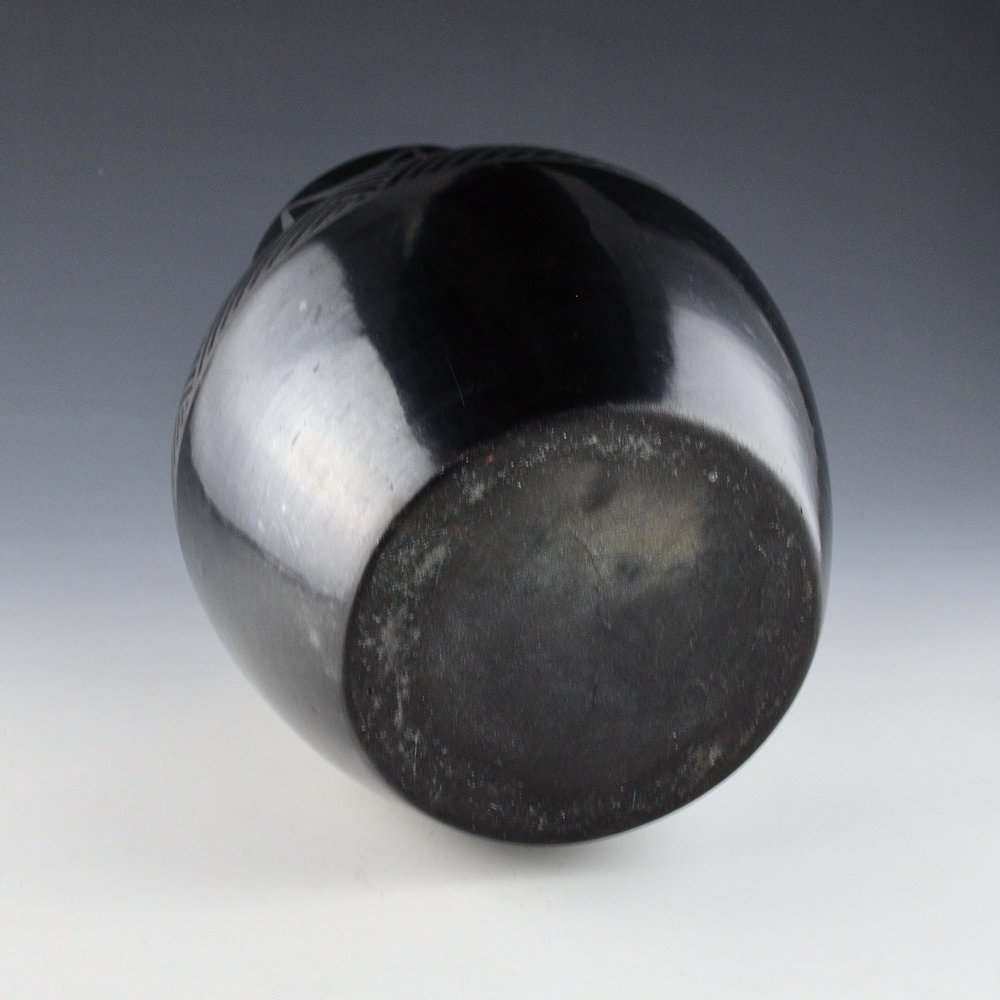 Tonita Roybal remains one of the great innovative names in San Ildefonso pottery. This is one of her classic shapes with a high shoulder and elongated neck. The entire surface is fully polished and then painted before firing. The shoulder is painted with a fine-line rain design, which is iconic for the work of Juan Cruz. The neck of the jar has cloud and mountain designs. The jar was fired to a glassy black, which makes the painted designs even stronger. It is in nearly-excellent condition with no chips, cracks, restoration, or repair. It is signed, “Tonita + Juan” in the clay on the bottom. The signature and style of painting indicate it is from the early 1930s.
