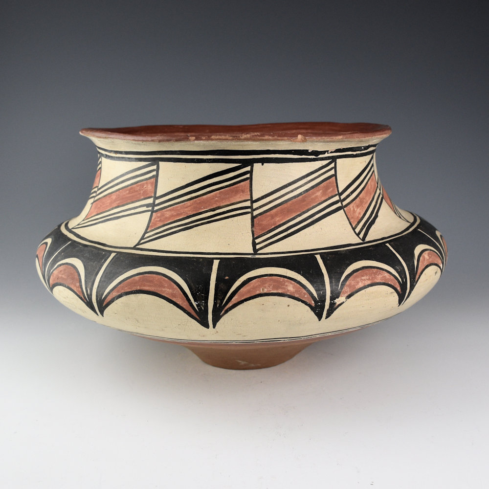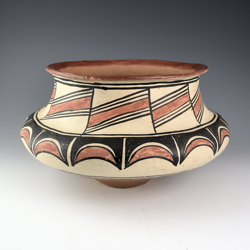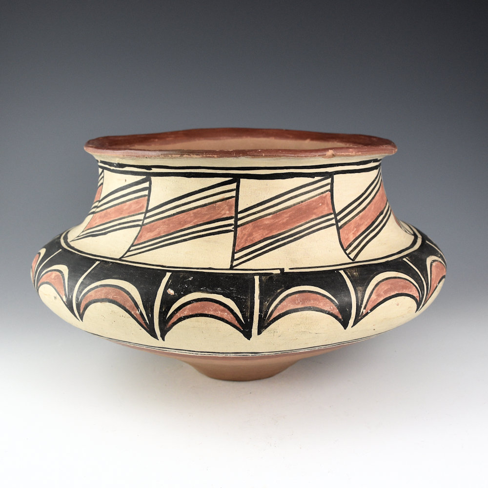 Tonita Roybal (1892–1945) was a daughter of noted potter Dominguita Pino. Tonita became as well known as her mother, first for her black-on-red pottery and later for her polychrome vessels. Tonita’s brother, Crescencio Martinez (1879–1918), and her first husband, Alfredo Montoya (1892–1913), were both sought after for their exquisite and creative painting. It may well be that their creativity opened the door for Tonita, as she painted her pieces from the mid-1910s through about 1925, when her second husband, Juan Cruz Roybal, began to more consistently paint the exterior of her pottery. This jar is a variation of her mother’s wide shoulder shape. The narrow base, wide shoulder, and turned-out rim, are all in proportion and amazing stability! It is painted to accentuate the shape of the jar. It is in very good condition with no cracks, restoration, or repair.