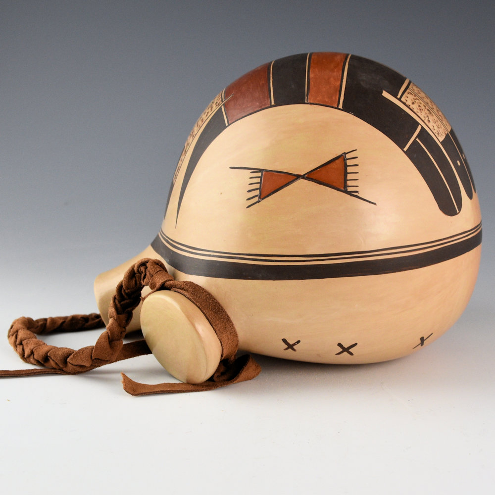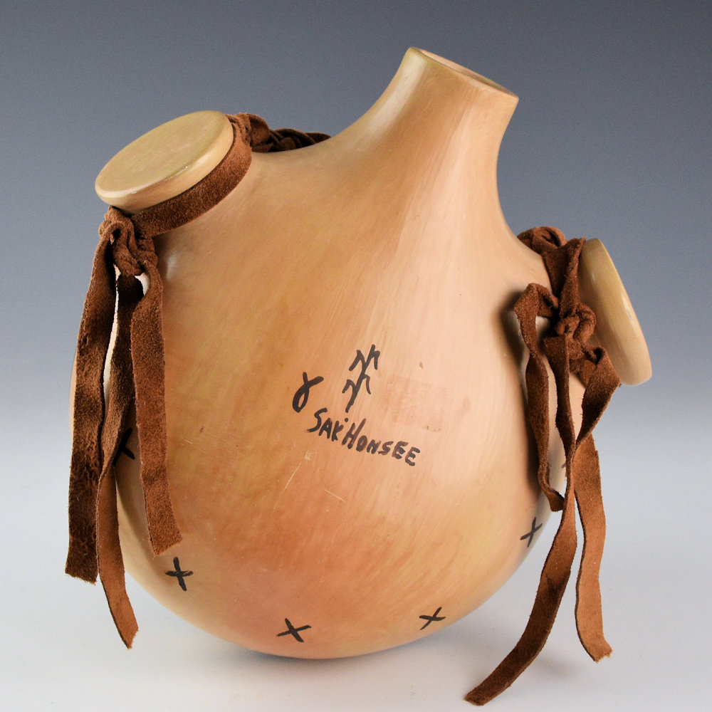 Jean Sahme was a daughter of noted potter Priscilla Nampeyo and a descendant of Nampeyo of Hano. This canteen is a classic Hopi-Tewa shape with a round front and rounded “lug” handles. The entire piece is fully polished. The front section has a double eagle tail design. It is painted with bee-weed and tail extend upward and downward. It is highlighted with polished red and orange areas. It is creative version of a classic design. The canteen was traditionally fired which created blushes on the surface. It is signed on the back with her hallmark fish, corn plant for corn clan and “Sak’Honsee”. It is in excellent condition with no chips, cracks, restoration, or repair.