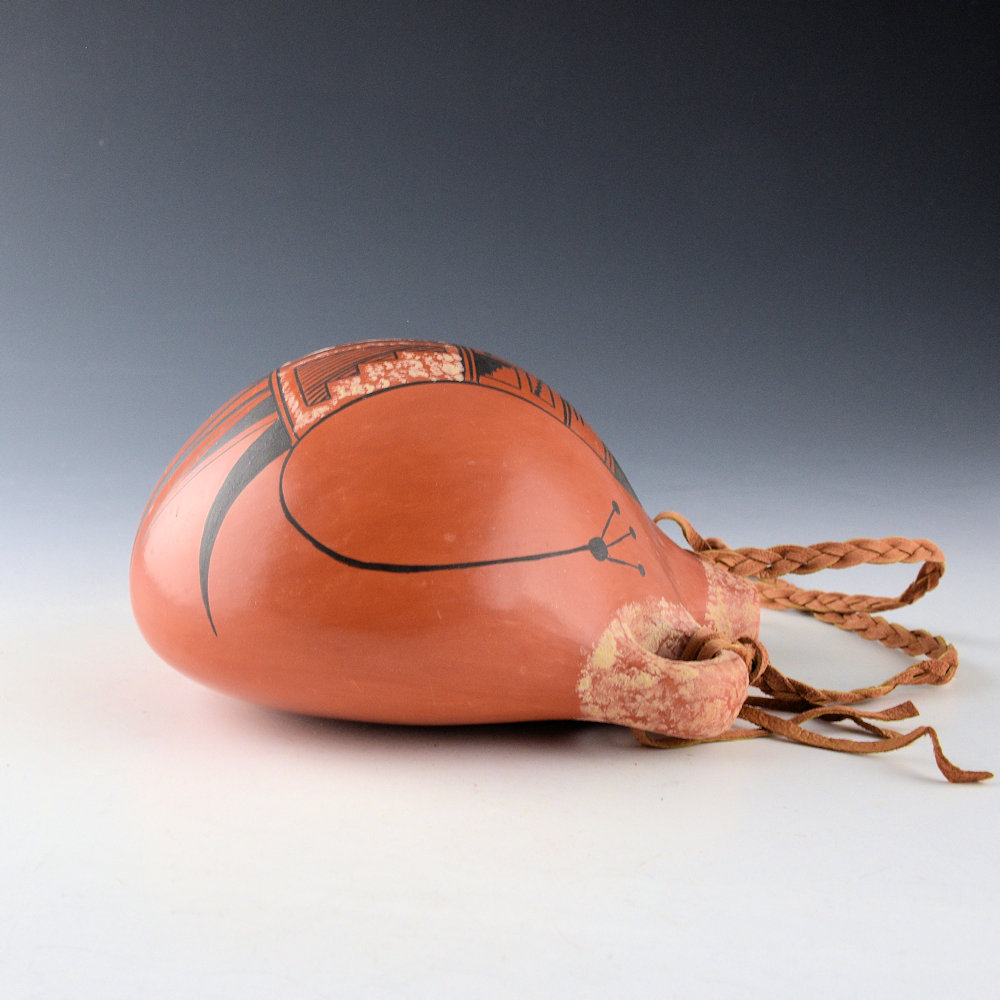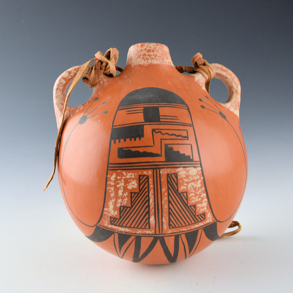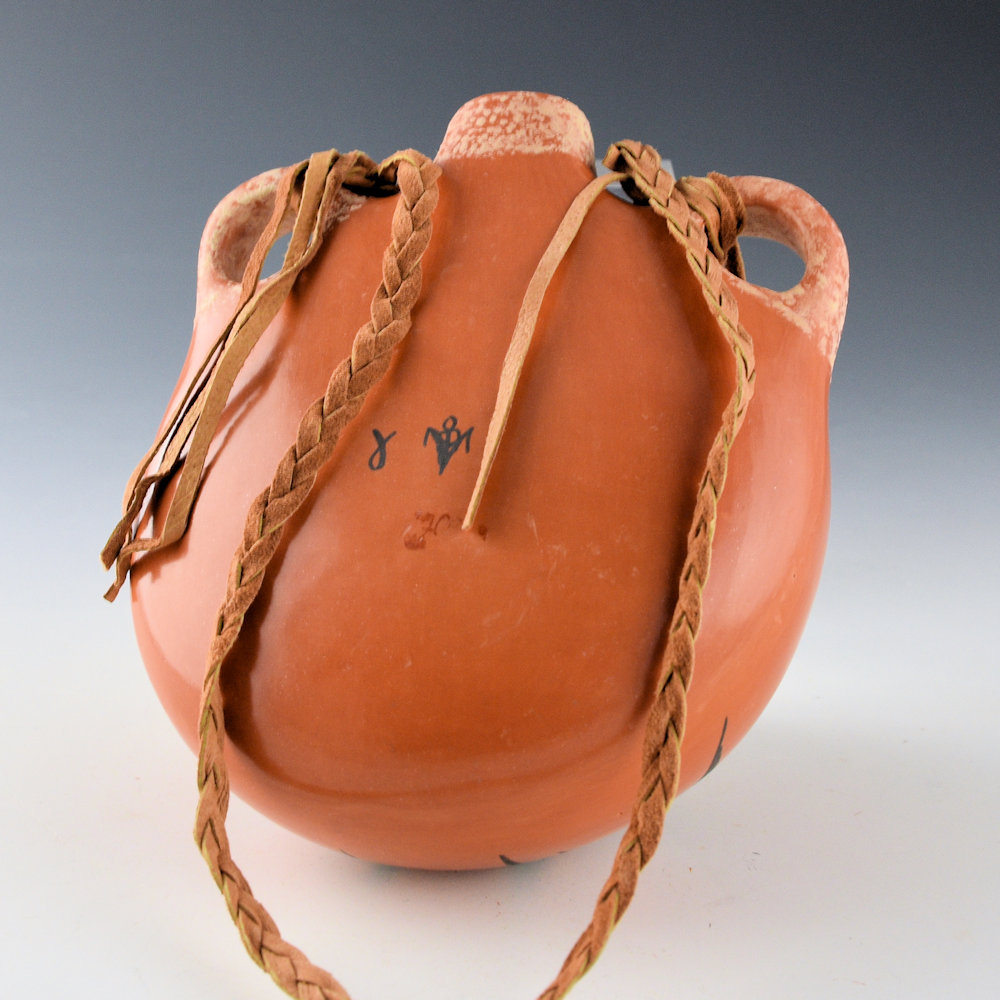 Jean Sahme is a daughter of noted potter Priscilla Nampeyo and a descendant of Nampeyo of Hano. This canteen is a classic Hopi-Tewa shape with a round front and rounded handles. The entire piece is fully polished. The front section is painted with a classic spider design using bee-weed. It is highlighted with white clay in a mottled style. The spout and handles are also slipped with mottled white clay. It is signed on the back with her hallmark fish, corn plant for corn clan. It is in excellent condition with no chips, cracks, restoration, or repair.