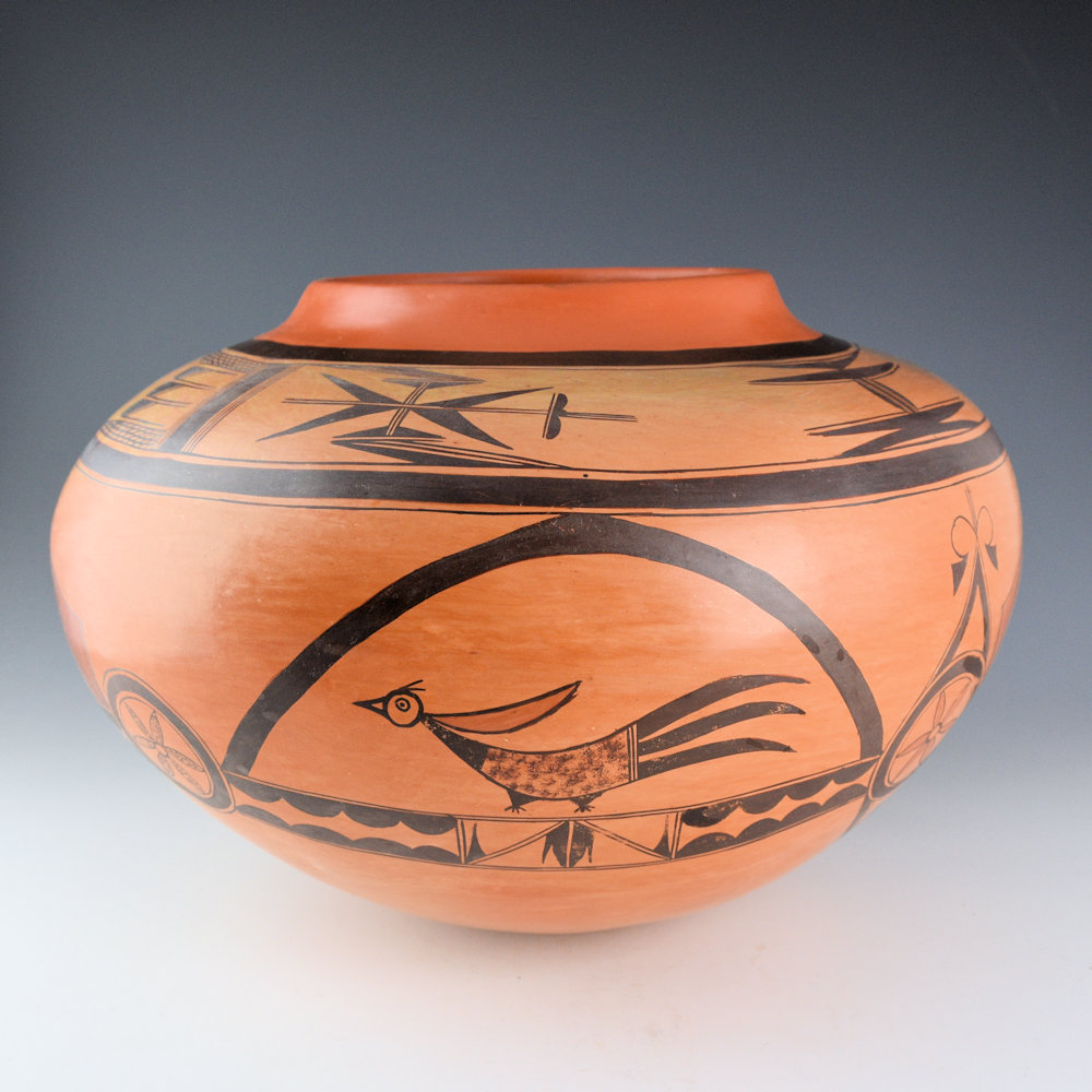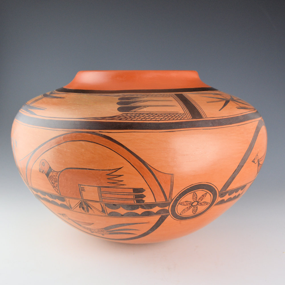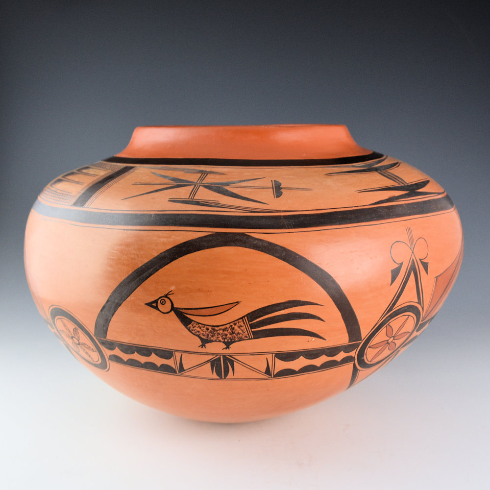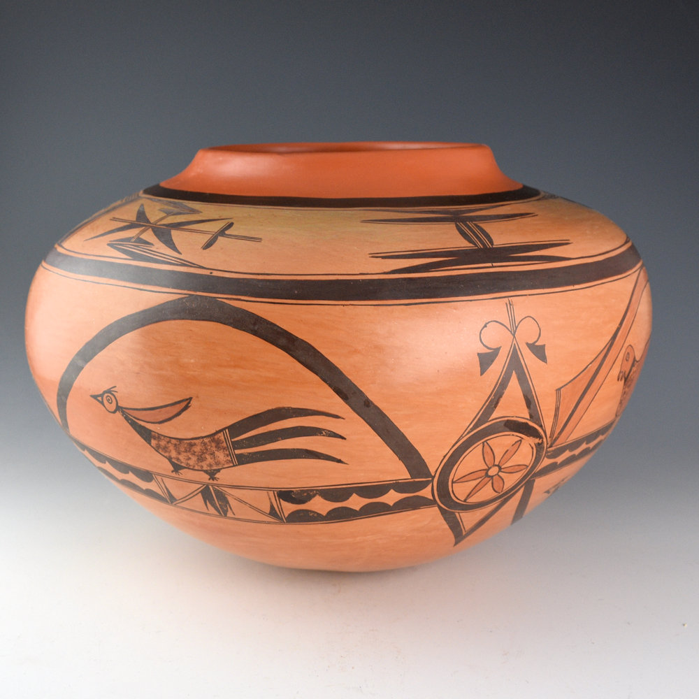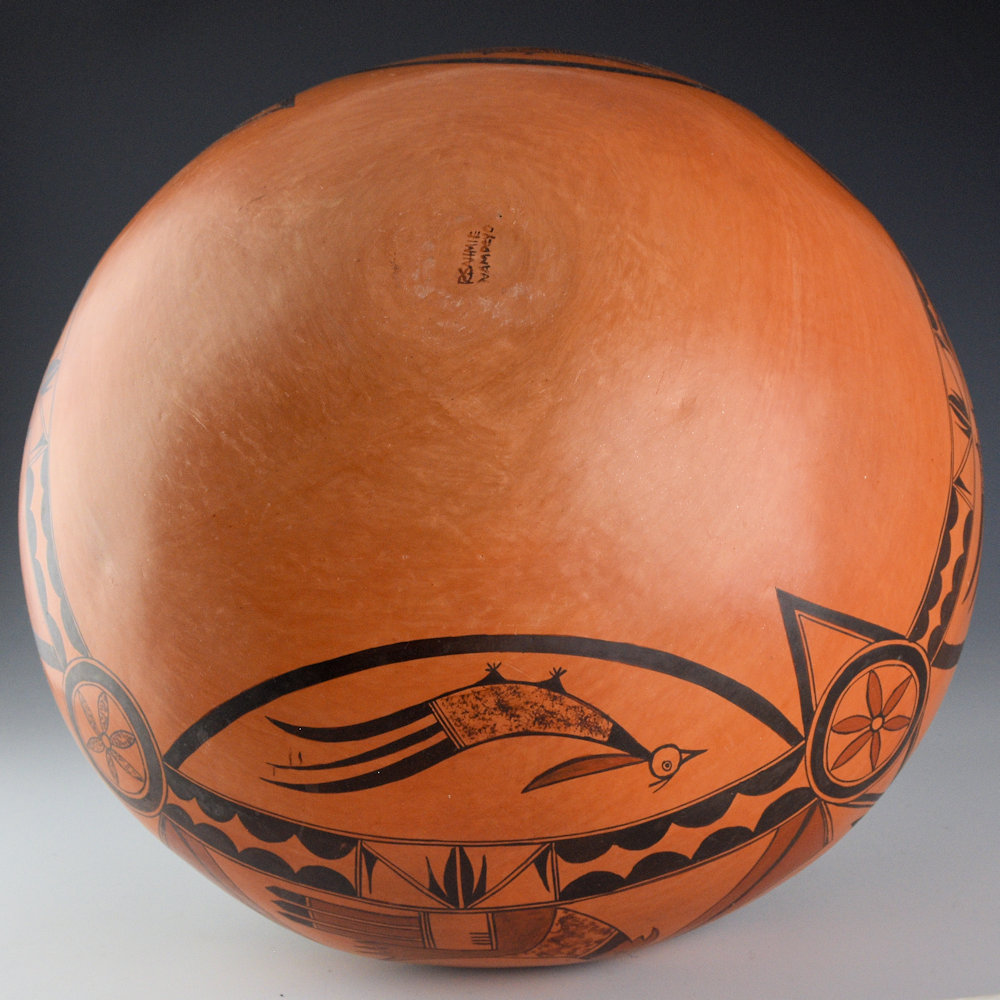 This is an exceptional jar by Rachel Sahmie. She was a daughter of noted potter Priscilla Nampeyo and a descendant of Nampeyo of Hano. She was a sister of noted potters Jean Sahmie, and Bonnie Sahmie. This jar has a high, round shoulder and short neck. The neck is polished with red clay. Above the shoulder, there are cloud and bird wing designs. On the sides of the jar there are birds and flowers. There is a rainbow design that runs across the entire jar. It is a very unusual and complicated design. The jar was traditionally fired to create the blushes on the surface. It is signed, “R Sahmie” and it is in very good condition with no chips, cracks, restoration, or repair.