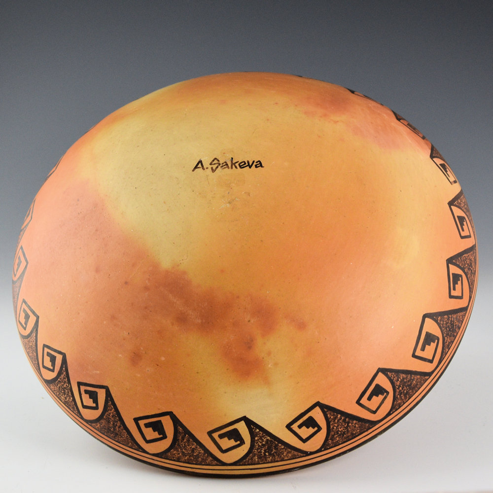 Alfonso Sakeva (b. 1952) is the husband of Vernida Sakeva and the son of Beth Sakeva. This is the only piece of his work we have had in the gallery. It is an open bowl made from Hopi clay and painted with bee-weed (black). It is a very tightly painted Shalako Katsina. Note the ears of corn as part of the tablita! Beautiful painting! The outside rim has a cloud designs. It was traditionally fired. It is signed, “A. Sakeva”. It is in excellent condition with no chips, cracks, restoration or repair.