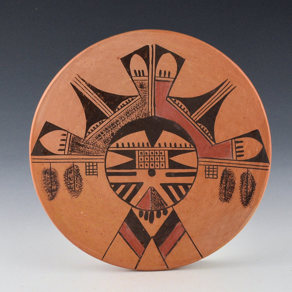 This round tile is made from native clay, stone polished and painted with bee-weed. The design is a shalako katsina. It is signed on the back, “Beth Sakeva”. It is in excellent condition with no chips, cracks, restoration or repair. It is definitely a piece of Hopi-Tewa history!