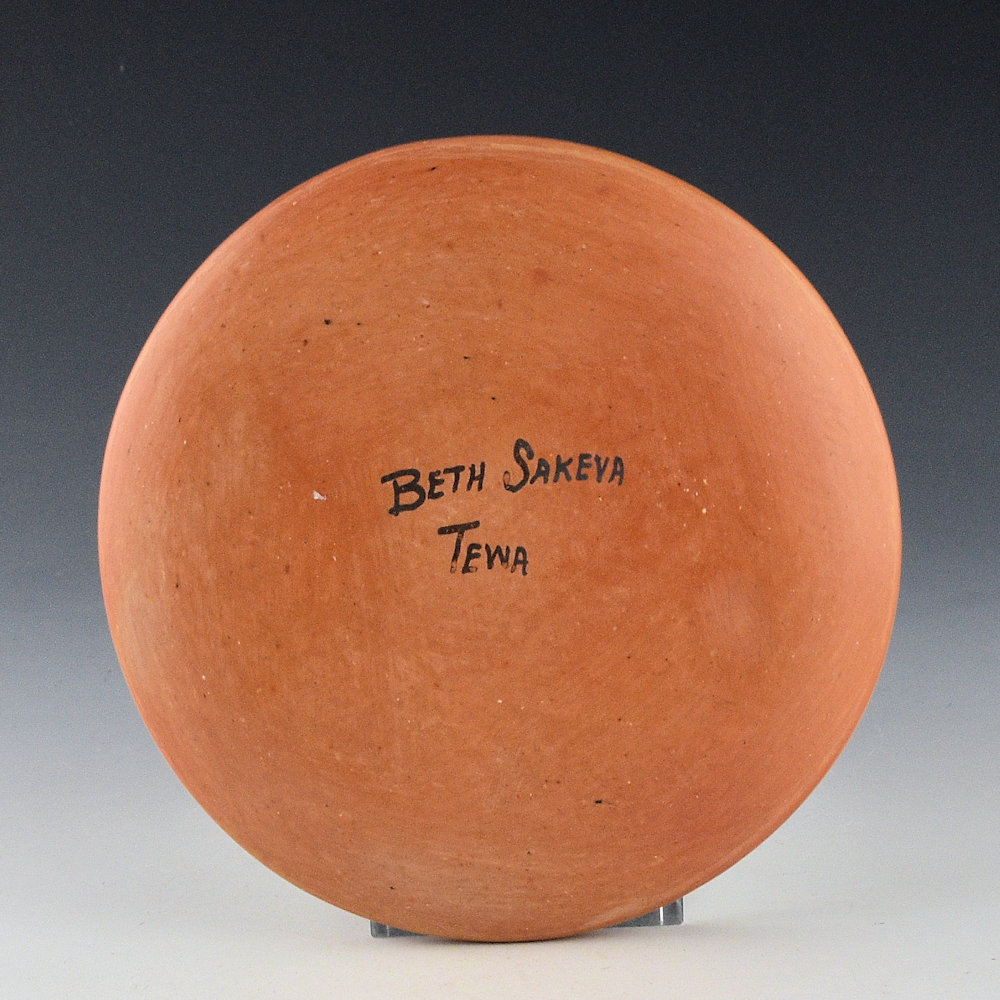 Beth Sakeva was a fascinating Hopi-Tewa potter active in the 1970s-80s. She was a niece of Lena Charlie and the sister of Kenneth Shupla (the husband of Santa Clara potter Helen Shupla). However, she was probably best known for teaching Rondina Huma to make pottery. Rondina said of Beth:
