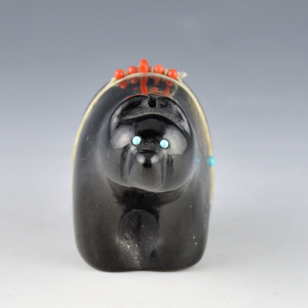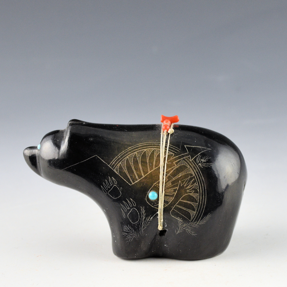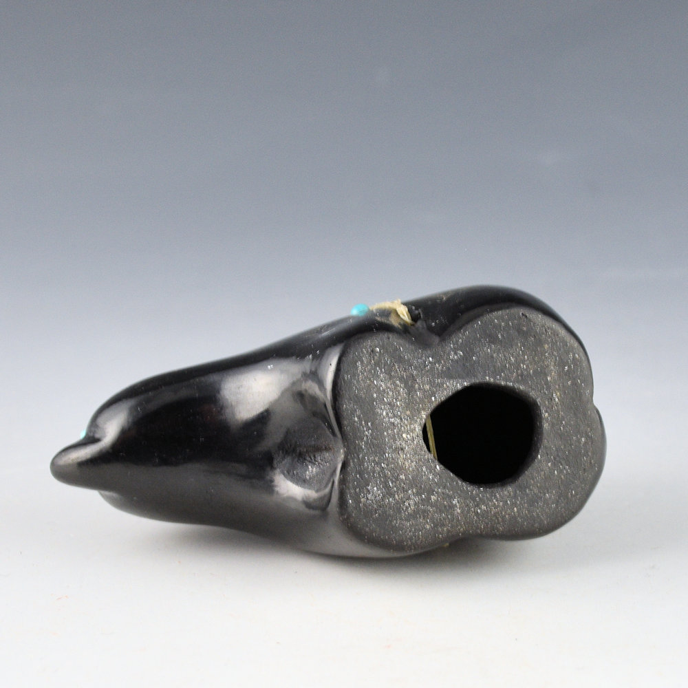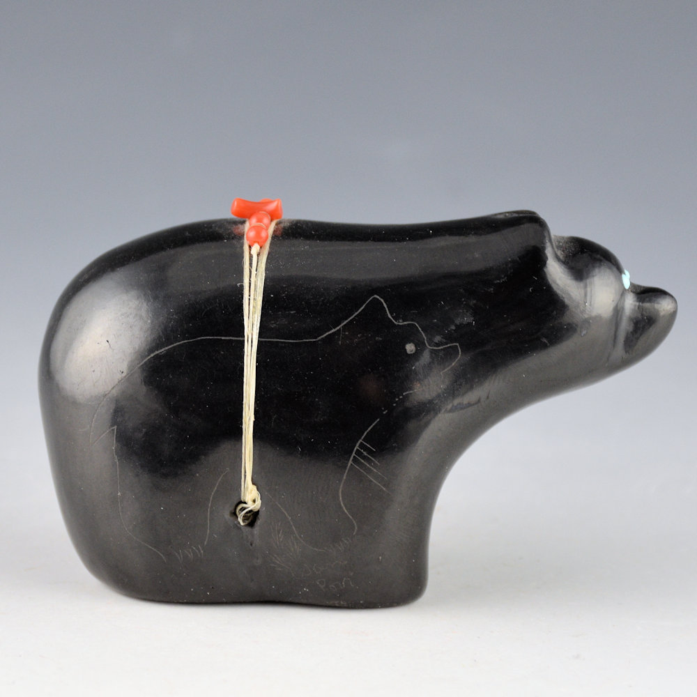 This is a complex jar by Kathy “Wan Povi” Sanchez (b. 1950).  Kathy is a great-great-granddaughter of Maria Martinez and a sister of Barbara Gonzales.  This is a clay bear.  It is fully polished and etched on one side with a bear and the other with bear paws and a feather pattern.  The feather side was two-toned sienna after the firing.  There are turquoise insets for the eyes and on the side of the bear.  There is a bundle across the back with coral.  All the etching was done after the firing.  The bear is signed, “Wan Povi” on the bottom.  While Kathy makes little pottery today, the technical expertise of her shape, polish, and design is certainly evident.  The bear is in excellent condition with no chips, cracks, restoration or repair.